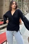 Kadın Siyah Kruvaze Yaka, Çapraz Bağlamalı, Flare Kollu, Salaş Müslin Bluz