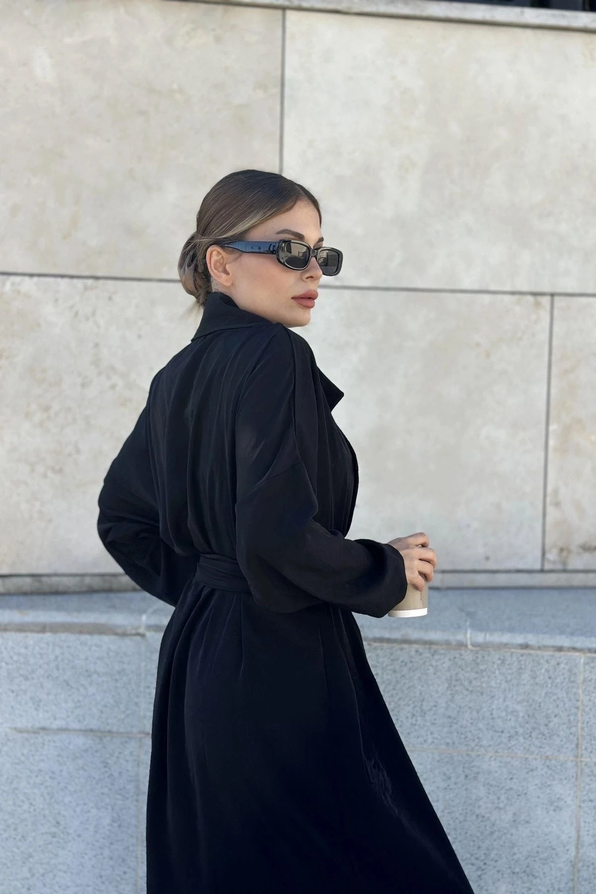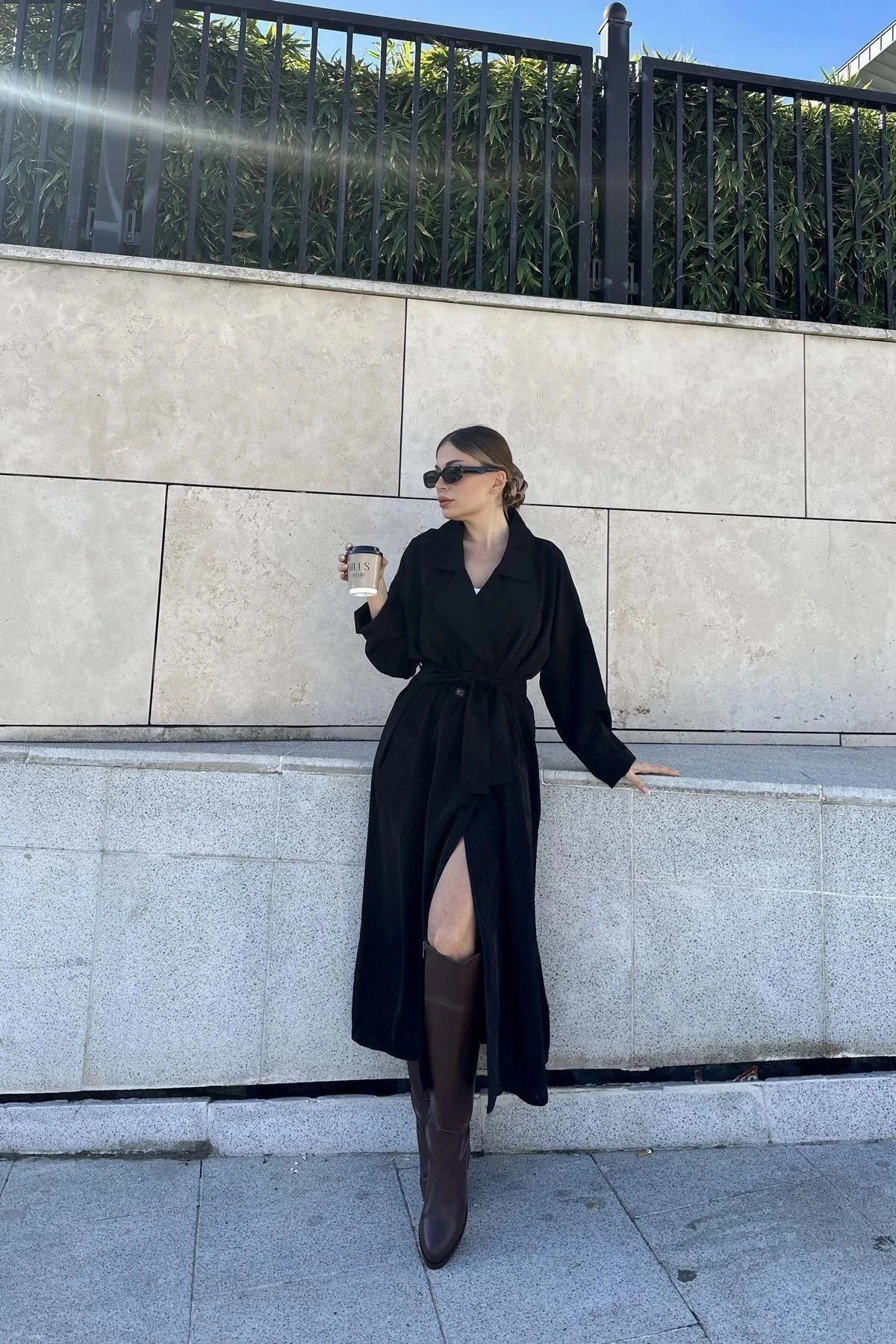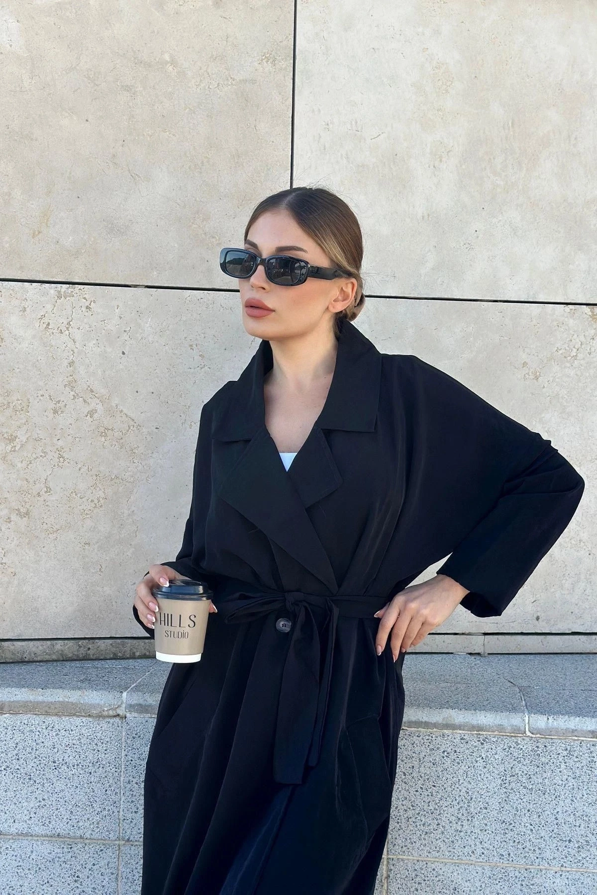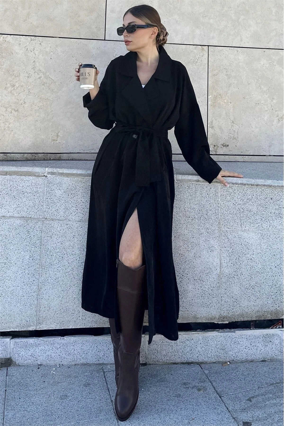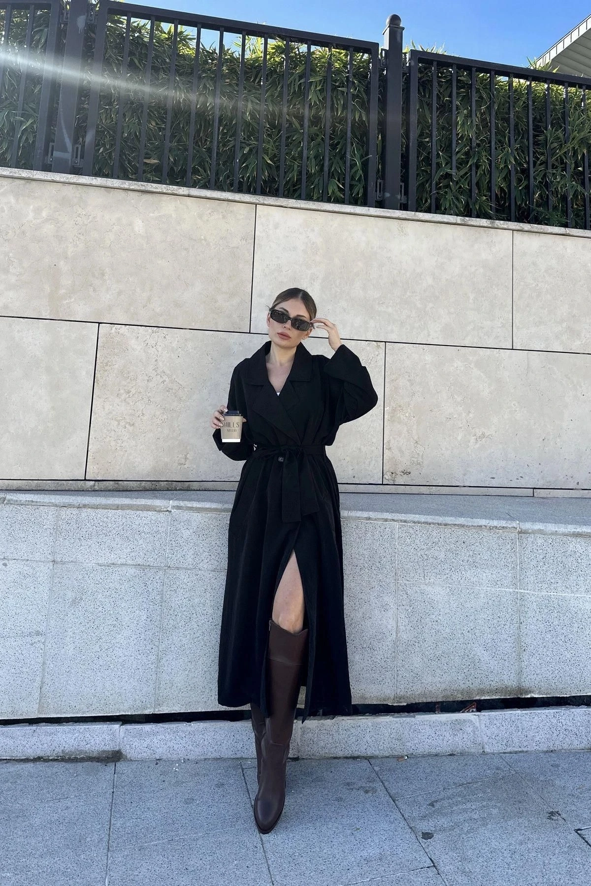 Kadın Siyah Kruvaze Yaka, Kemerli, Cepli, Salaş Kesim Uzun Trençkot