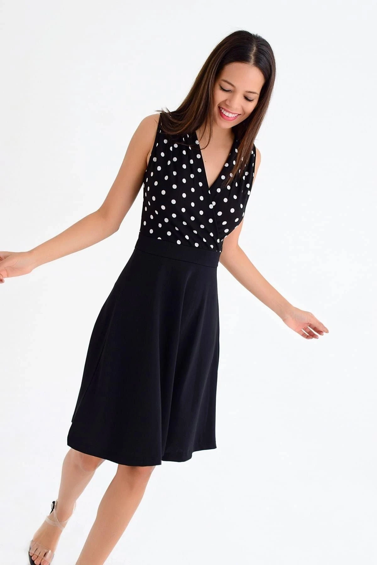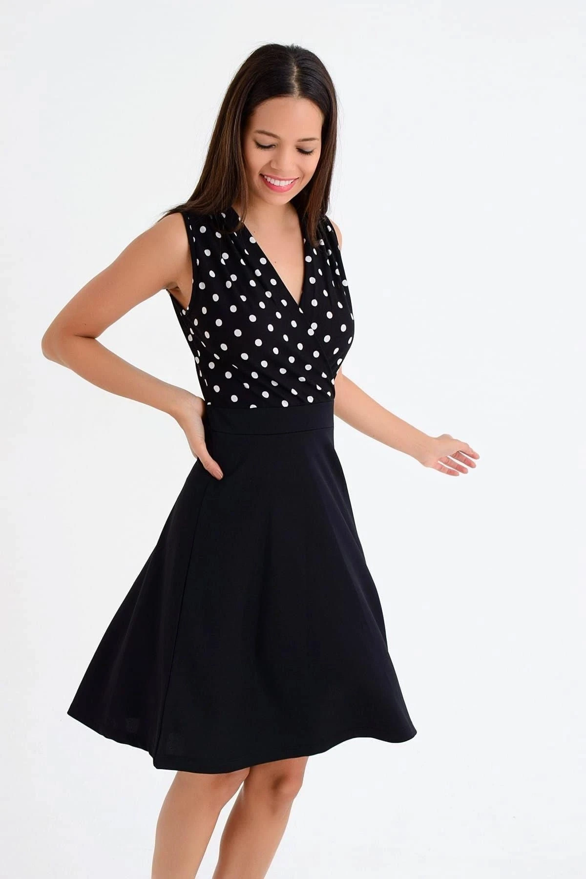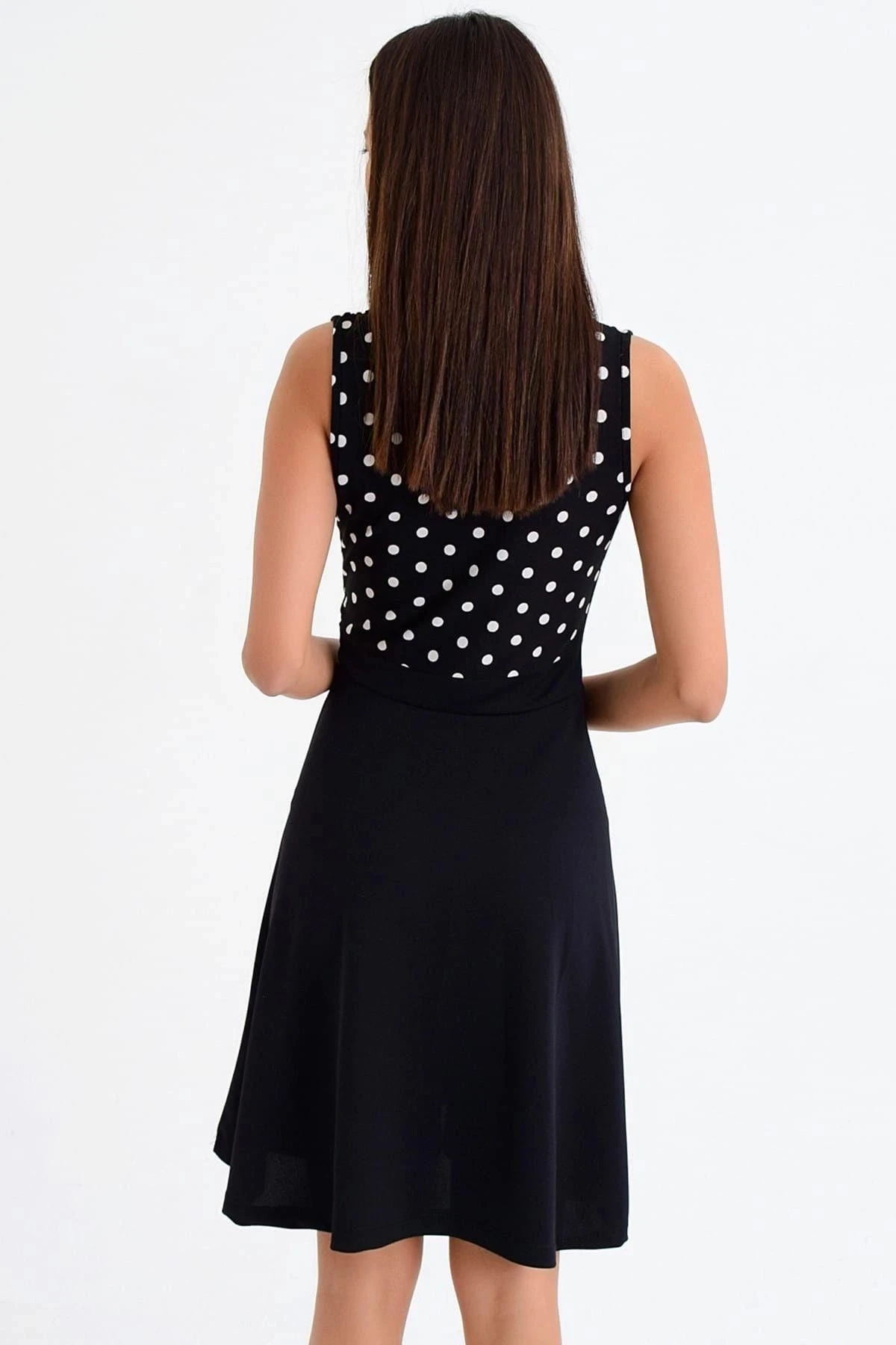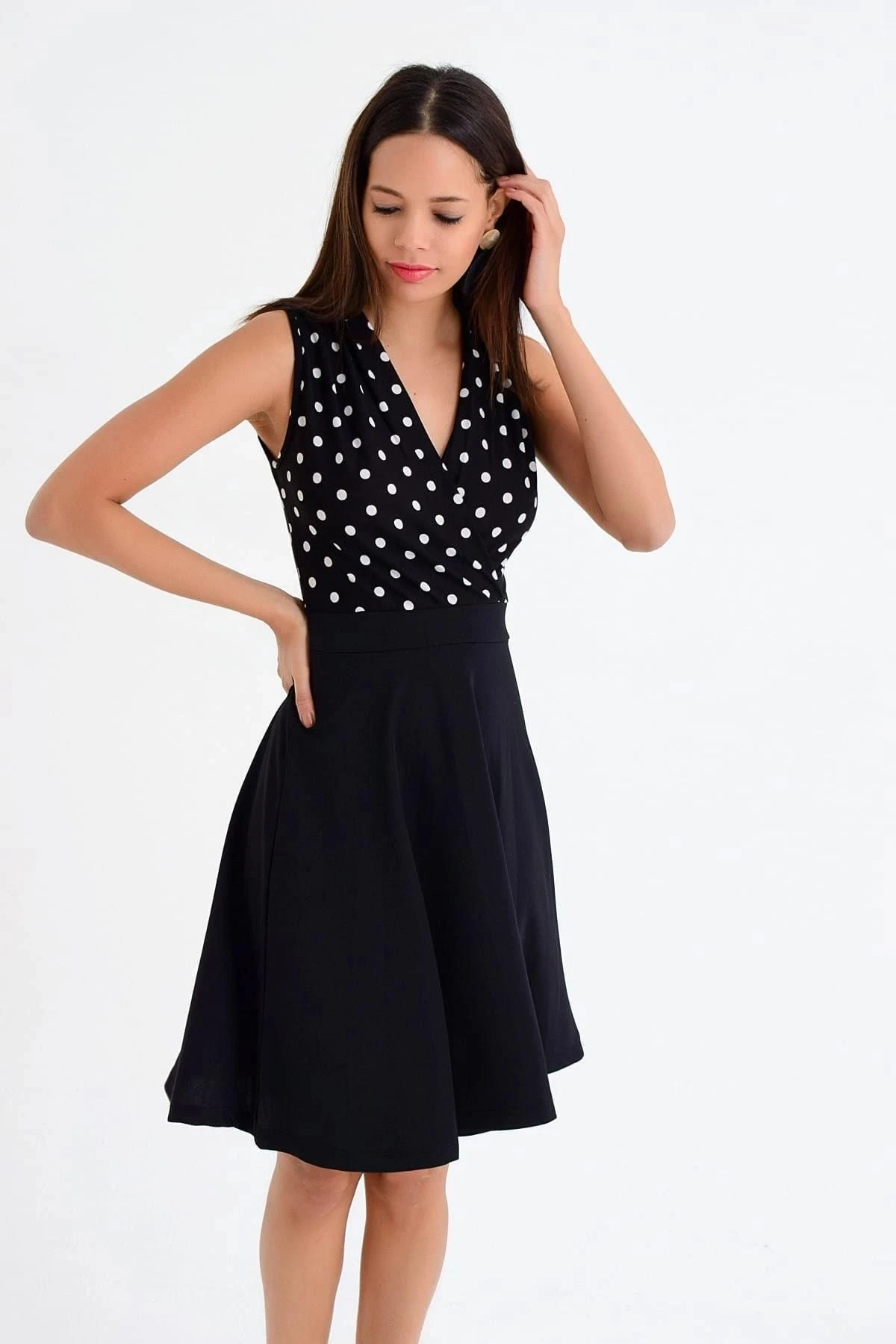 Kadın Siyah Kruvaze Yaka Sıfır Kol Eteği Kloş Puantiyeli Regular Kesim Midi Boy Diz üstü Elbise