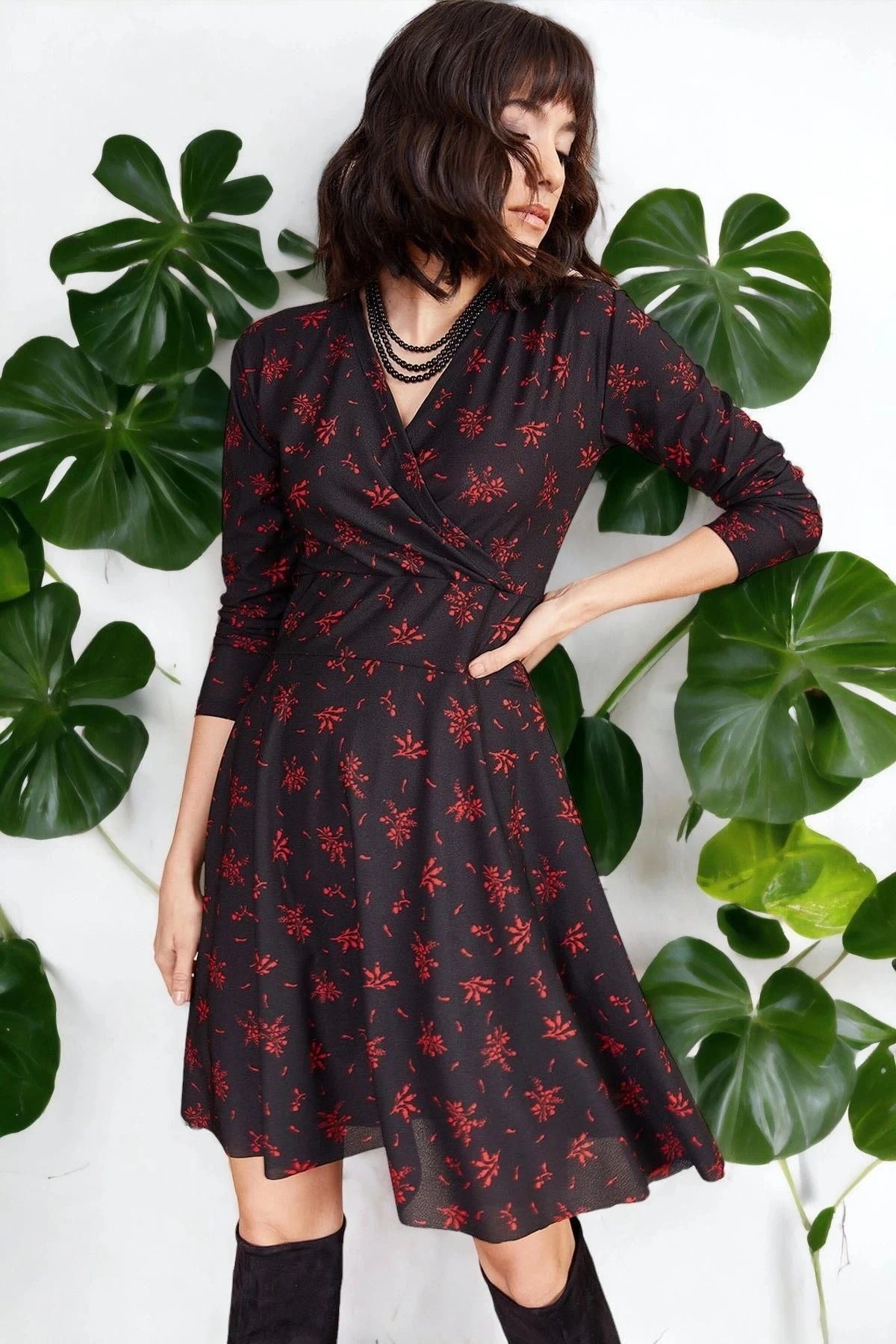 Bu siyah renkli, kruvaze yaka ve uzun kollu elbise, kaliteli kumaşından ve şık tasarımından ötürü göz kamaştırıyor.; Midi boyuyla diz üstünde tamamlanan bu elbise, ofis ortamında ve günlük kullanımda mükemmel bir tercih.; Bu elbisenin kumaşı %95 polyester ve %5 elastandan oluşuyor.; Polyester kumaş, dayanıklılığı ve kolay bakımıyla bilinirken, elastan ise esneklik ve hareket özgürlüğü sağlar.; Bu kombinasyon, rahat bir giyim deneyimi sunarken, elbisenin şeklini korumasına yardımcı olur.; Siyah rengi, her zaman şıklığı ve zarafeti temsil etmiştir.; Bu elbise, siyahın klasik ve zamansız çekiciliğini yansıtarak size sofistike bir görünüm kazandırır.; Kruvaze yaka ise bu tasarıma modern bir dokunuş katarken, uzun kolları ise elbiseye daha zarif bir hava katıyor.; Elbisenin deseni, zarif ve dikkat çekicidir.; Kesimleriyle vücuda hoş bir şekilde otururken, midi boyuyla da zarif bir denge sağlar.; Bu elbiseyi giydiğinizde hem iş ortamında profesyonel bir görünüm elde edebilir, hem de günlük hayatta stil sahibi olabilirsiniz.; Siz de şıklığı ve rahatlığı bir arada sunan bu kaliteli elbiseyle her ortamda farkınızı ortaya koyabilirsiniz.