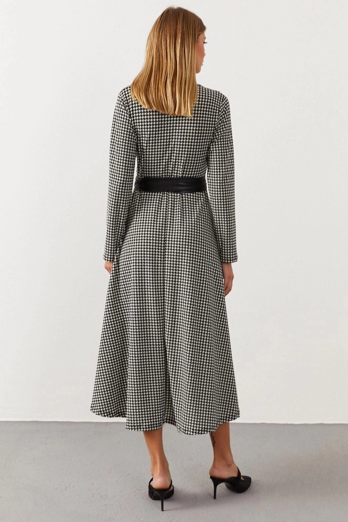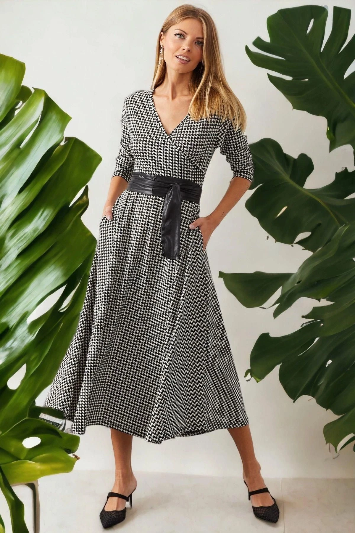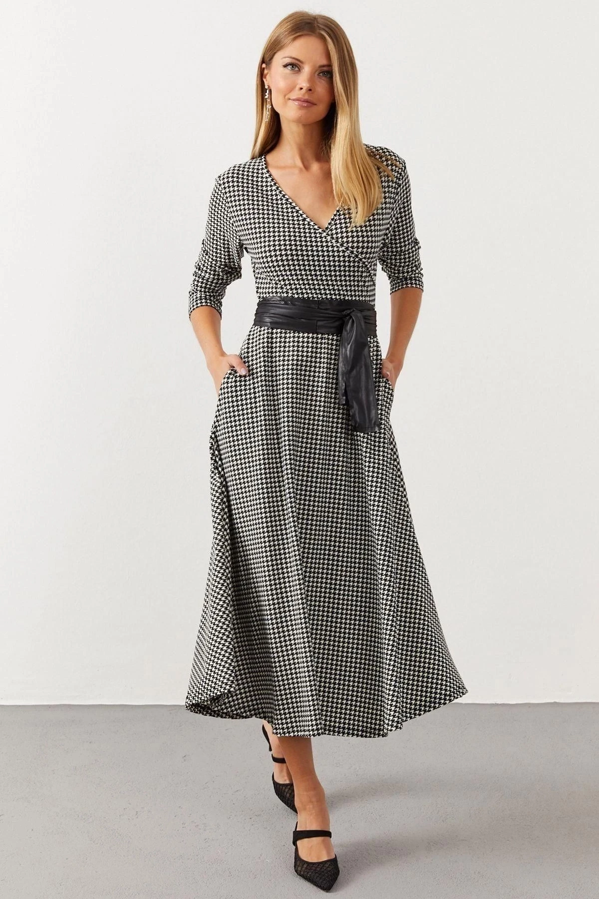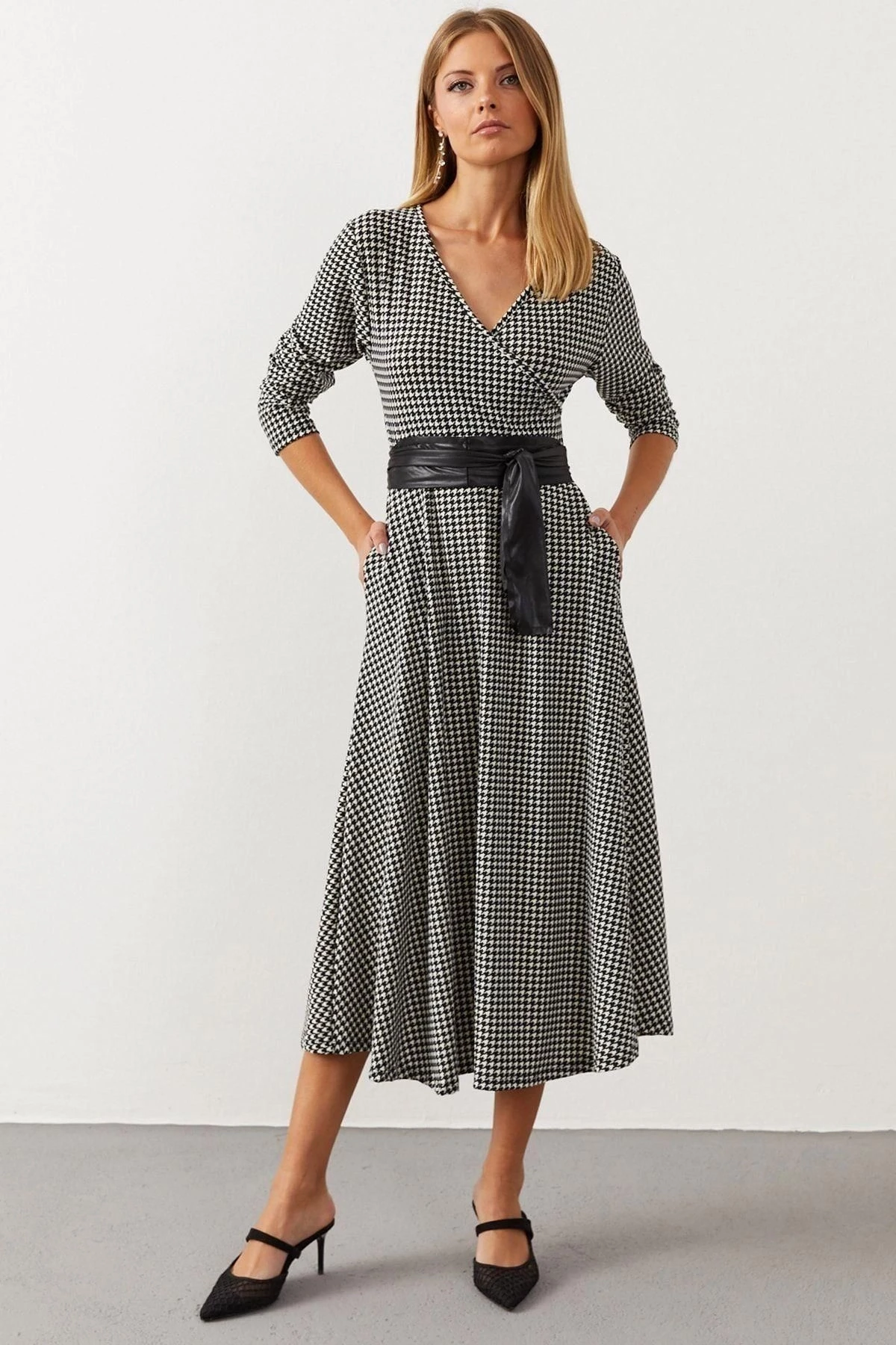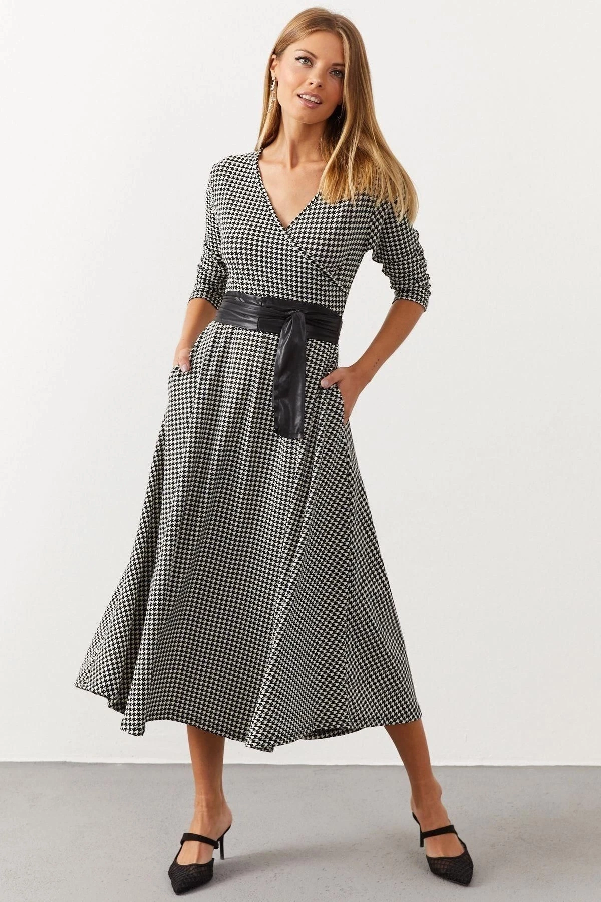 Bu özel tasarım, şıklığı ve rahatlığı bir araya getiren bir kruvaze yaka elbisedir.; Siyah renkteki elbise, her mevsimde ve her türlü etkinlikte mükemmel bir tercih olacaktır.; Elbisenin uzun kolları ve kloş kesimi, zarif ve feminen bir görünüm sunarken, kumaşının kalitesi de üst düzeydedir.; %95 polyester ve %5 elastan içeriği sayesinde, elbise rahatlıkla esneyerek vücudunuzun hatlarına uyum sağlar ve hareket özgürlüğü sunar.; Cep detayları, elbiseye şık bir dokunuş katarken, maksi boyu ise sizi uzun ve zarif bir silüetle tamamlar.; Bu elbise, günlük kullanıma uygun olup, birçok farklı stil ve kombinleme seçeneği sunar.; Siyah rengi, zamansız ve çok yönlüdür, dolayısıyla bu elbiseyi iş toplantılarından özel etkinliklere kadar her türlü durumda rahatlıkla giyebilirsiniz.; Üstelik kaliteli kumaşı sayesinde uzun süreli kullanımlarda bile formunu ve parlaklığını korur.; Bu muhteşem kruvaze yaka elbise, sadece şıklık arayanlar için değil, aynı zamanda konforu da önemseyenler için ideal bir seçenektir.; Tarzınızı ve kişiliğinizi yansıtmak için bu benzersiz tasarıma bir şans verin ve her ortamda göz kamaştırın.