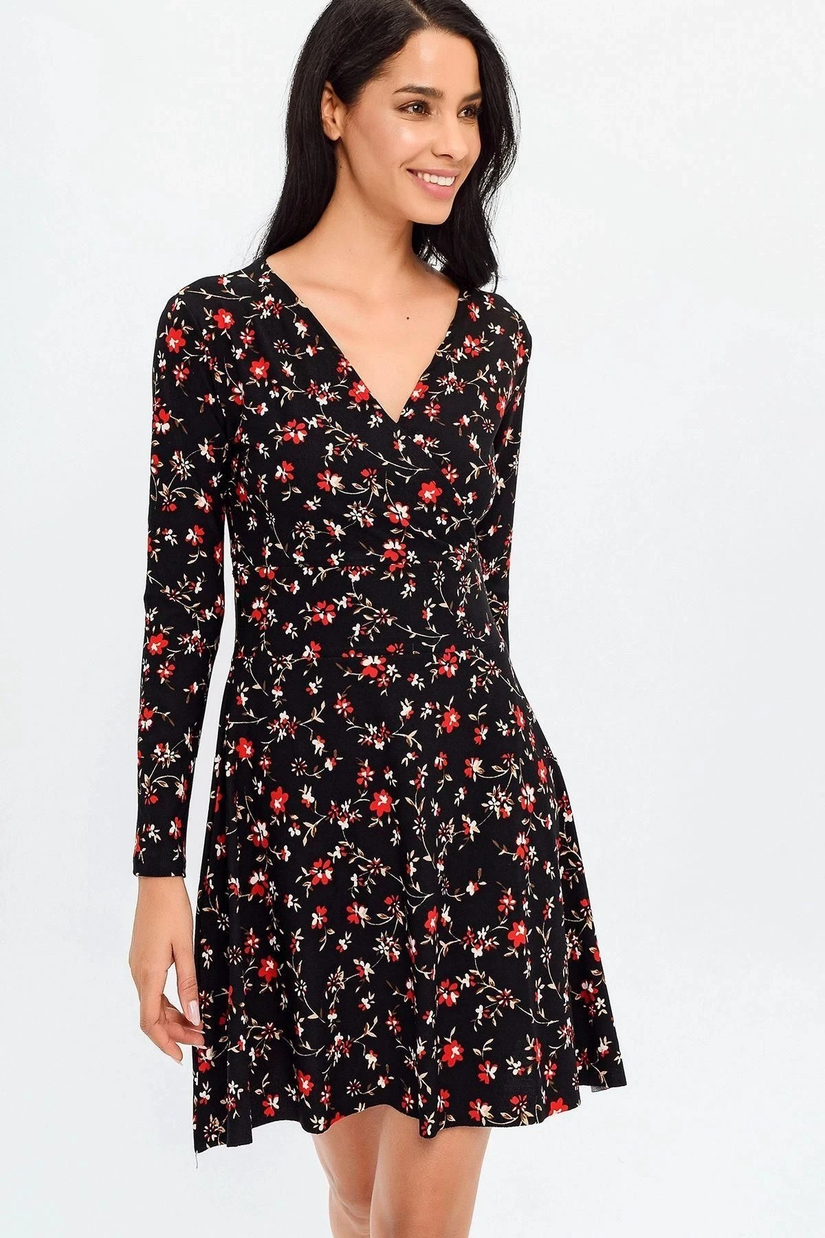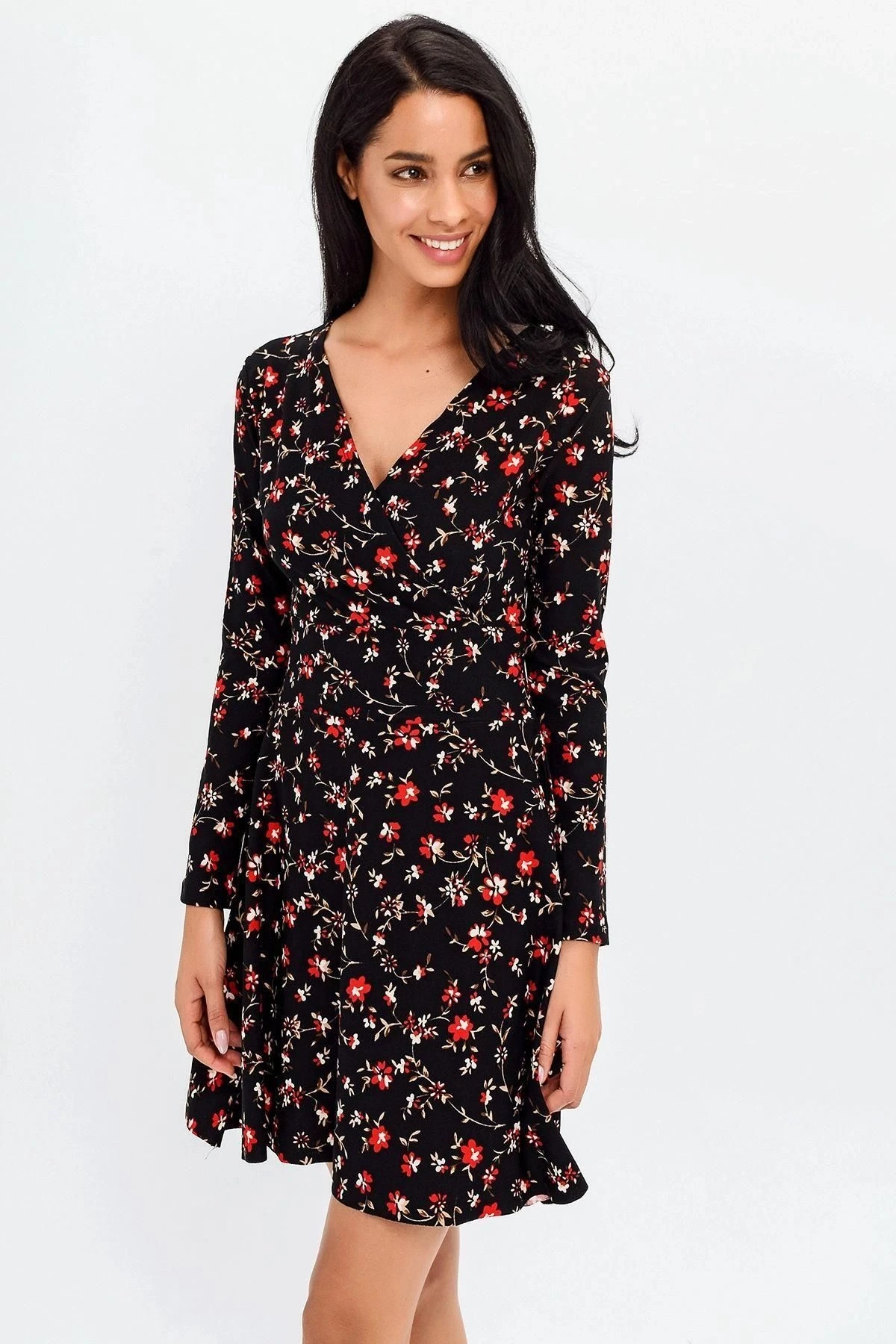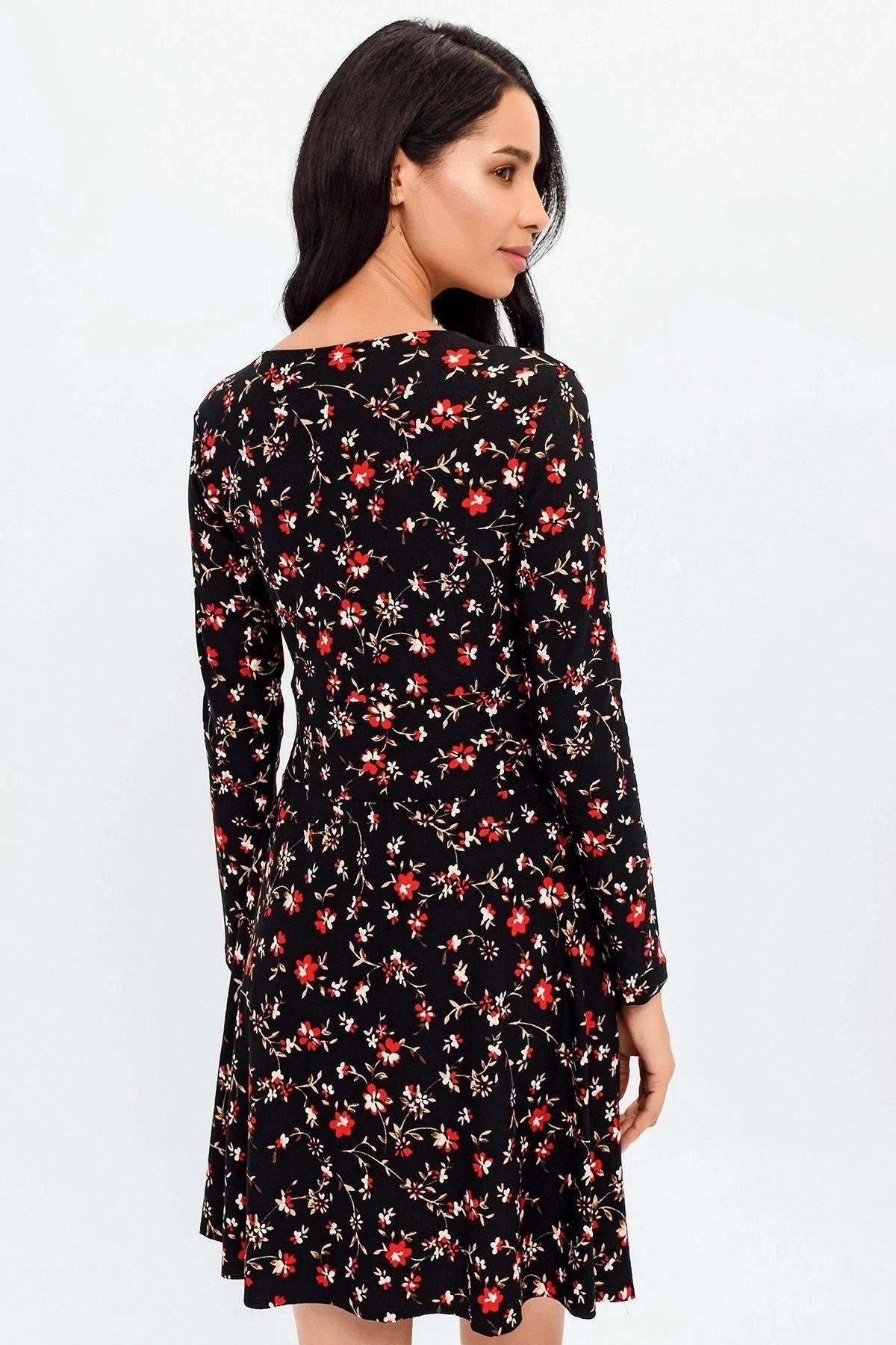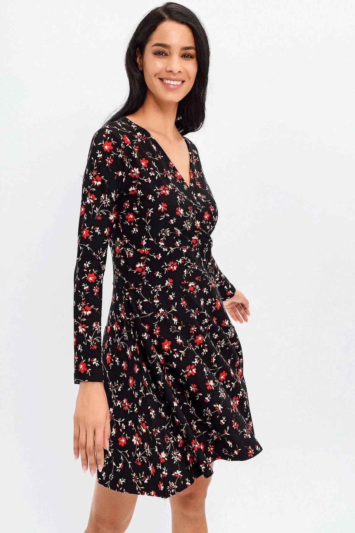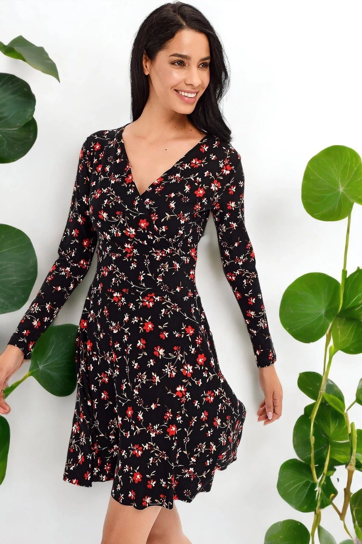 Bu şık ve zarif elbise, hem ofis ortamlarında hem de günlük hayatta mükemmel bir tercih.; Siyah renkli kruvaze yaka, uzun kollu tasarımıyla klasik bir görünüm sunarken, çiçek desenli detaylar da ona zarafet katıyor.; Elbisenin midi boyu, diz üstünde biterek her iki dünyanın en iyisini sunuyor: ofis ortamlarında resmi bir hava yaratırken, günlük kullanımda da rahatlık sağlıyor.; Kloş kesimi, etek bölümünde hafif bir kabarıklık yaratırken, vücut hatlarını hoş bir şekilde vurguluyor.; Kumaş içeriği %95 polyester ve %5 elastan olan elbise, konforlu ve esnek bir taşıma deneyimi sunuyor.; Polyester, dayanıklılığı ve kolay bakım özellikleriyle bilinirken, elastan ise esneklik sağlayarak hareket özgürlüğü sunar.; Siyah renk, her zaman şıklığın simgesi olmuştur ve bu elbise de istisna değil.; Kruvaze yaka detayı, zarif bir tarz sunarken, çiçek desenleri, feminen bir dokunuş ekleyerek bu elbiseyi benzersiz kılıyor.; İster iş toplantılarında, ister özel etkinliklerde giyin, bu elbise sizi her zaman şık ve tarz sahibi gösterecek.; Bu elbise, mükemmel bir kombinasyon olan rahatlık ve stil arasında denge sağlıyor.; Ofis ortamlarında profesyonel bir görünüm elde etmek isteyenler veya günlük hayatta şık bir şekilde dolaşmak isteyenler için ideal bir seçenek.; Bu elbiseyi gardırobunuza ekleyin ve her zaman etkileyici bir izlenim bırakın.