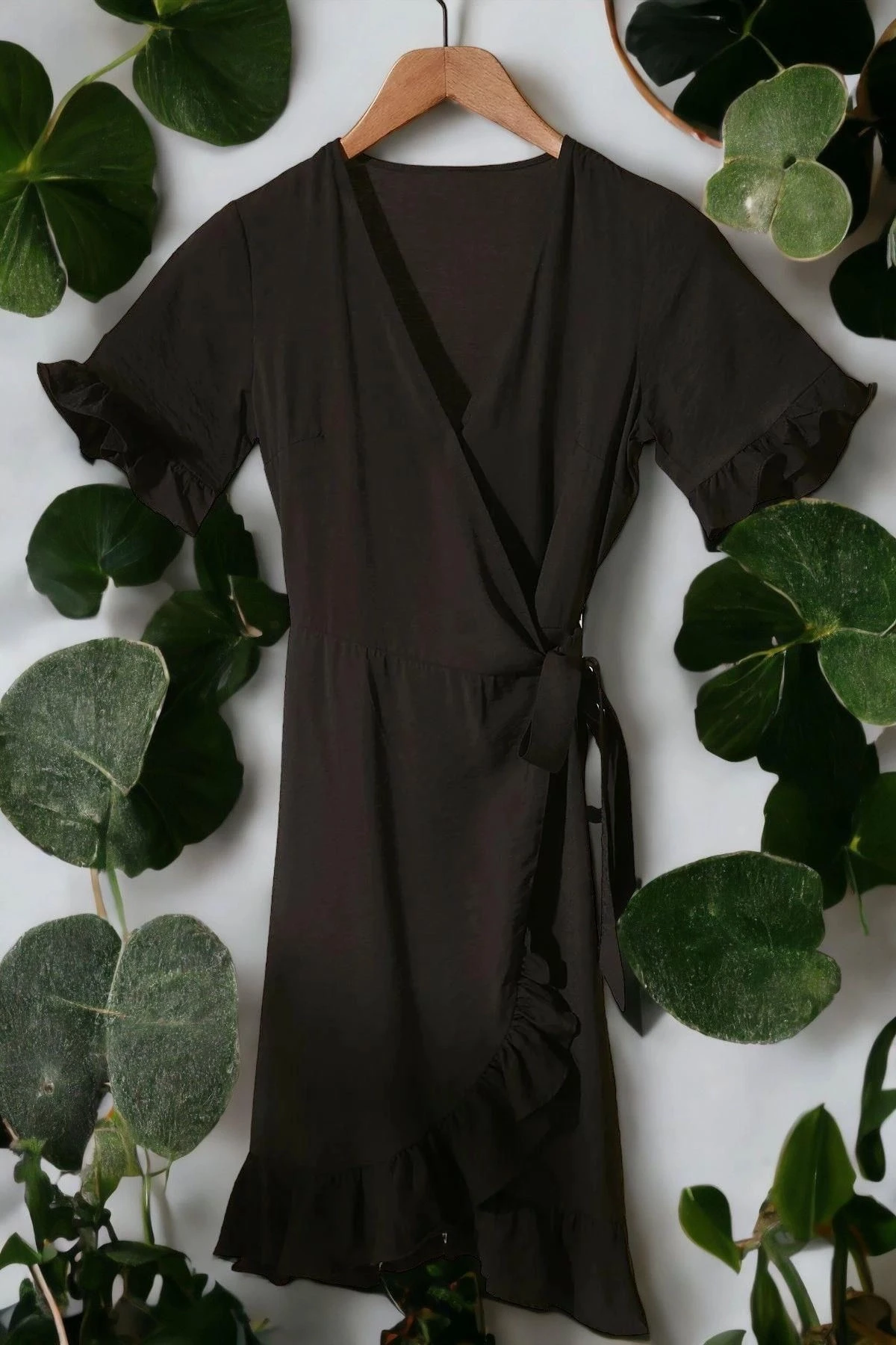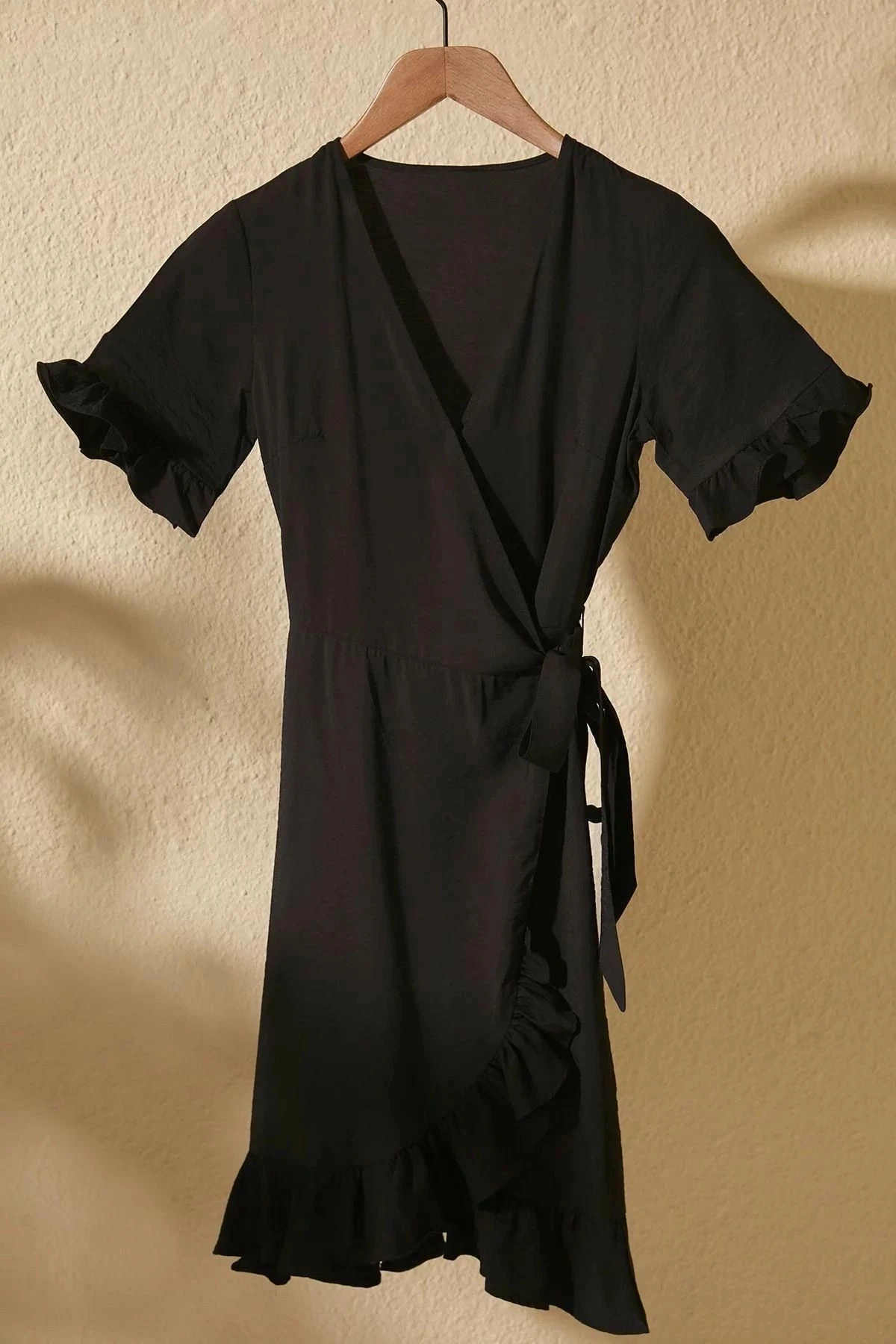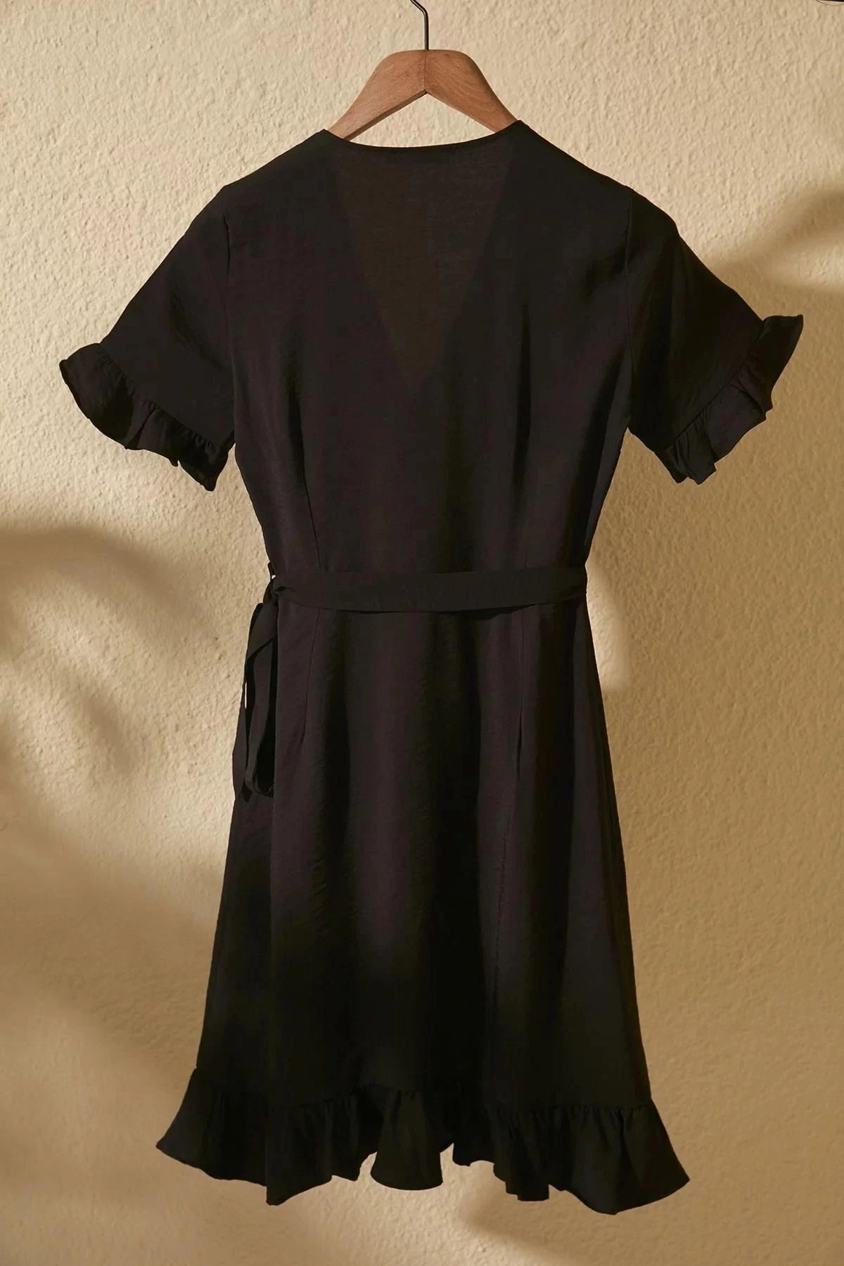 Kadın Siyah Kruvaze Yaka Yarım Kol Fırfırlı Kuşak Detaylı A Kesim Midi Boy Diz üstü Elbise