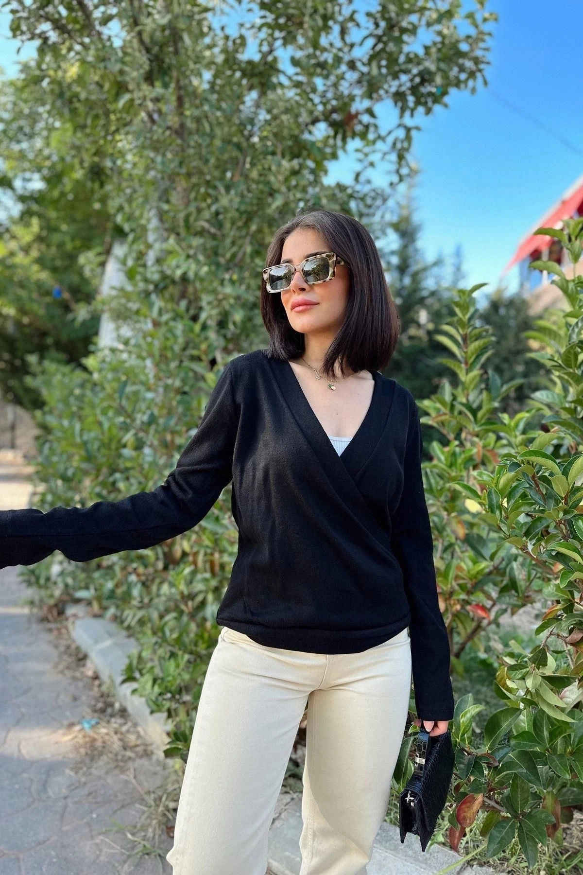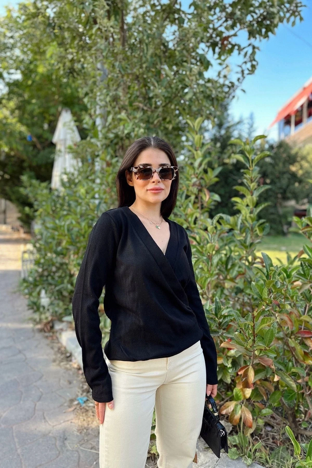 Kadın Siyah Kruvaze Yaka, Yumuşak Dokulu, Uzun Kol, Triko Bluz