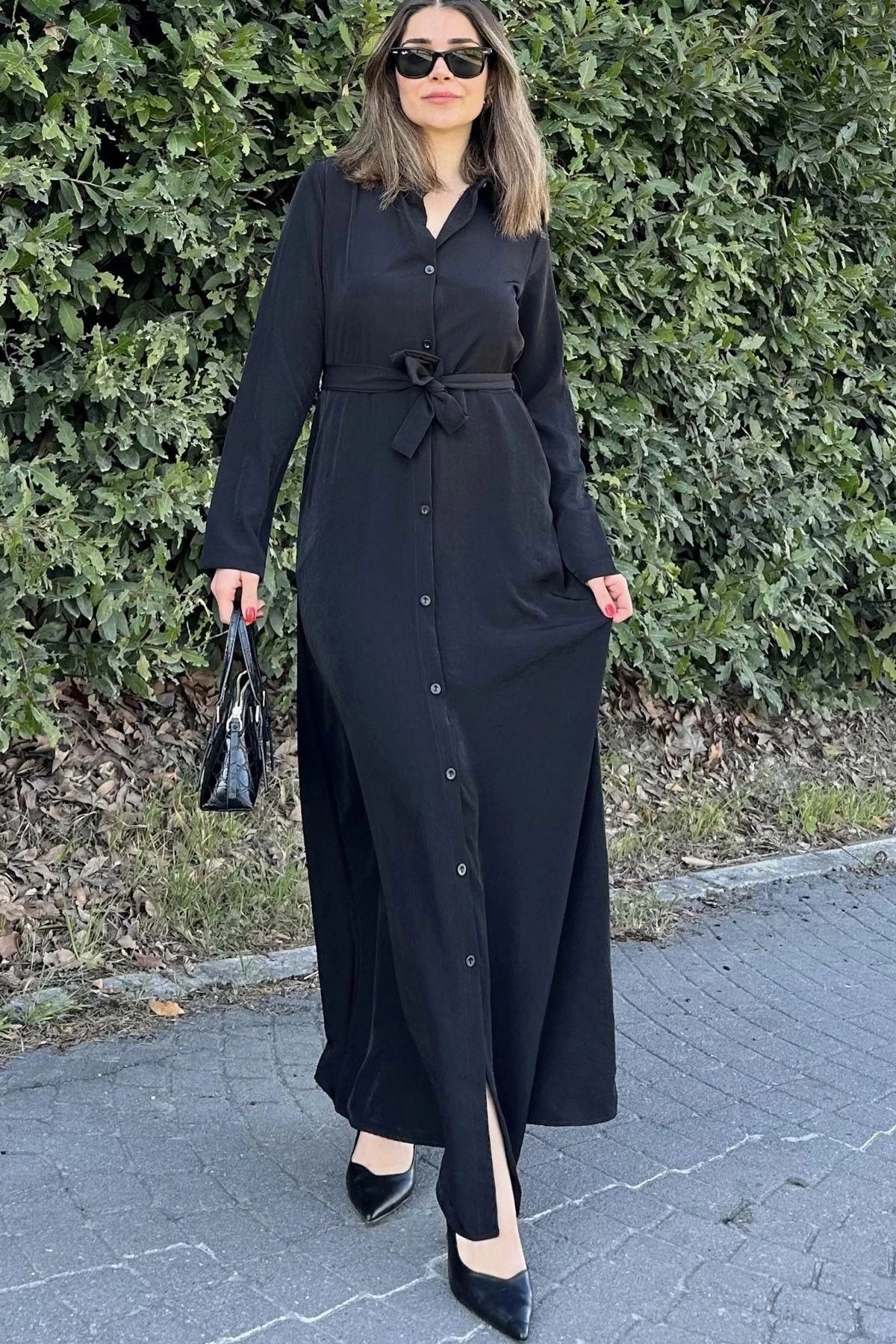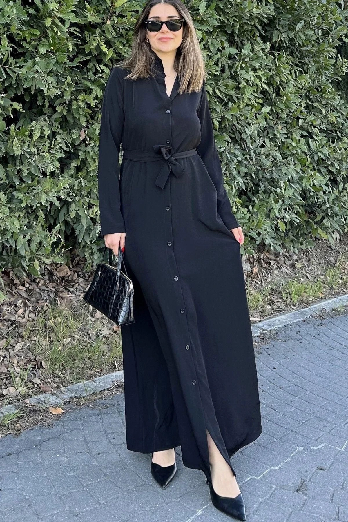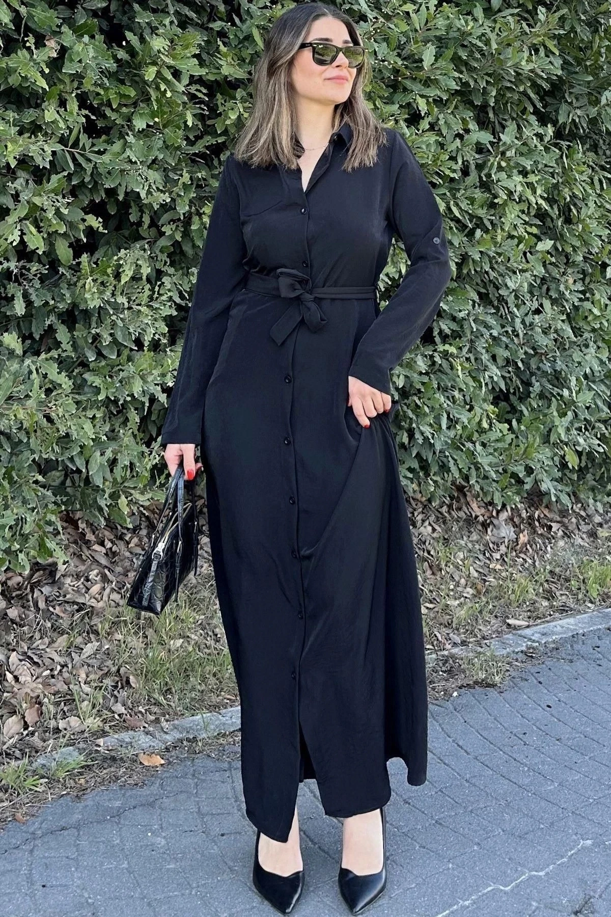 Kadın Siyah Kupra Kumaş, Uzun Kol, Beli Kuşaklı, Vucüda Oturan Kalıp, Uzun Gömlek Elbise