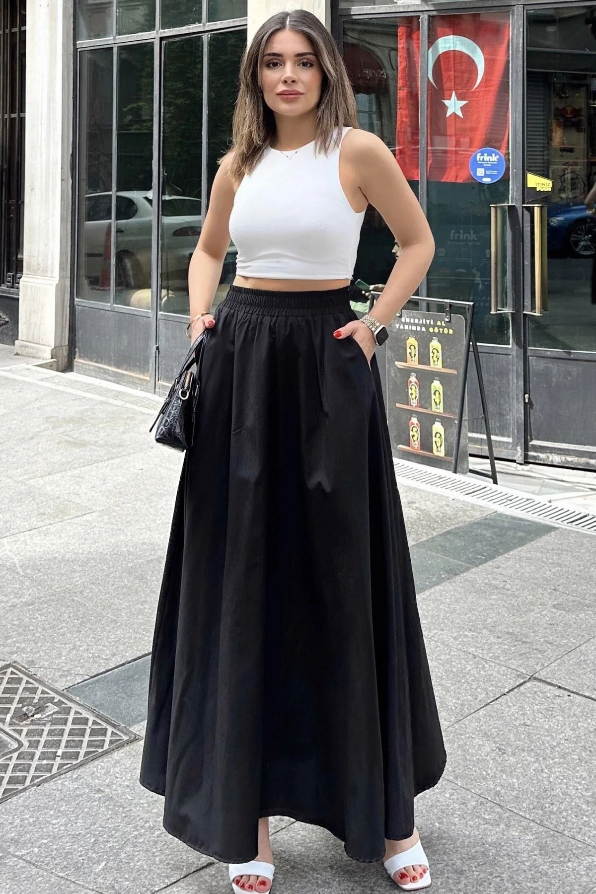 Kadın Siyah Lastikli Yüksek Bel, A Kesim, Dökümlü Ve Salaş, Uzun Poplin Etek