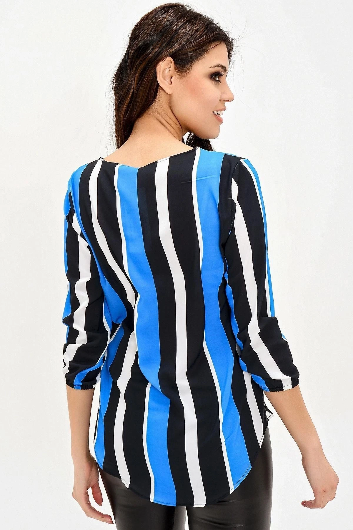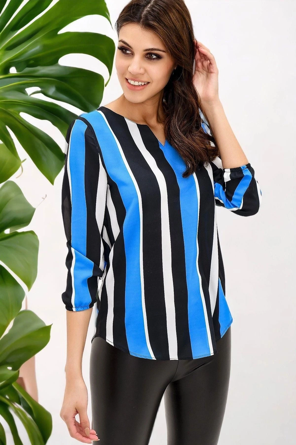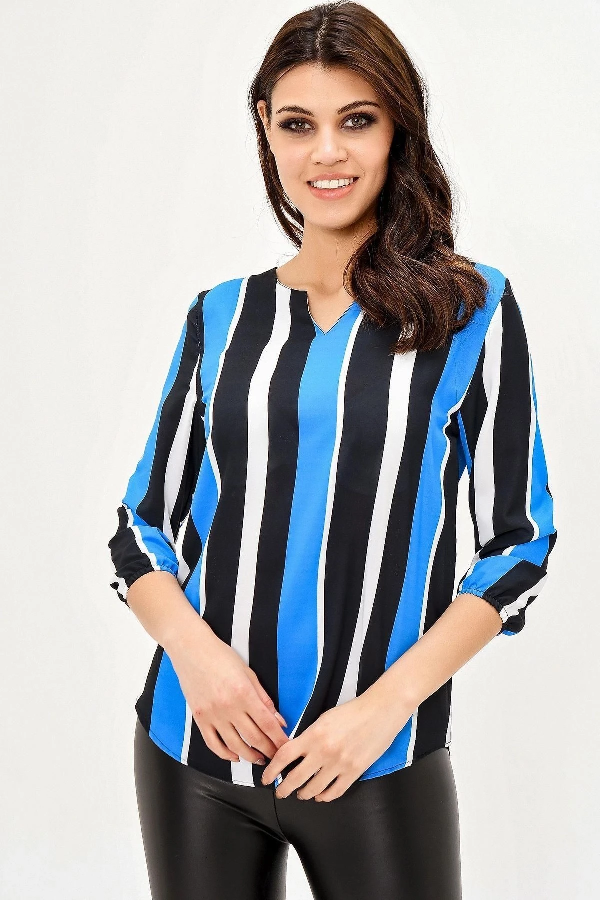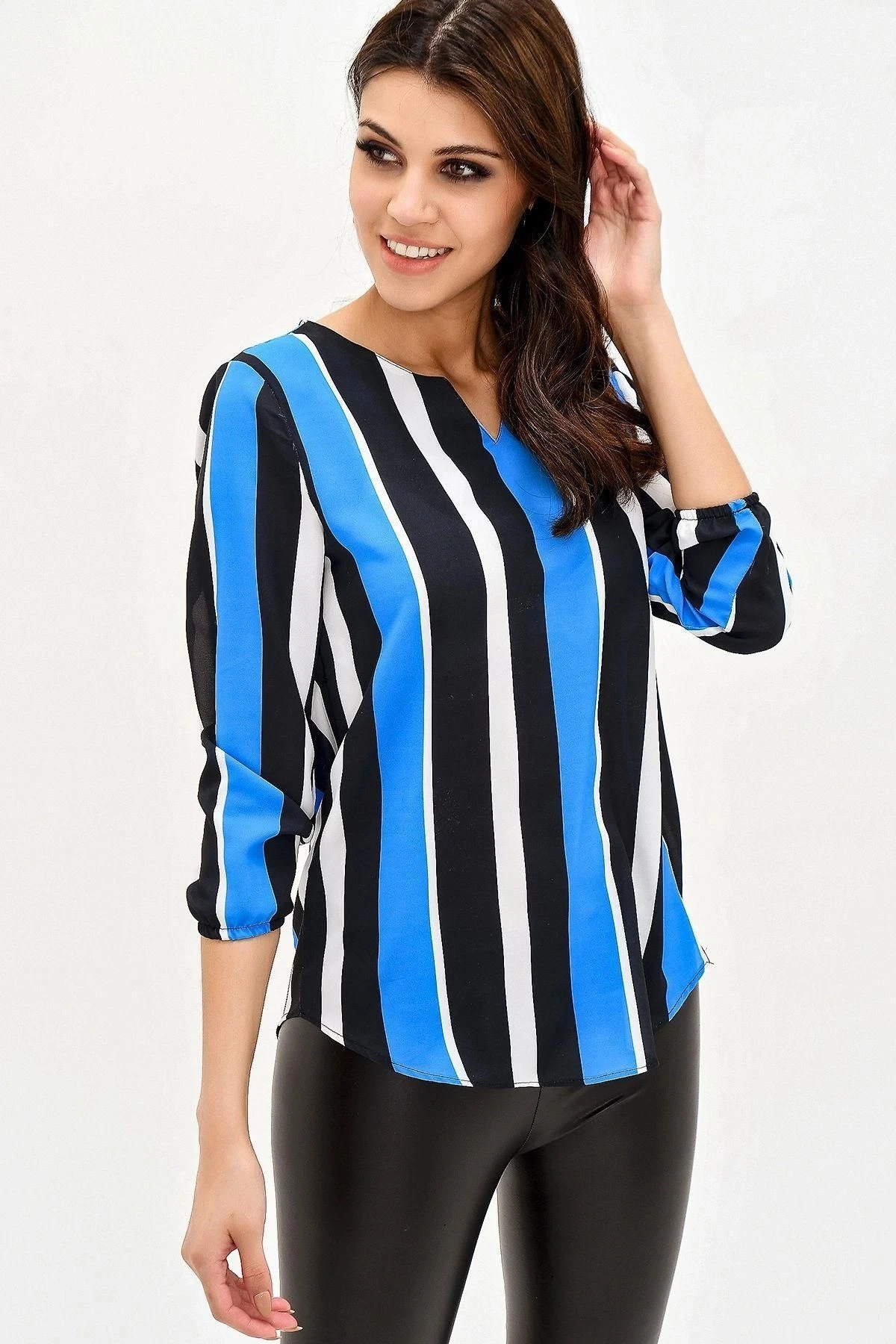 Bu şık ve modern krep bluz, sizi etkileyici bir görünüme kavuşturacak.; Siyah ve mavi renklerin mükemmel bir uyumuyla tasarlanmış olan bu bluz, sizi kalabalığın içinde öne çıkaracak.; Yırtmaçlı çizgili detaylarıyla, hem zarif bir tarz sunuyor hem de hareket özgürlüğü sağlıyor.; Truvakar kol tasarımı, bluza sofistike bir dokunuş katıyor.; Kaliteli dokulu kumaş, kullanıcılara mükemmel bir konfor sunuyor.; %100 polyester içeriği sayesinde, bluzun dayanıklılığı ve uzun ömürlülüğü garanti altına alınmıştır.; Düz kesim ve standart boyu, farklı bedenlere uyum sağlayarak geniş bir kullanıcı kitlesine hitap ediyor.; Bu bluz, gündelik ve özel günlerde rahatlıkla tercih edilebilir.; Özetle, bu krep bluz, şık tasarımı, yırtmaçlı çizgili detayları, truvakar kol tasarımı ve kaliteli dokulu kumaşıyla öne çıkıyor.; Renklerin mükemmel uyumu ve dayanıklı malzeme seçimiyle, tarzınızı ve konforunuzu bir arada sunuyor.