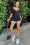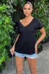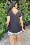 Kadın Siyah Önü Ve Sırtı Dantel Süslemeli V Yaka, Kısa Kollu, Rahat Kesim, Salaş Bluz
