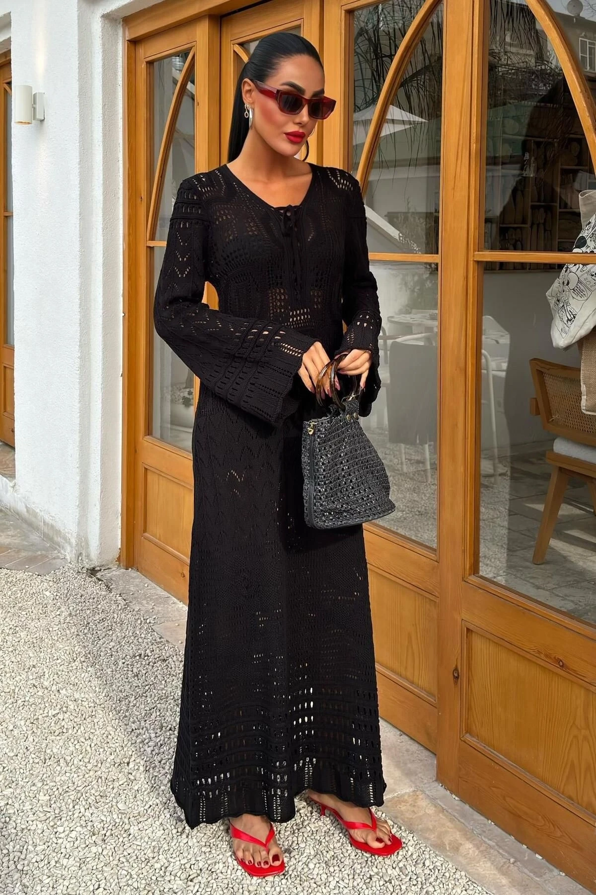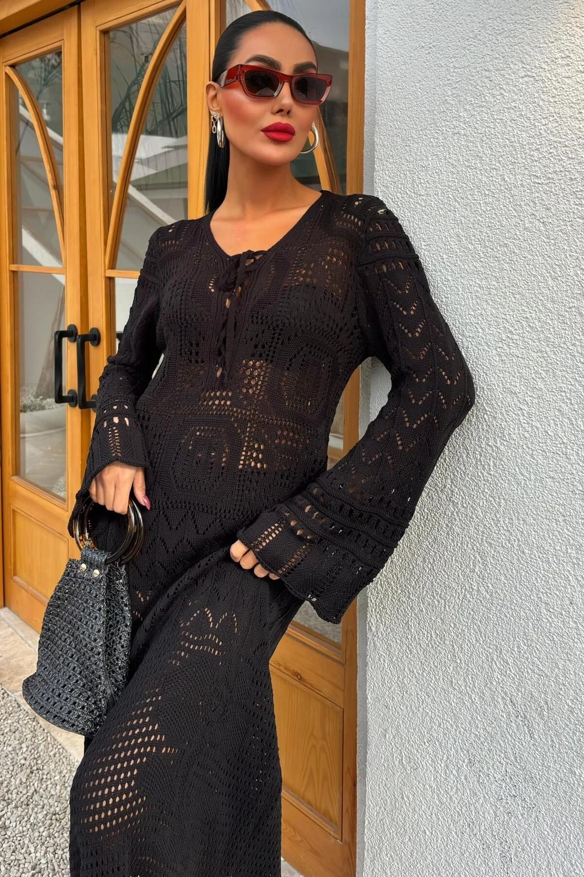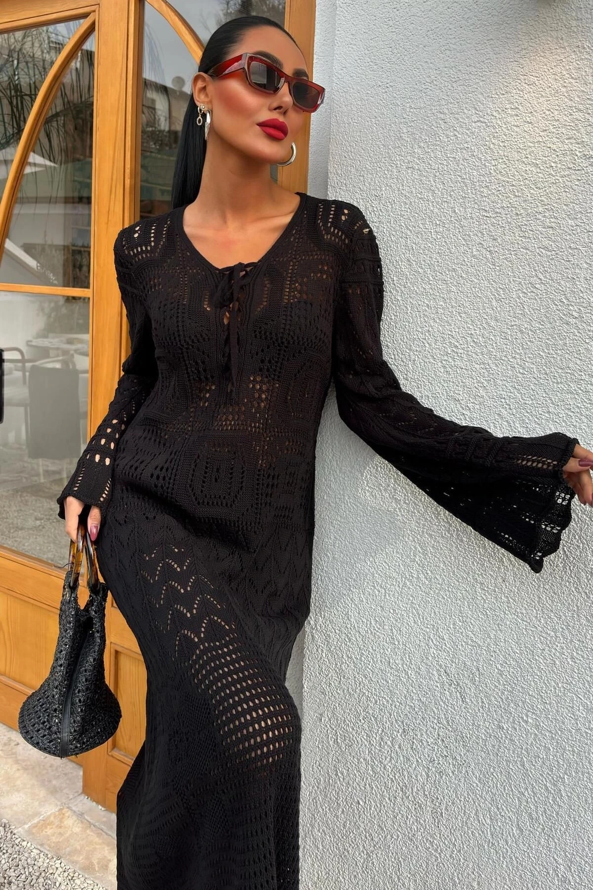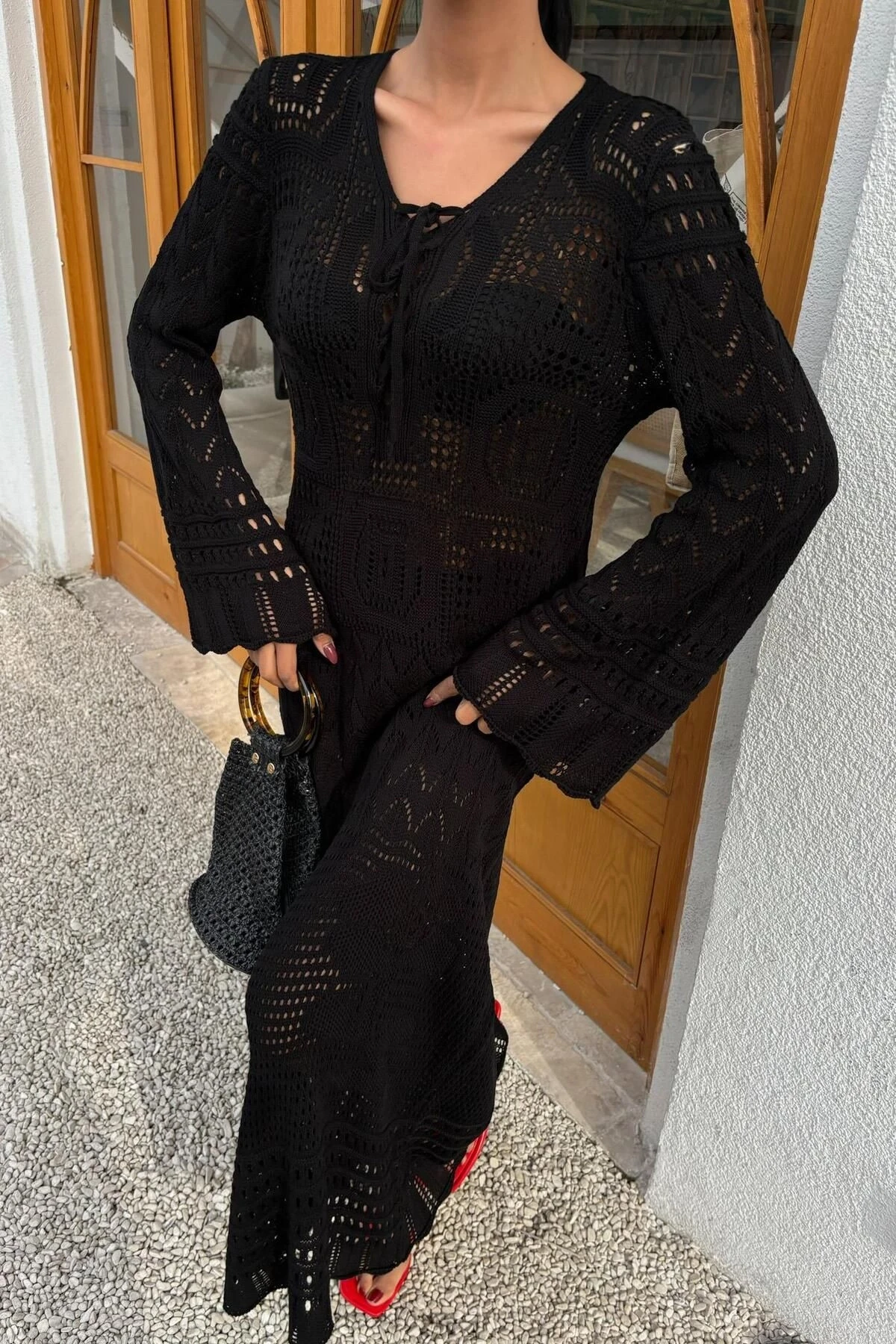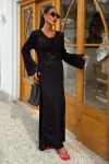 Kadın Siyah Örme Uzun V Yaka Elbise
