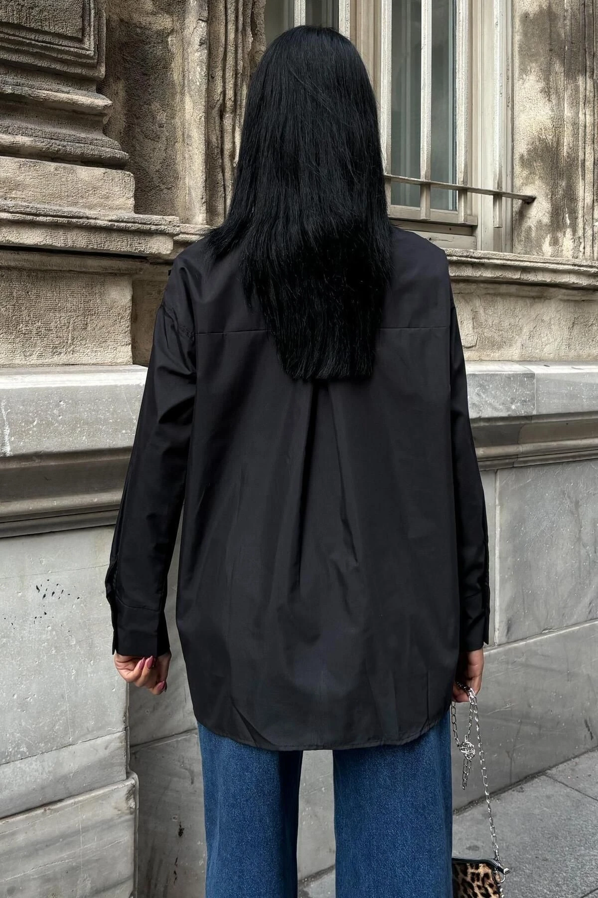 Kadın Siyah Oversize Poplin Uzun Gömlek