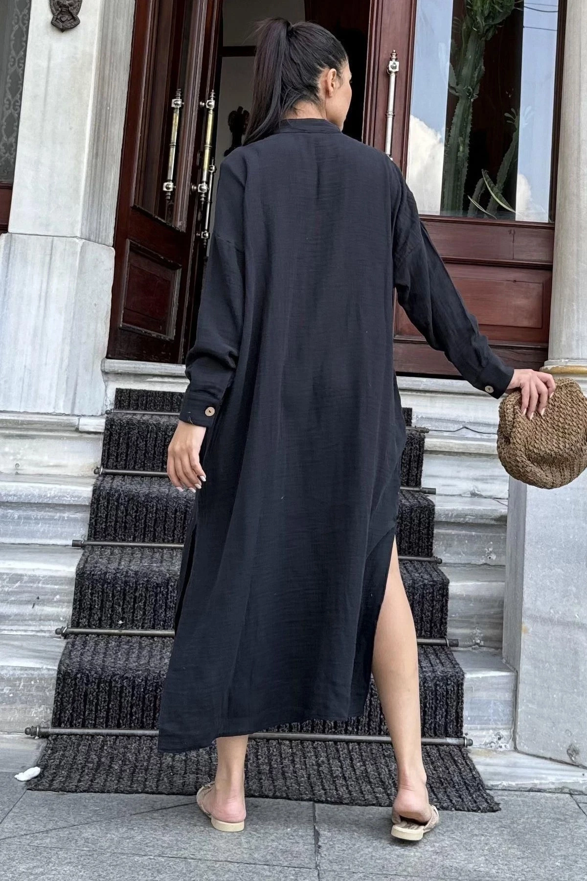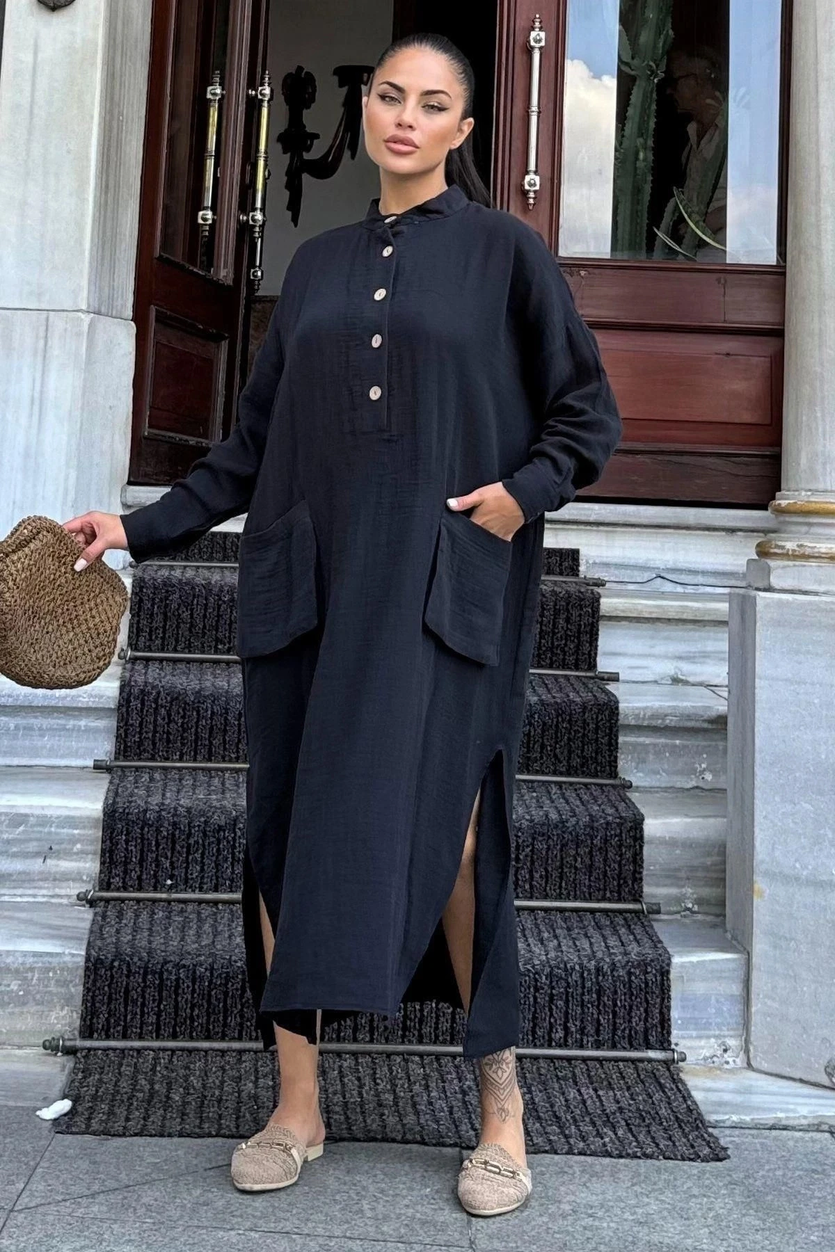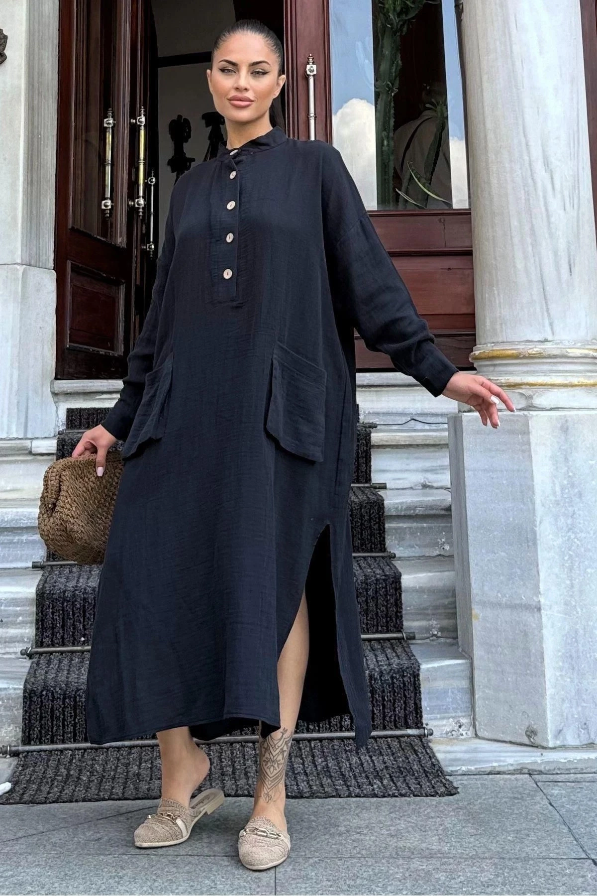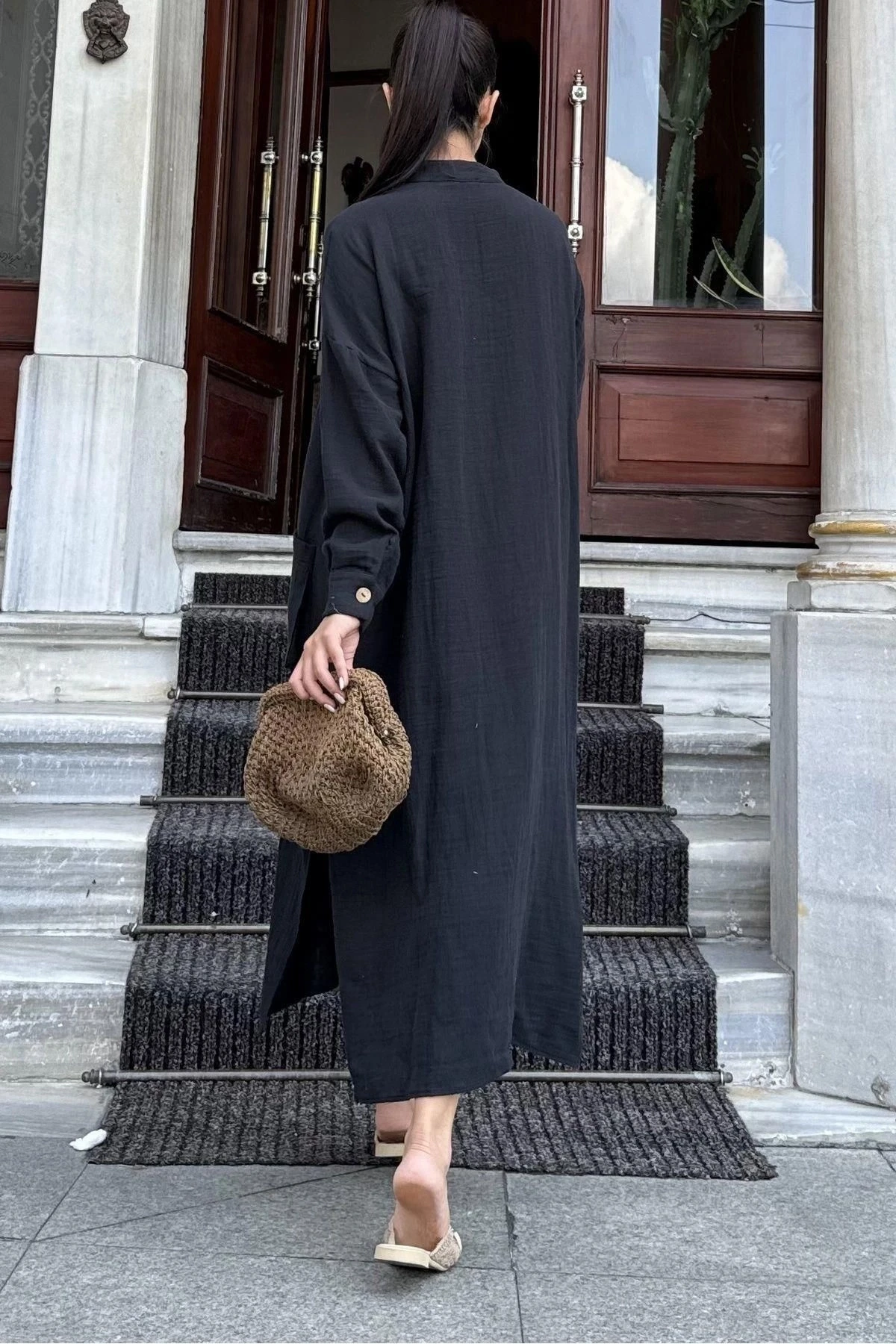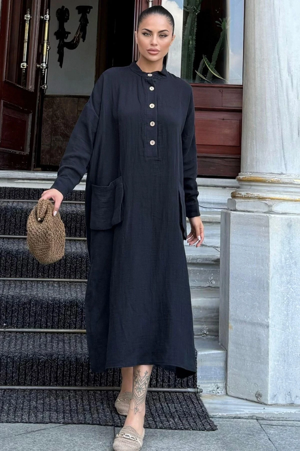 Kadın Siyah Oversize, Rahat Kesim, Cepli, Uzun Müslin Elbise