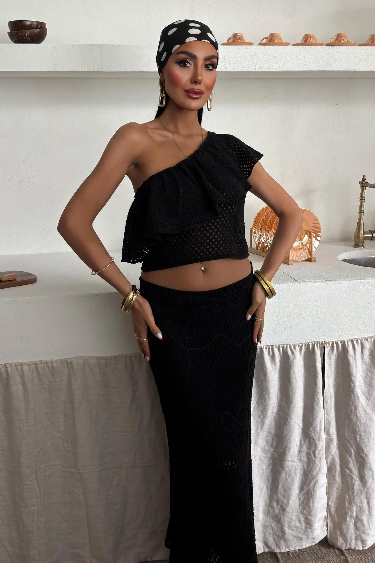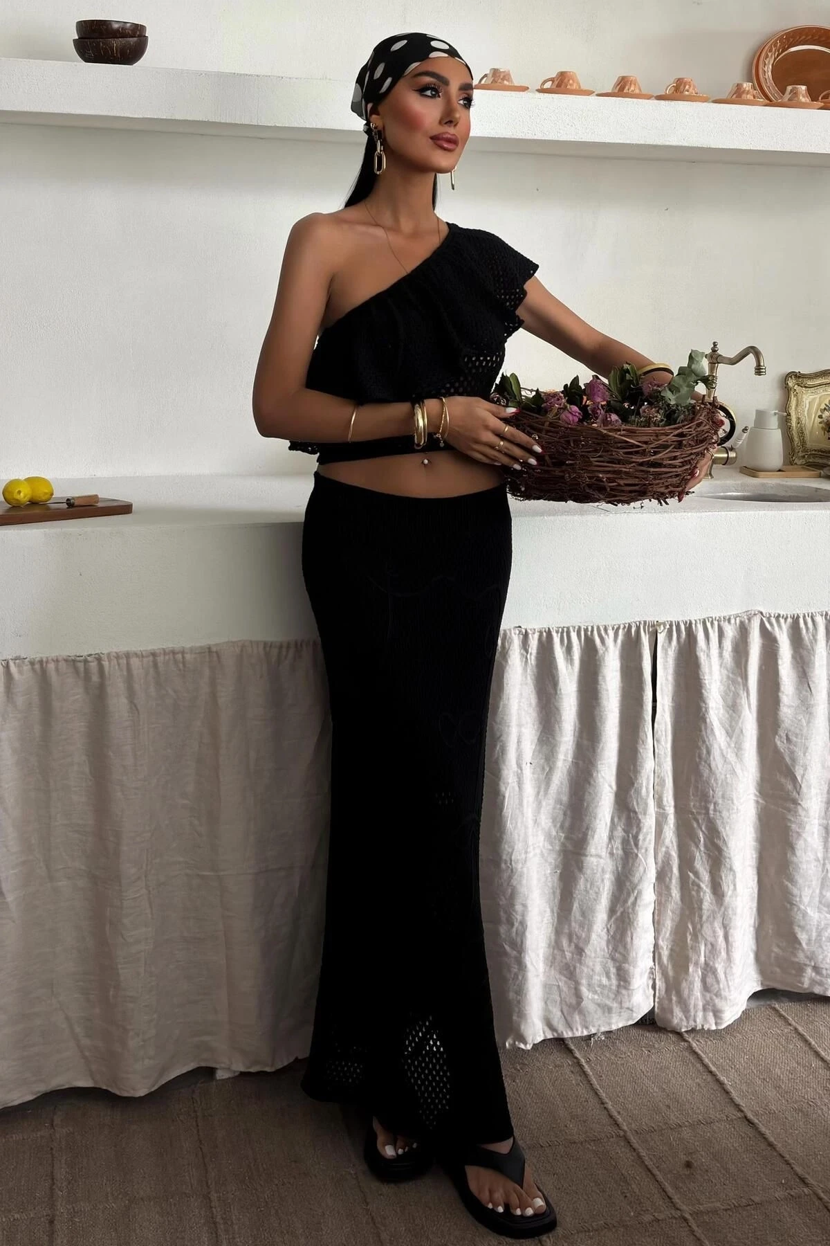 Kadın Siyah Pamuk Dokuma Asimetrik Yaka Kolsuz Takım