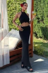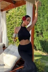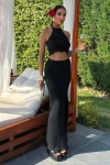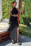 Kadın Siyah Pamuk Triko Kolsuz Crop Takım