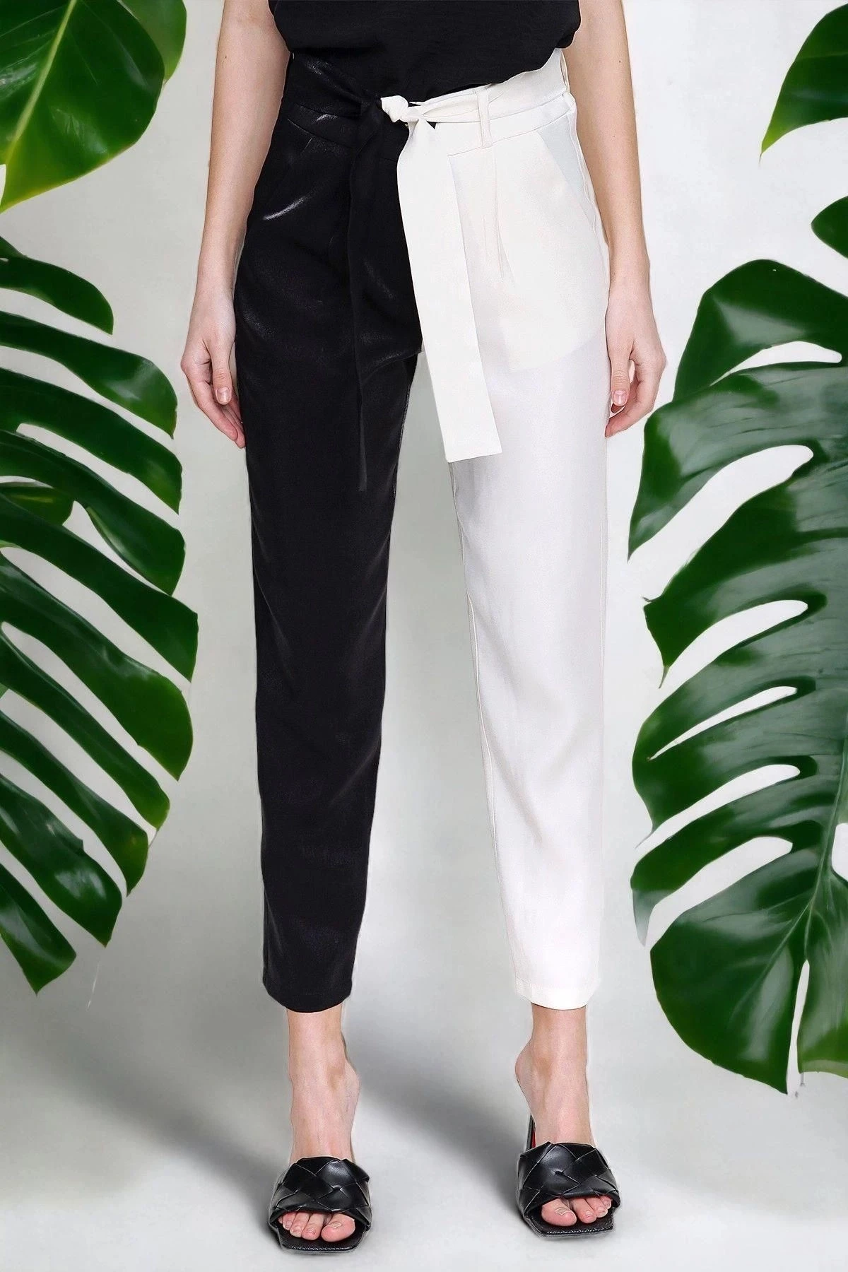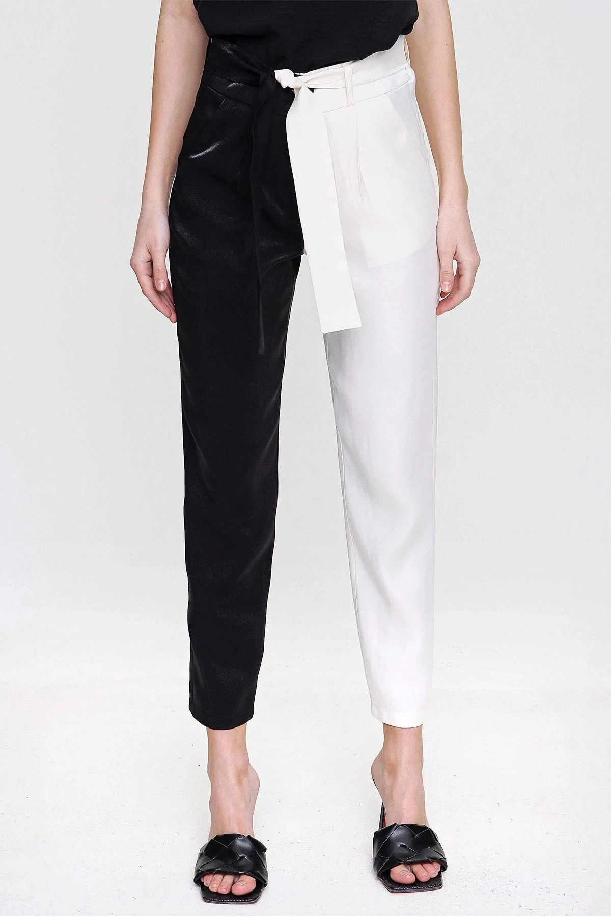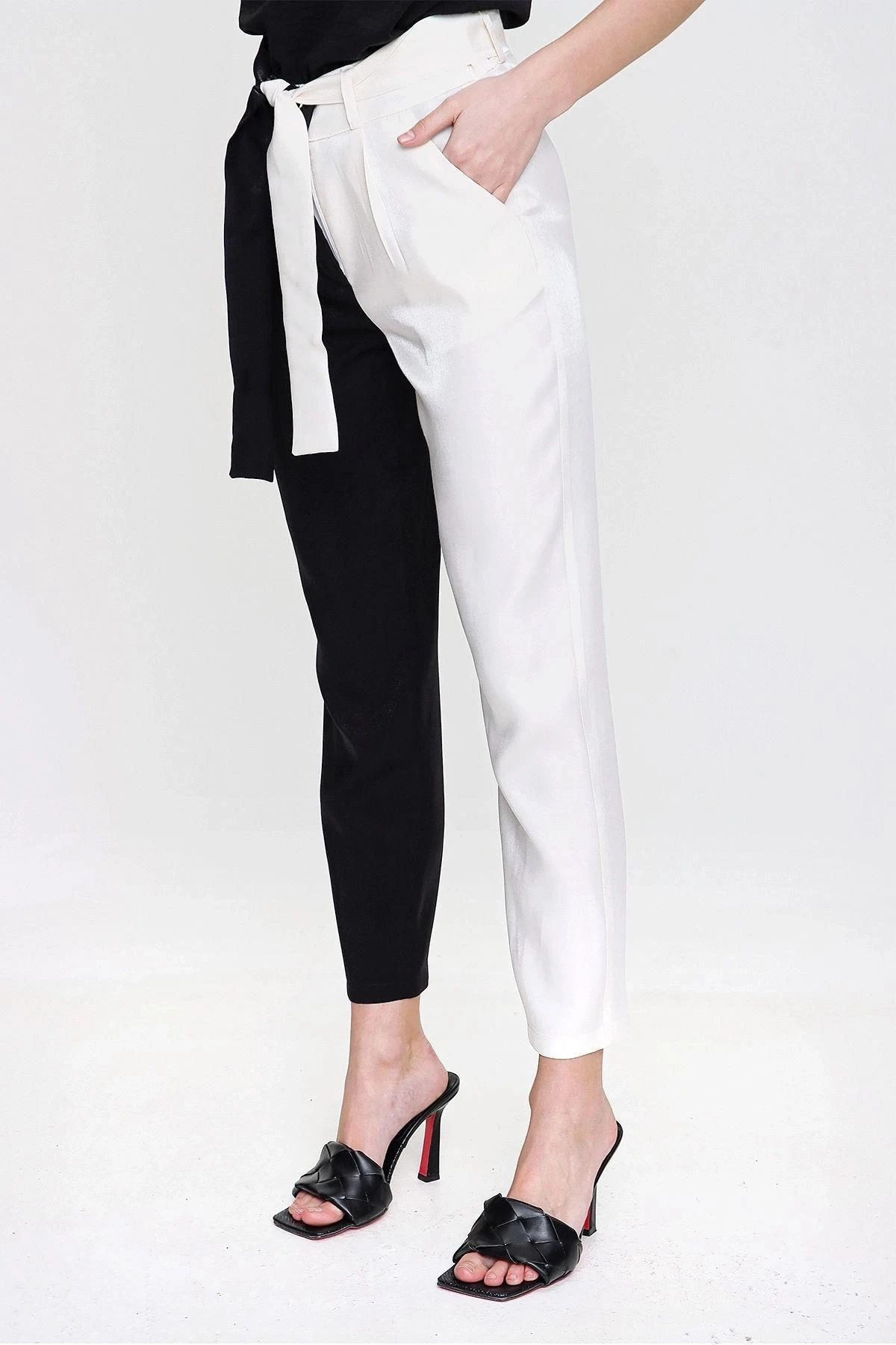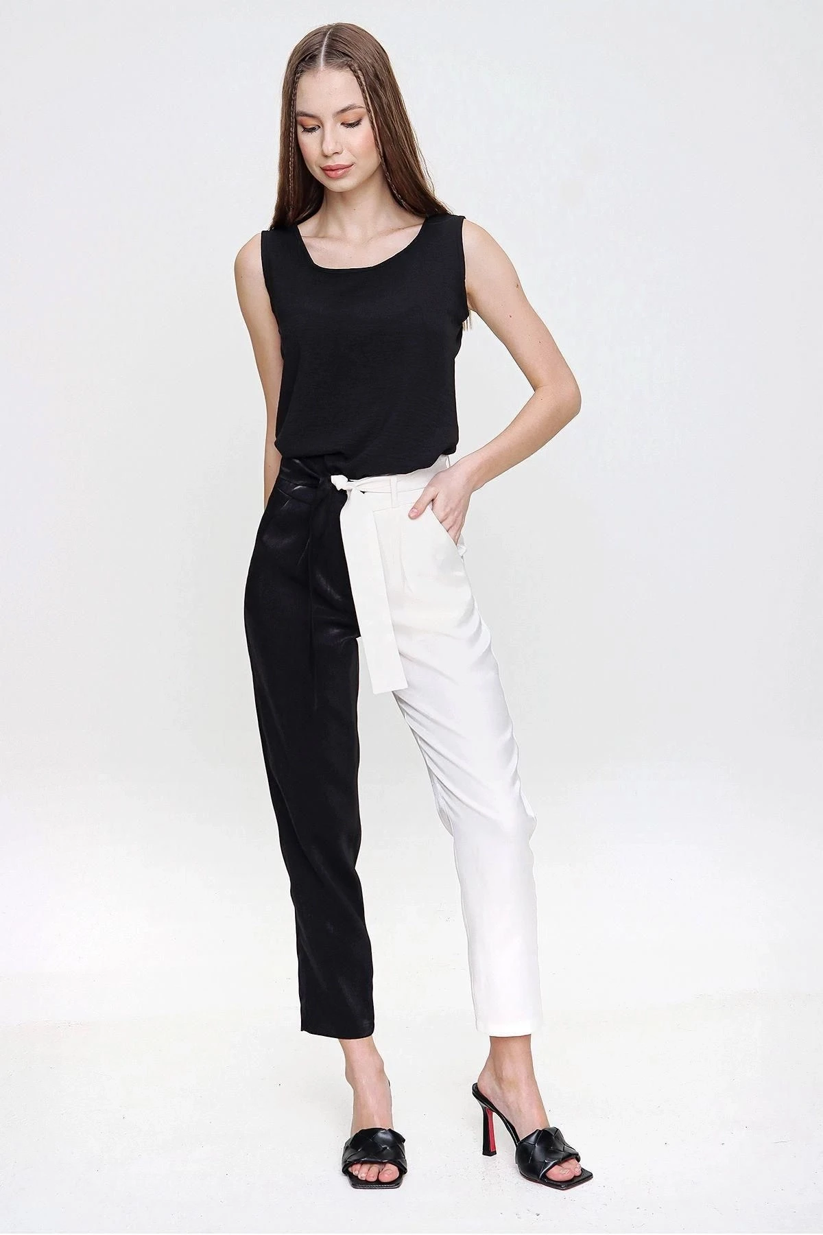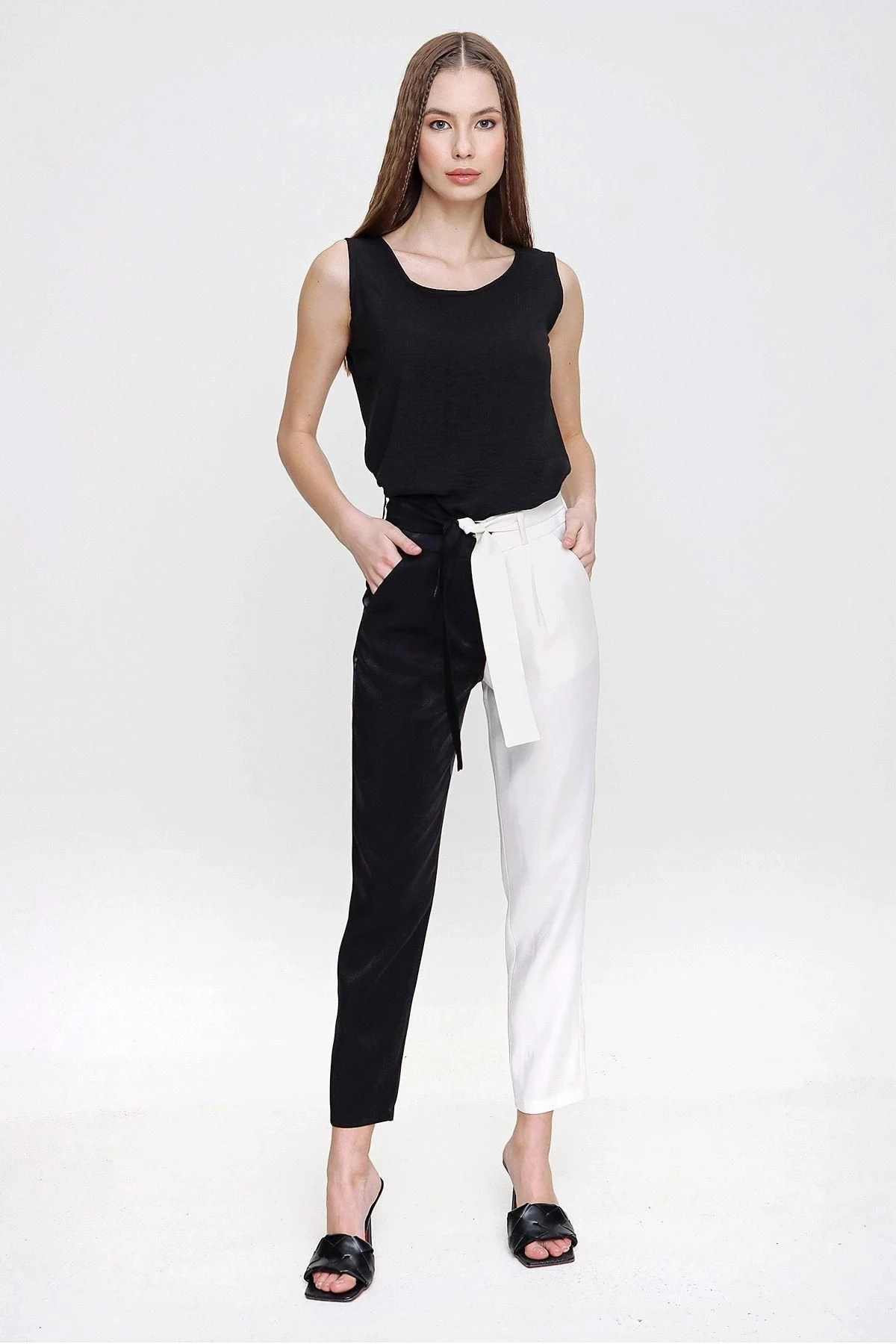 Kadın Siyah Parlak Kaliteli Kumaş Color Block Kemerli Pantolon