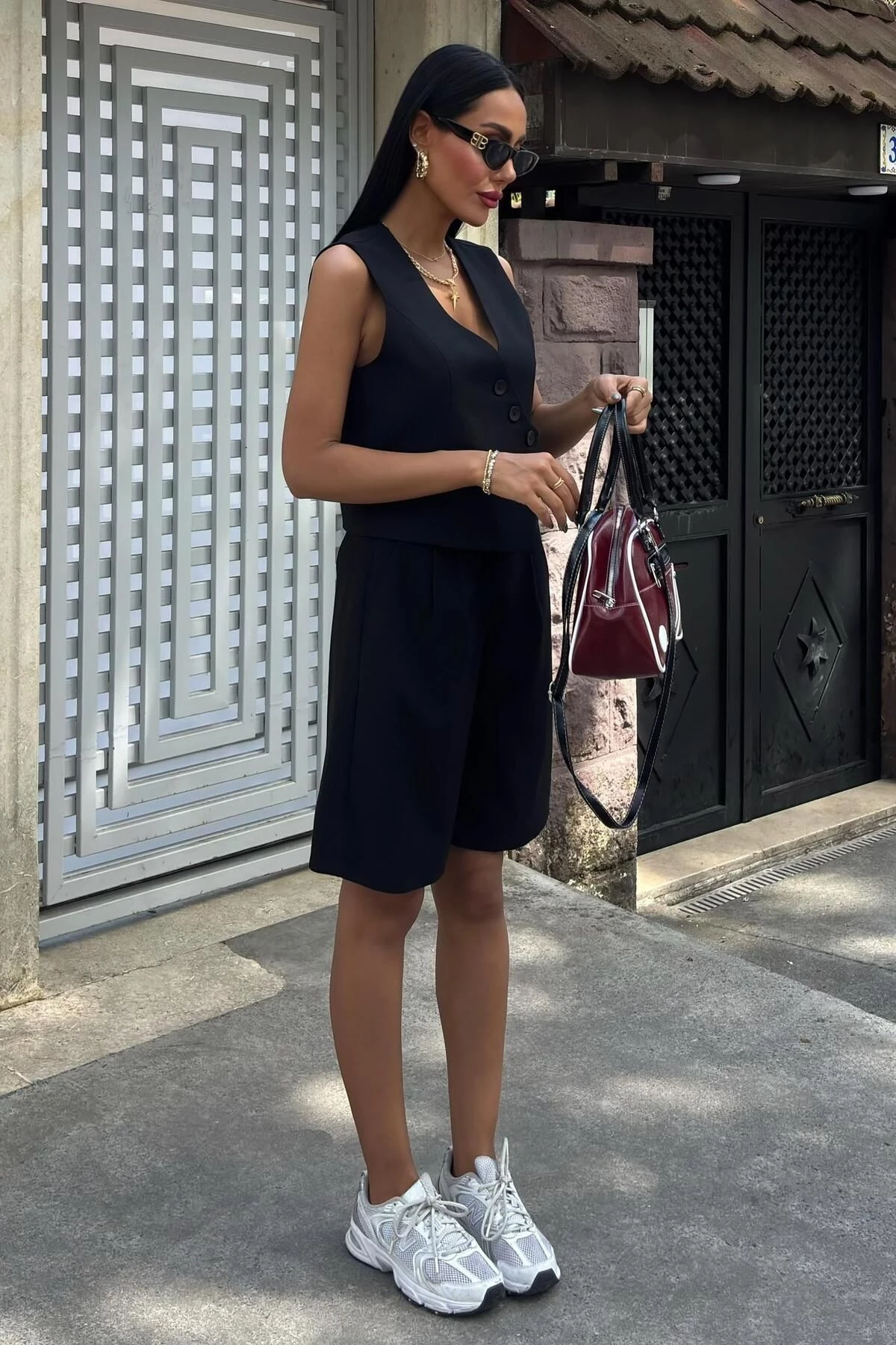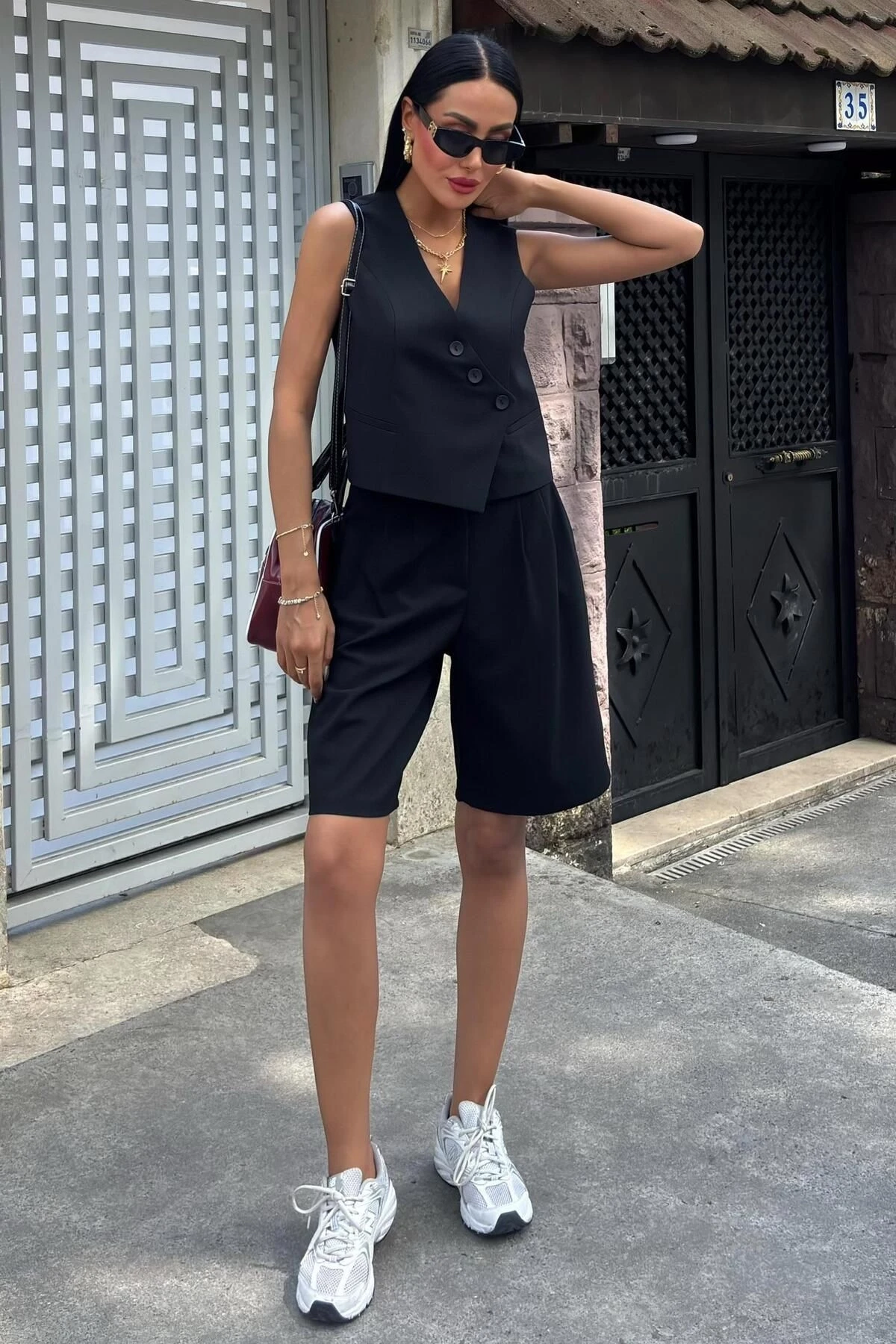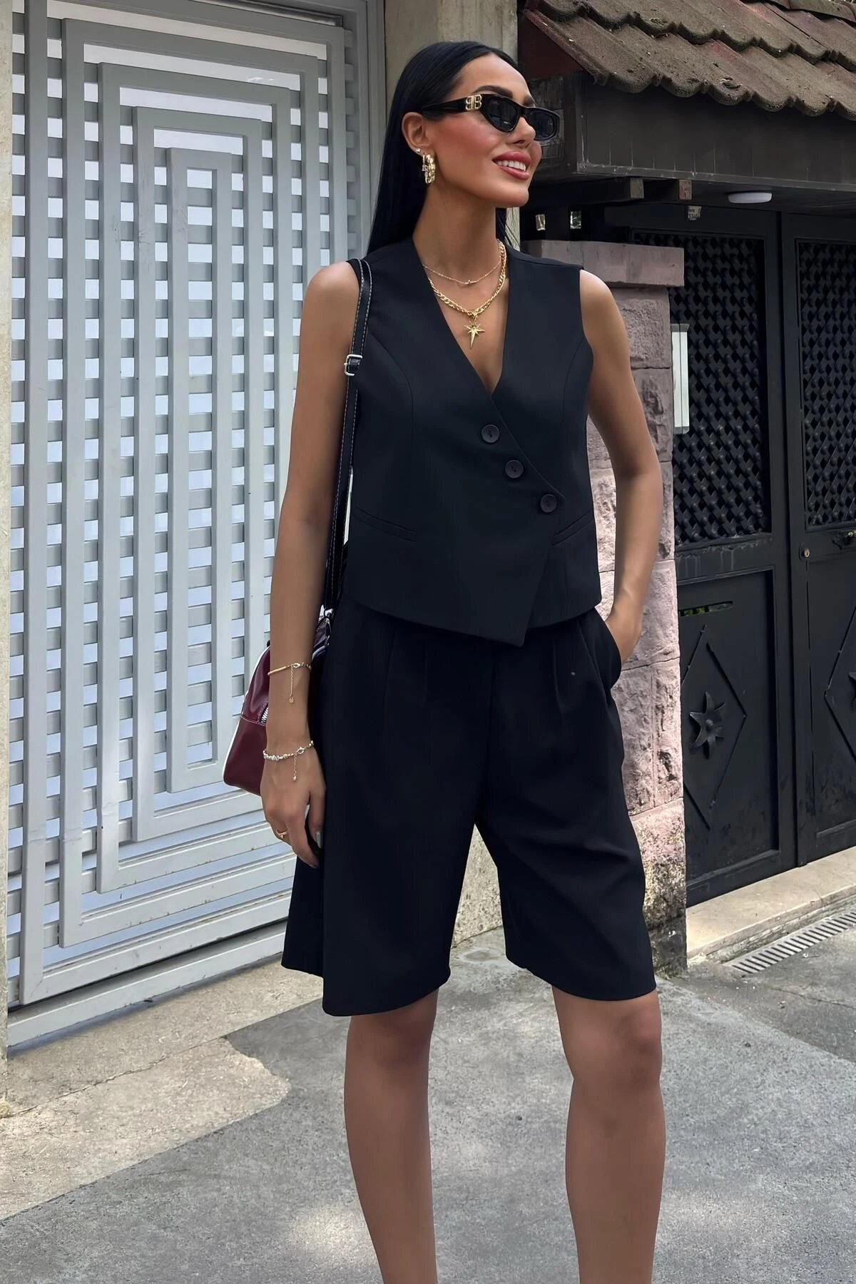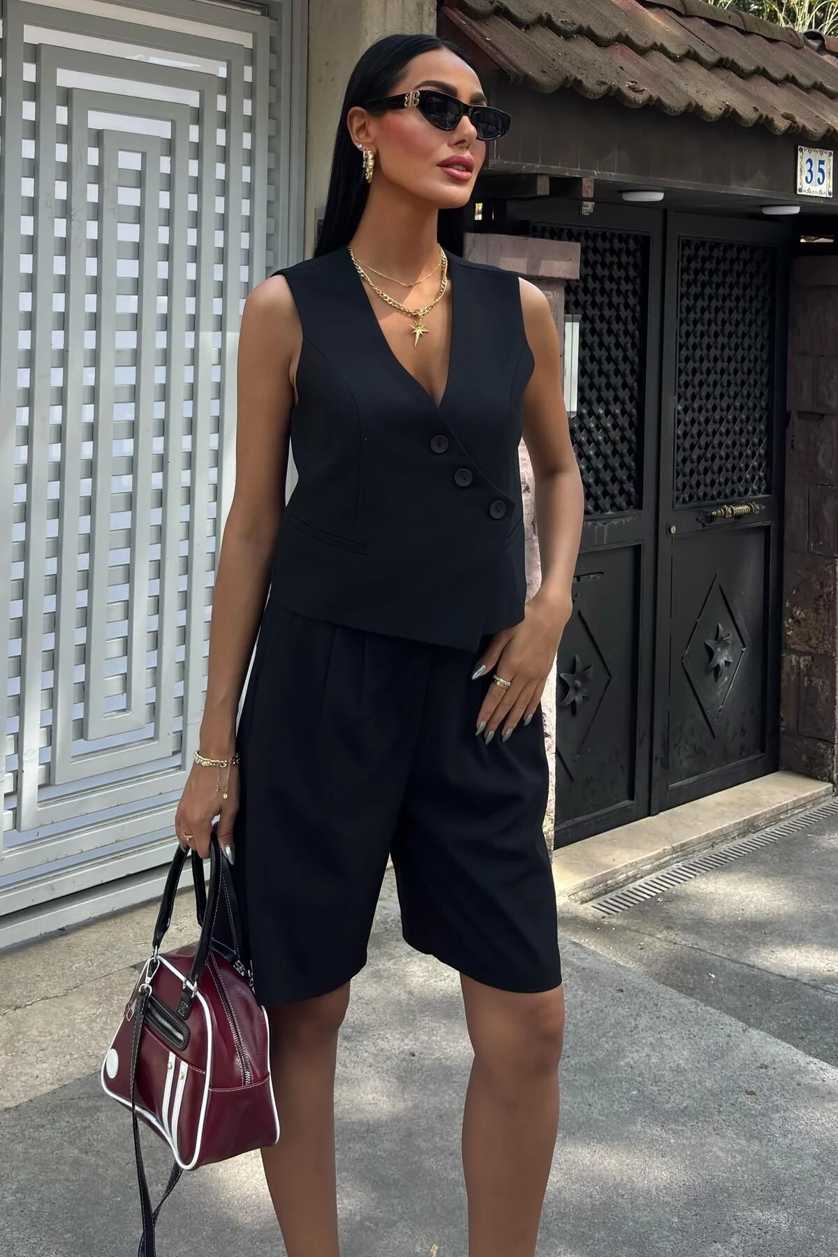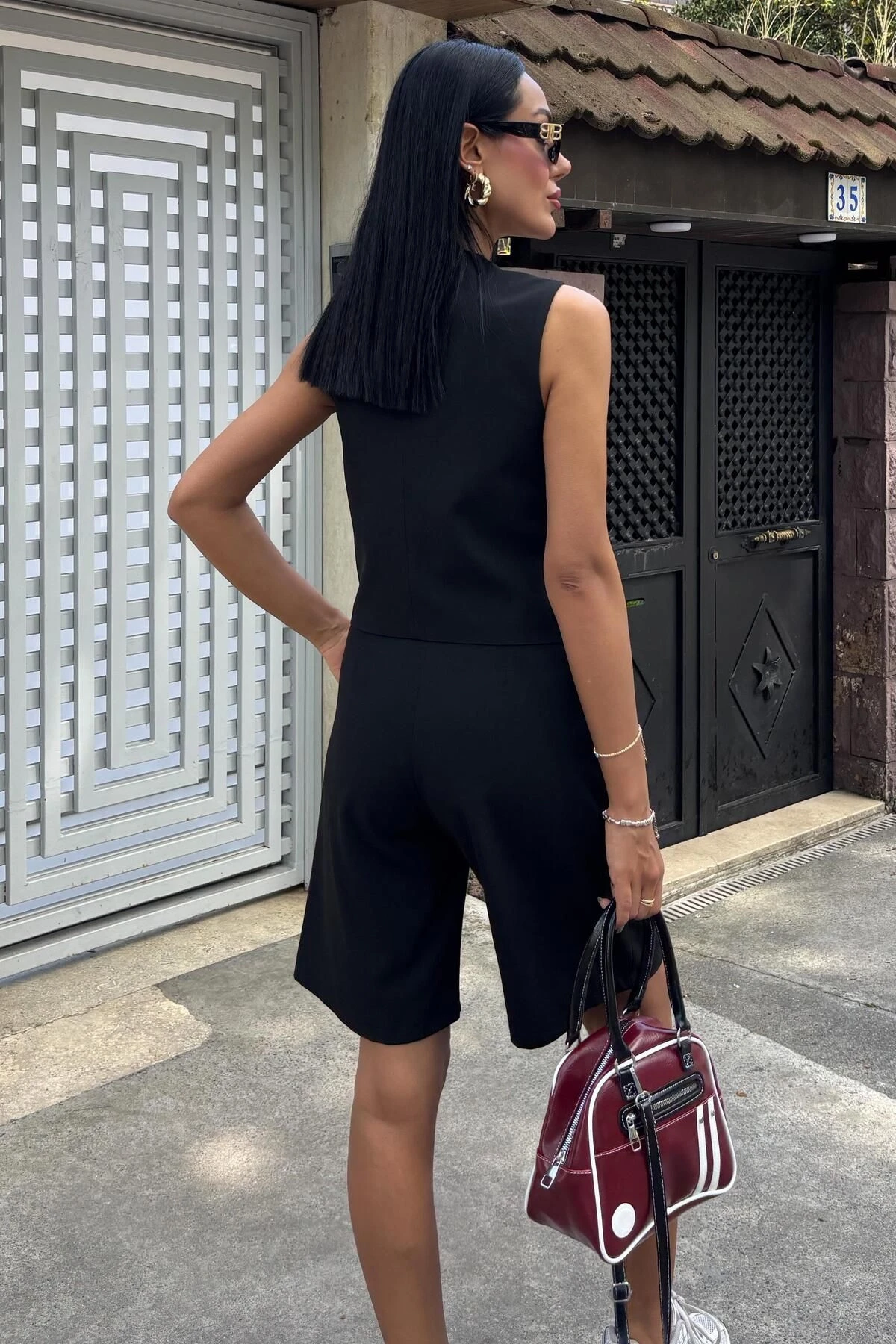 Kadın Siyah Poliviskon Düğmeli Kolsuz V Yaka Takım