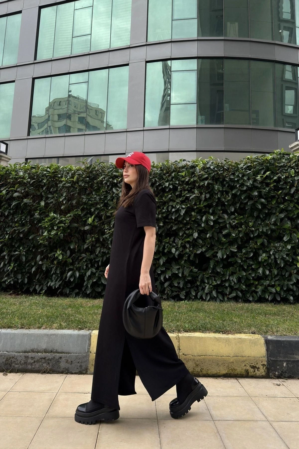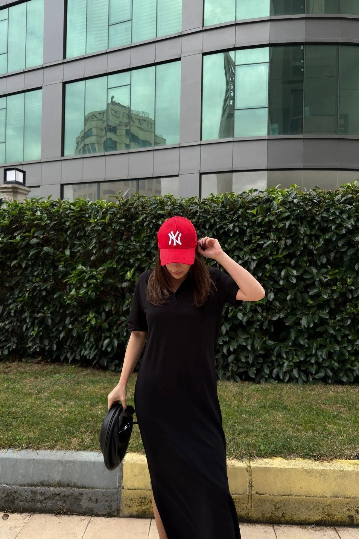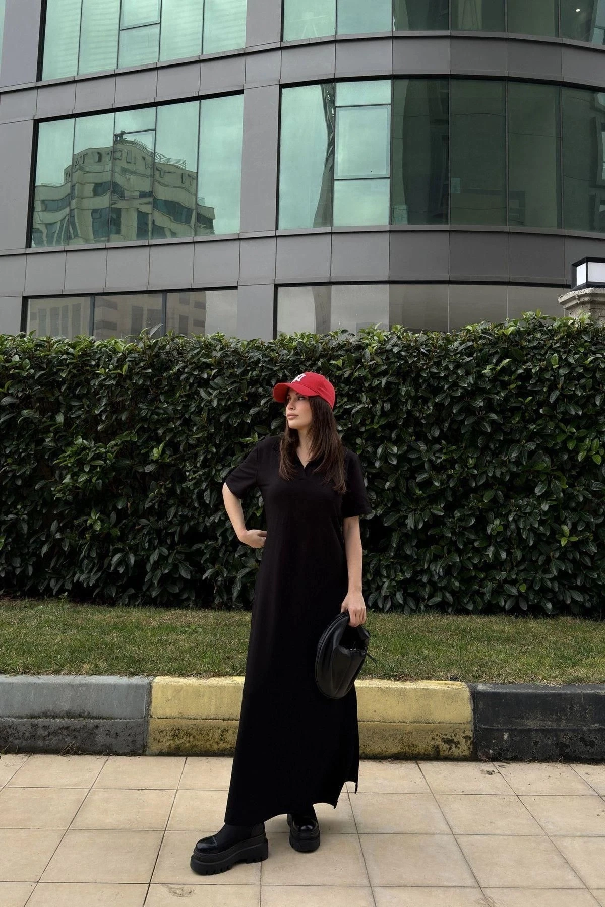 Kadın Siyah Polo Yaka, Kısa Kol, Yırtmaçlı, Basic Model, Uzun Salaş Elbise