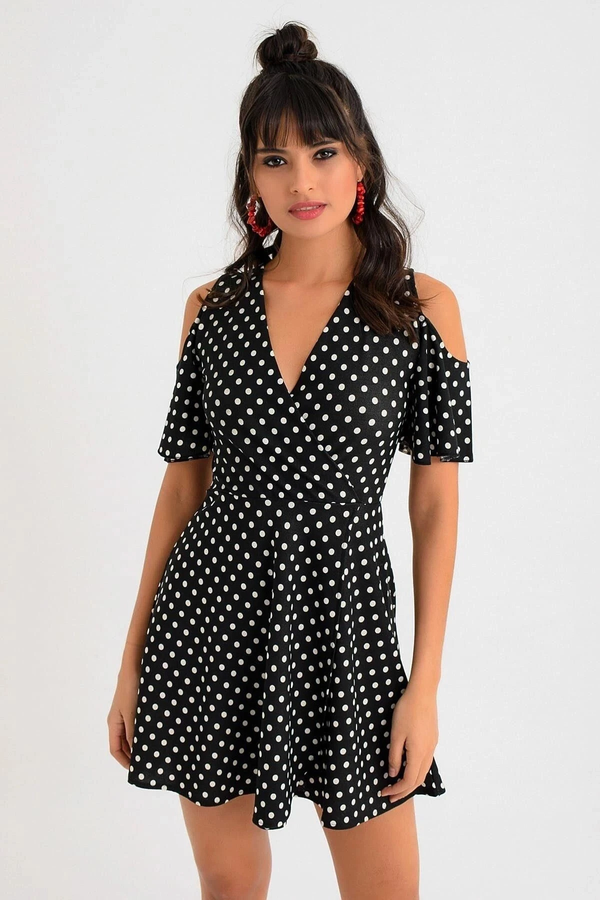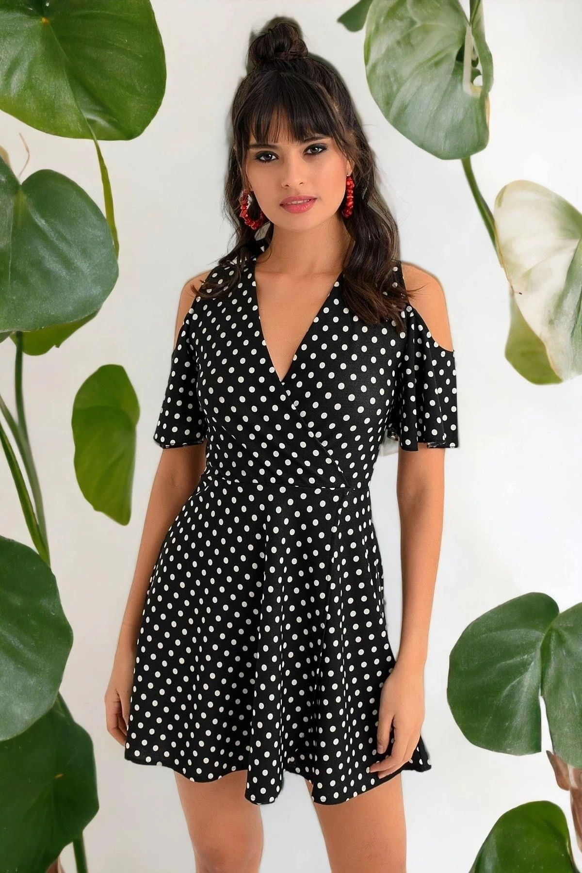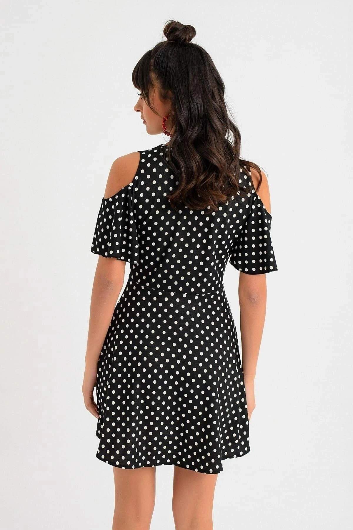 Harika bir seçim yaptınız! Siyah Renk Puantiyeli Kaliteli Kumaş Kruvaze Yaka Kısa Kol Omuz Dekolteli Elbise, sizi göz kamaştıracak ve tarzınızı tamamlayacak bir parçadır.; Bu elbise, mükemmel kesimiyle vücudunuzu kusursuz bir şekilde sarar ve sizi şık bir görünüme kavuşturur.; Kumaş içeriği, %95 Polyester ve %5 Elestane'den oluşur, bu da size hem dayanıklılık sağlar hem de hareket özgürlüğü sunar.; Polyester, elbisenin kalitesini ve dayanıklılığını artırırken, elastan esnekliği ve konforu sağlar.; Bu kumaş kombinasyonu, gün boyu rahat etmenizi ve elbisenin orijinal formunu korumasını sağlar.; Elbisenin siyah renkli olması, klasik ve zarif bir seçimdir.; Siyah her zaman şıklığı temsil eden bir renk olarak bilinir ve herhangi bir etkinlikte veya özel bir gece planında size sofistike bir görünüm kazandırır.; Puantiyeli desen ise, elbisenin üzerine hareket ve canlılık katarken, stilinizi daha da çarpıcı hale getirir.; Kruvaze yaka ve omuz dekolteli tasarım, göz alıcı bir detaydır.; Bu özellikler, size feminen ve şık bir görünüm verirken, omuzlarınızı ve dekoltenizi zarif bir şekilde vurgular.; Düz kesim ve mini kısa boyu ise modern bir tarzı yansıtırken, bacaklarınızı güzel bir şekilde sergiler.; Bu kaliteli kumaşa ve şık tasarıma sahip olan siyah renkli puantiyeli elbise, herhangi bir özel etkinlik, gece daveti veya partide dikkat çekmenizi sağlayacak.; Kendinizi özgüvenle taşımanızı sağlayacak ve tarzınızı en iyi şekilde yansıtmanızı sağlayacak bu elbiseye sahip olmak için hemen sepetinize ekleyin!