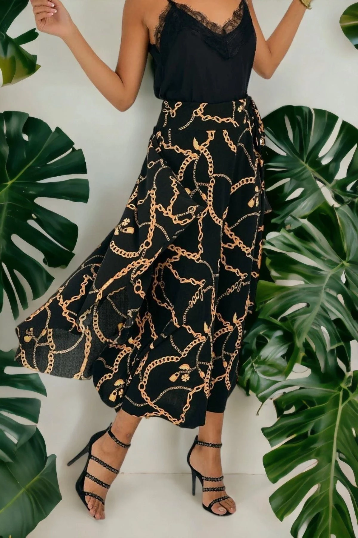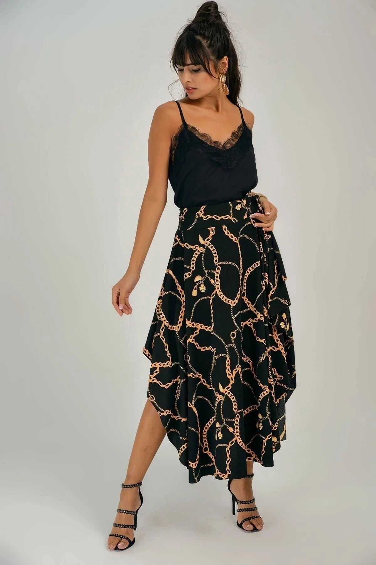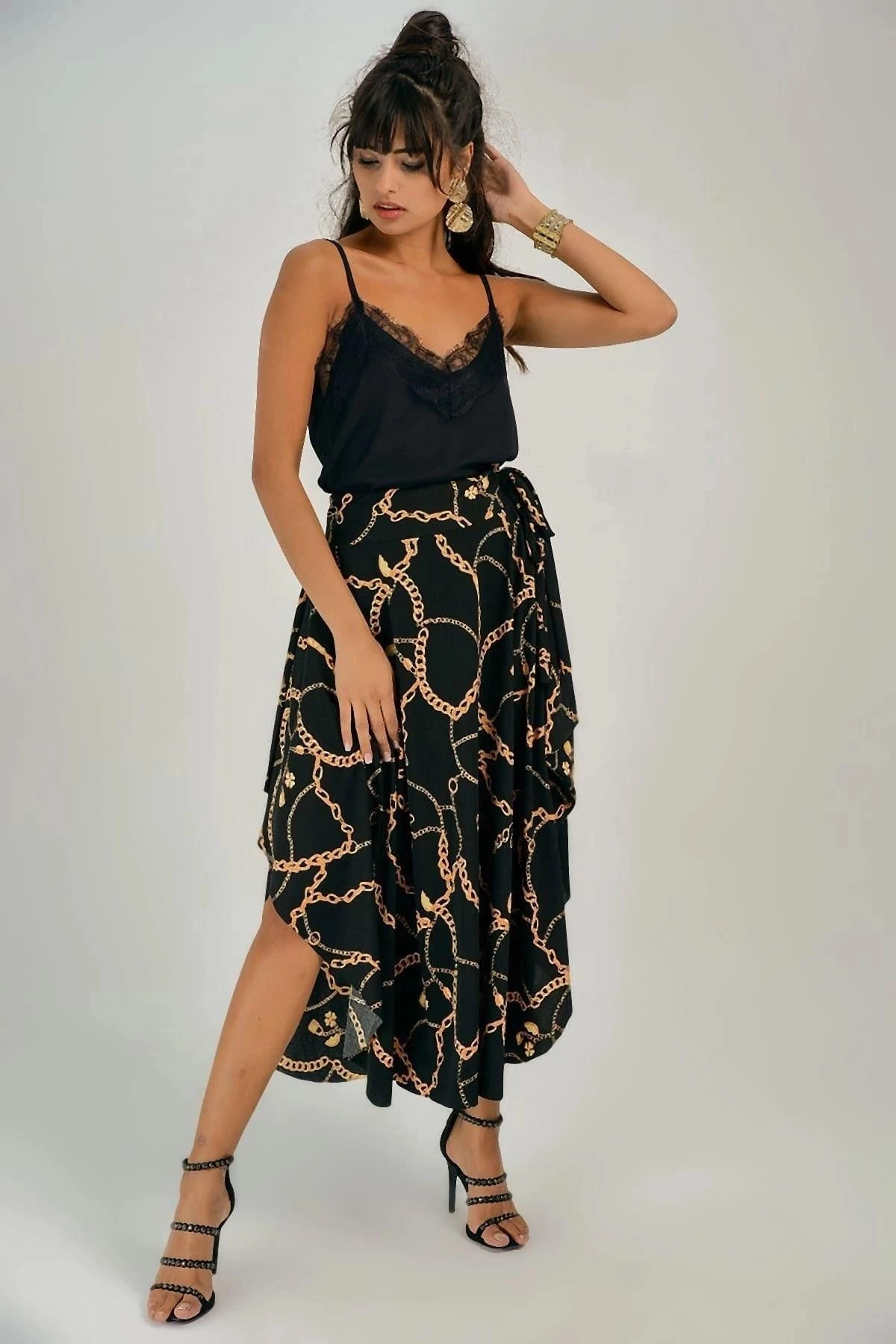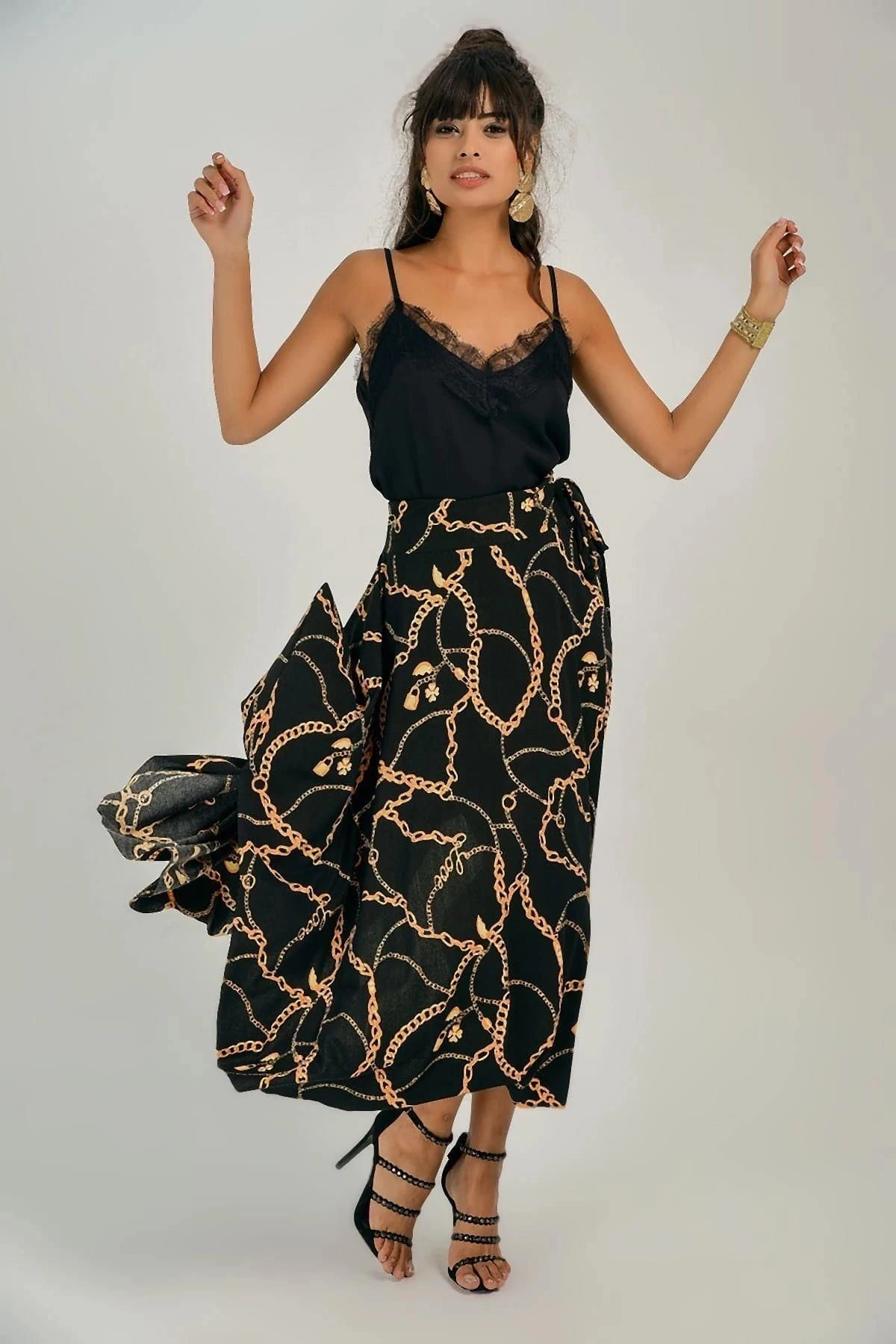 Bu siyah renk rahat zincir desenli regular kesim midi boy etek, şıklığı ve rahatlığı bir araya getiren mükemmel bir seçenektir.; Eteğin kumaşı, %95 polyester ve %5 elastan içeriğiyle yüksek kaliteli ve esnek bir yapıya sahiptir.; Kumaşının dokusu, yumuşaklığıyla cildinizi nazikçe kucaklar, aynı zamanda hafif bir esneklik sunarak hareket özgürlüğü sağlar.; Bu sayede, gün boyu konforlu bir şekilde eteği giyebilir ve hareket edebilirsiniz.; Siyah renk, her zaman şıklığın ve zarafetin sembolü olmuştur.; Bu etek, klasik siyah rengiyle her türlü kombinasyona uyum sağlar ve her durumda tarzınızı tamamlar.; Zarif bir gece daveti için veya gündelik bir iş ortamında rahatlıkla tercih edebileceğiniz bir parçadır.; Eteğin tasarımında kullanılan zincir desenleri, modern ve şık bir görünüm sunar.; Bu detaylar, eteği sıradanlıktan çıkarır ve stilinizi vurgular.; Zincir desenleri, eteğe dinamik bir hava katarak dikkat çekici bir görünüm elde etmenizi sağlar.; Regular kesim, çoğu vücut tipine uyum sağlar ve vücudu saran ancak sıkı olmayan bir şekil sunar.; Bu, eteği giyen kişiye rahat bir his verirken, aynı zamanda vücut hatlarınızı da ön plana çıkarır.; Midi boy uzunluğu, dizlerin biraz üstünde biten bir kesimi ifade eder.; Bu uzunluk, hem şıklığı hem de kullanışlılığı bir araya getirir.; Hem formel hem de günlük giyimde tercih edebileceğiniz çok yönlü bir parçadır.; Bu siyah renk rahat zincir desenli regular kesim midi boy eteği, herhangi bir gardıropta vazgeçilmez bir parça haline getirecek.; Hem stil sahibi olmanızı sağlayacak hem de rahatlığınızı düşünen bir seçenektir.; Her durumda şık ve özgün görünmek için ideal bir tercihtir.