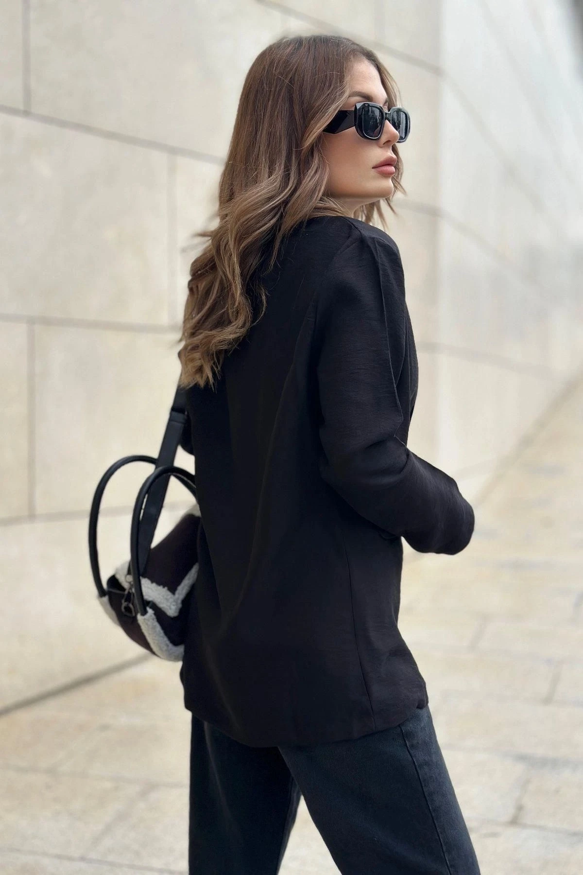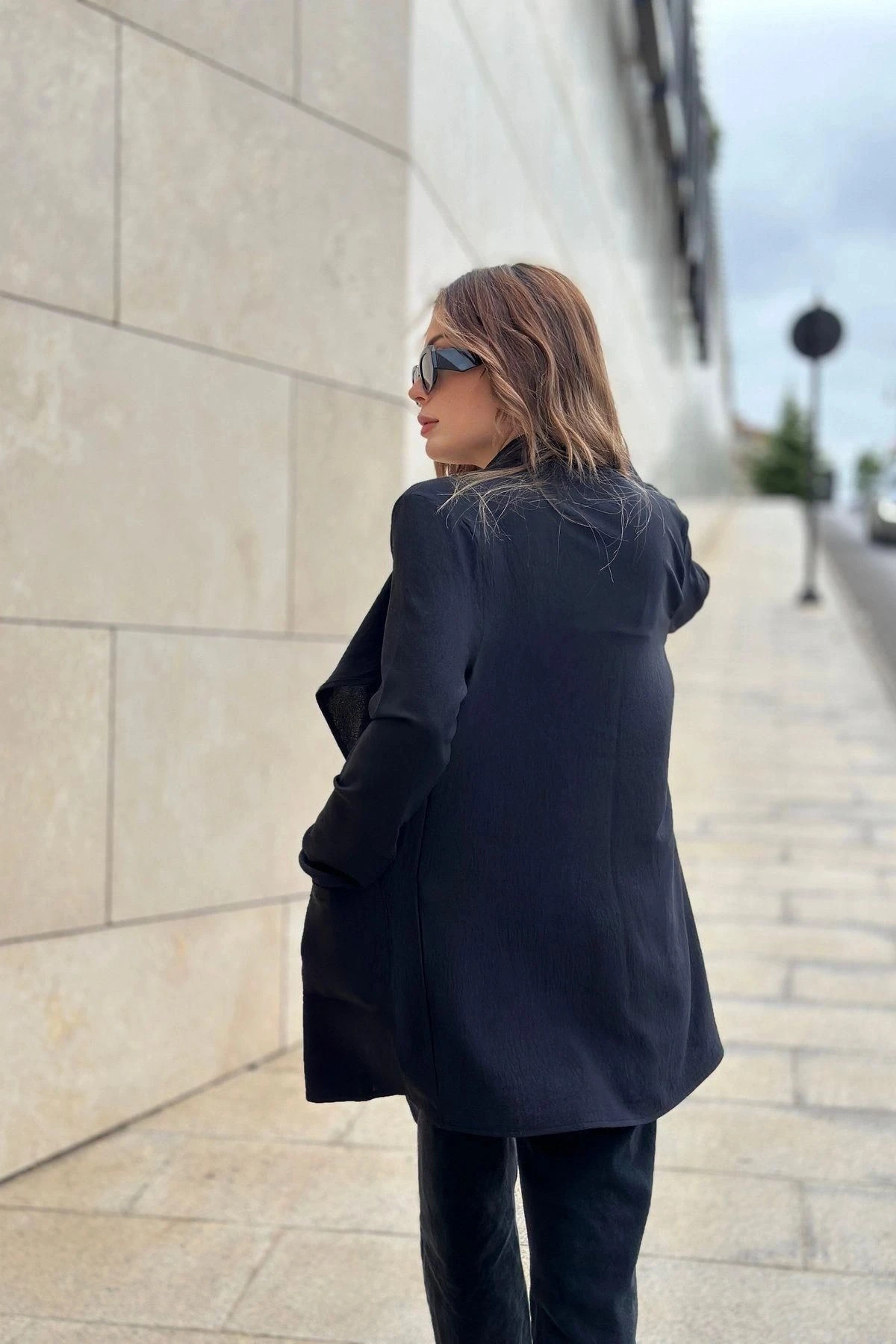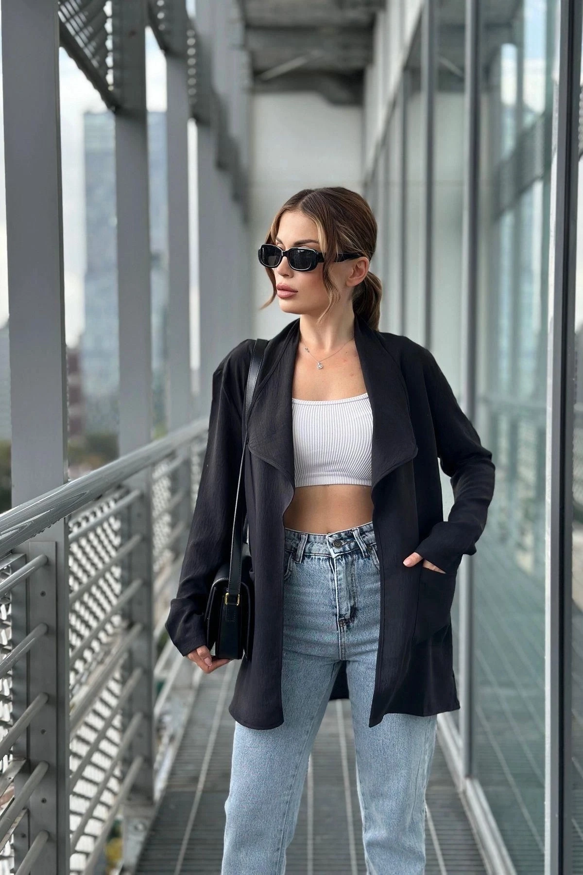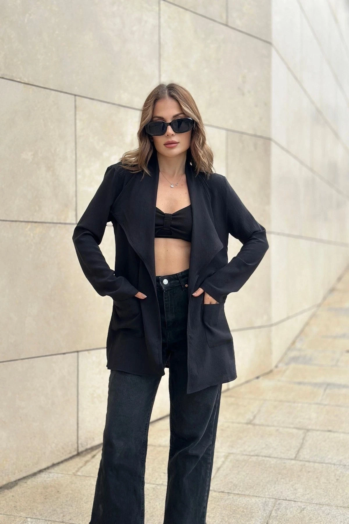 Kadın Siyah Şal Yaka, Uzun Kol, Cepli, Düğmesiz Ceket