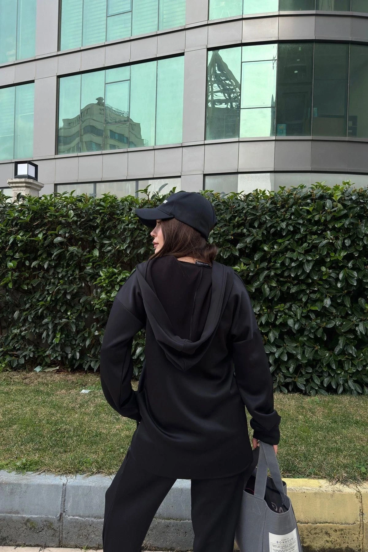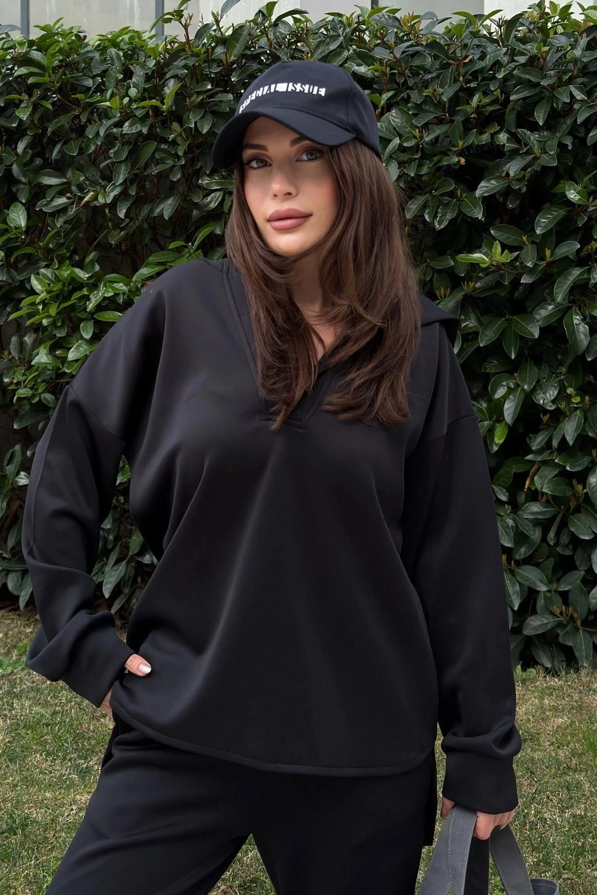 Kadın Siyah Scuba Kumaş, Salaş Kesim, Kapüşonlu Sweatshirt Bluz