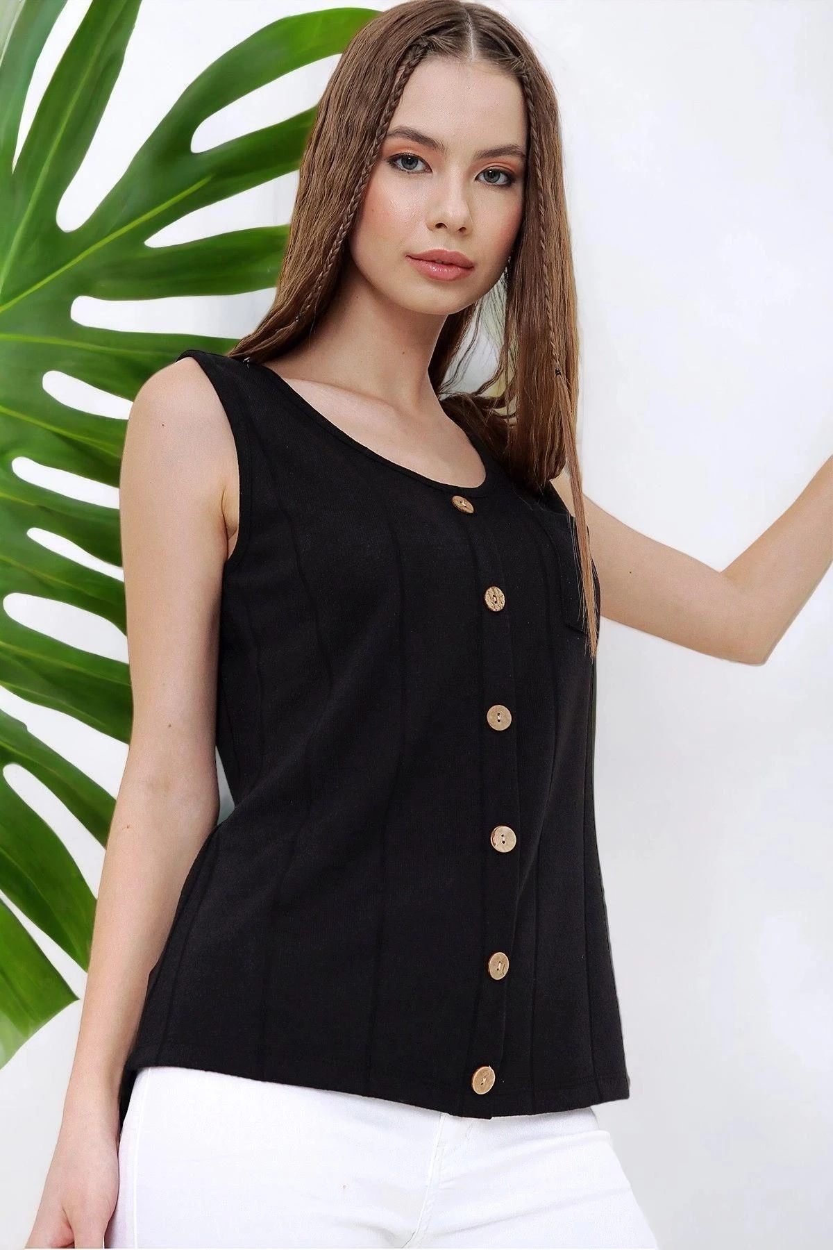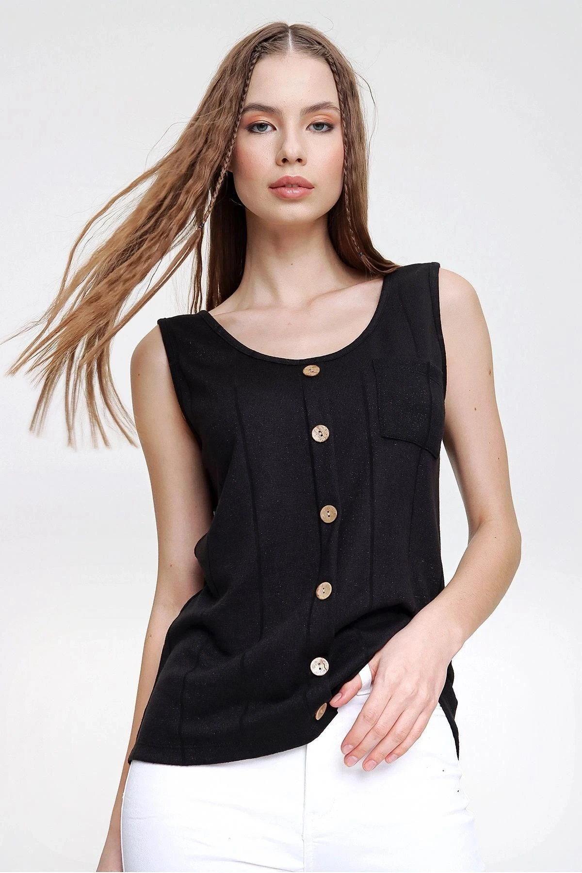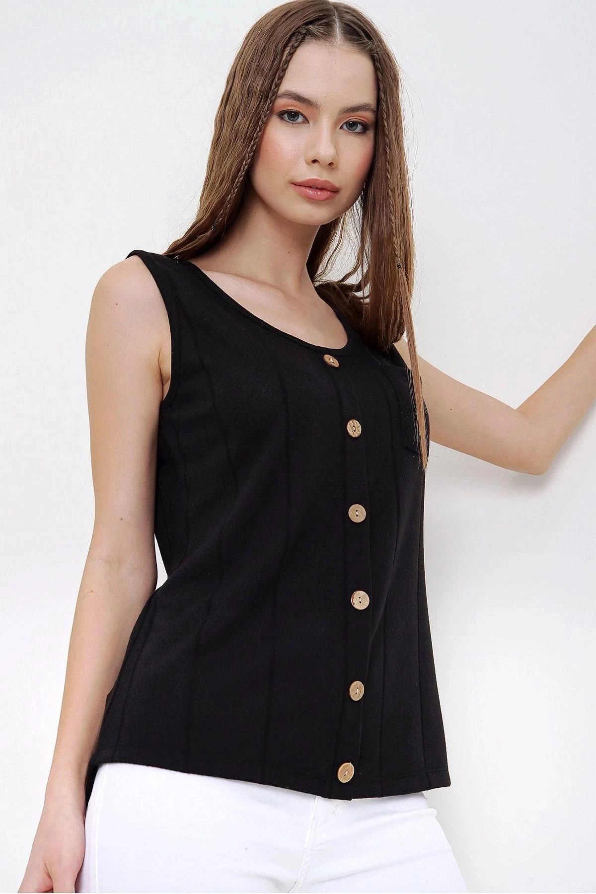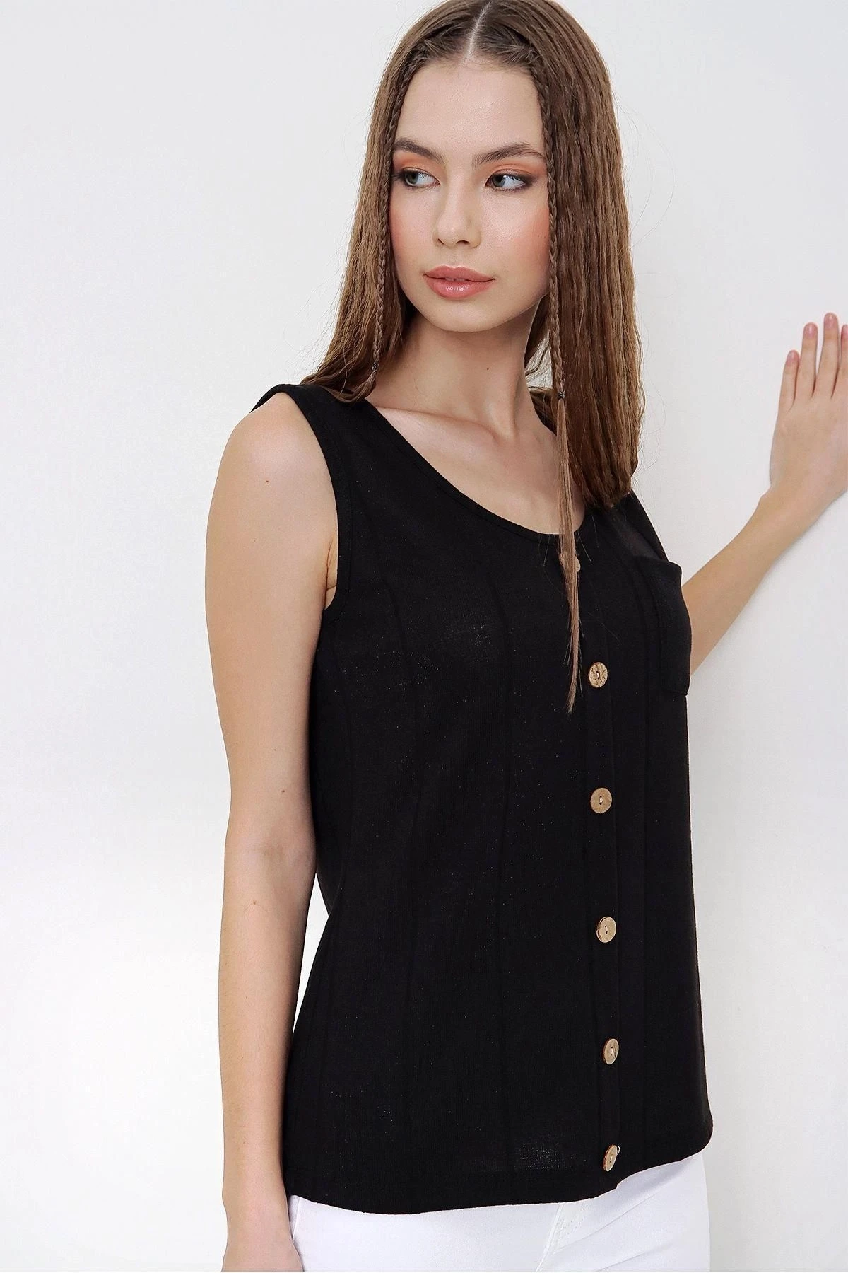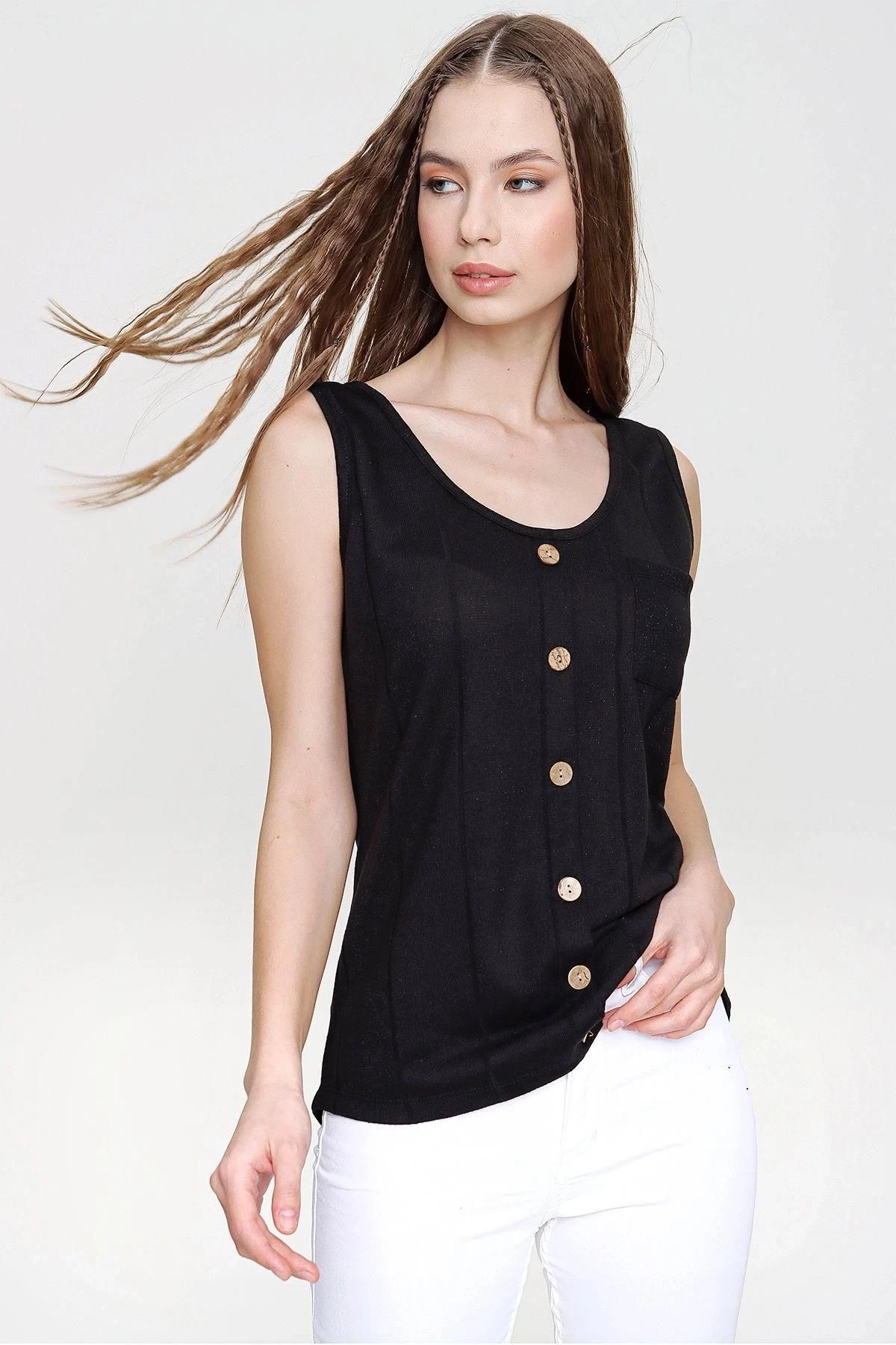 Bu özel bluz, şıklık ve konforu bir araya getiren mükemmel bir seçenektir.; Siyah renkli, sıfır kol detaylı ve regular kesimli olan bu bluz, standart boyutta ve askılı bir tasarıma sahiptir.; Kumaş içeriği %50 polyester ve %50 akrilikten oluşur, bu da bluza dayanıklılık ve esneklik sağlar.; Polyesterin nefes alabilir özelliği ve akrilikin yumuşak dokusu, size gün boyu rahatlık sunar.; Ayrıca, kumaşın kaliteli yapısı, uzun ömürlü kullanım sağlar.; Bluzun siyah rengi, şıklığı ve zamanlara meydan okuyan tarzıyla her türlü kombinle mükemmel uyum sağlar.; Siyah, zamansız bir renk olduğu için herhangi bir mevsimde veya herhangi bir etkinlikte giymek için idealdir.; Düğme detayları, bluza sofistike bir dokunuş katar.; Zarif düğmeler, bluzun ön kısmında şık bir vurgu yapar ve tasarıma hoş bir ayrıntı katar.; İnce örme triko yapısı, bluzun hafif ve ince olmasını sağlar.; Bu özellik, bluzu katmanlı bir stil için mükemmel hale getirir.; Üzerine ceket veya hırka giyebilir ve farklı kombinasyonlar oluşturabilirsiniz.; Bu bluz, herhangi bir gardıropta olması gereken temel bir parçadır.; Şık tasarımı ve mükemmel kalitesiyle her durumda size eşlik eder.; Gündelik veya özel etkinliklerde, iş veya gece hayatında, bu bluzla her zaman stil sahibi görüneceksiniz.; Bu bluz, kumaşının kalitesi, şık tasarımı ve rahatlığıyla öne çıkan bir seçenektir.; Gardırobunuzda şık ve çok yönlü bir parça arıyorsanız, bu bluzu tercih edebilirsiniz.