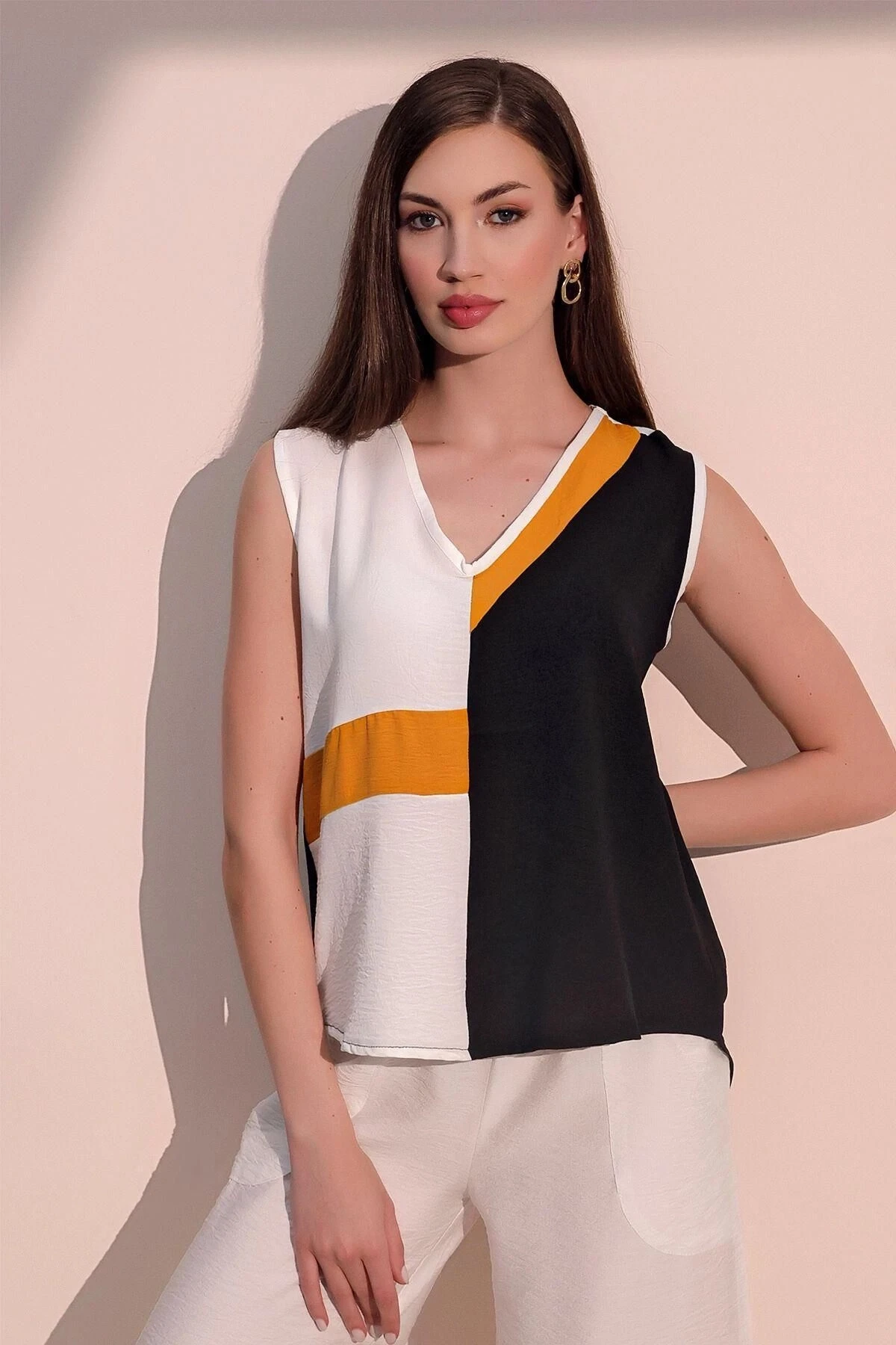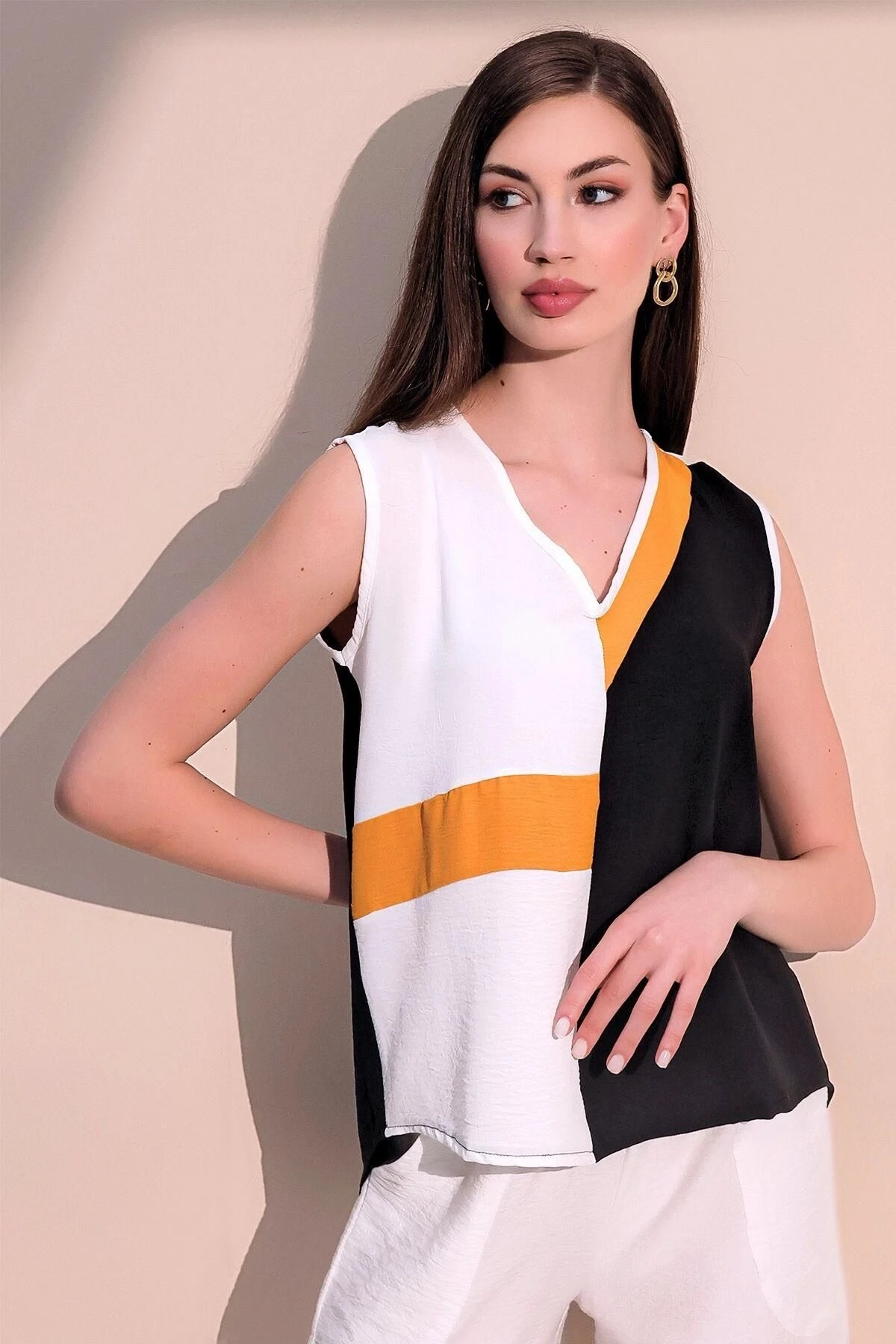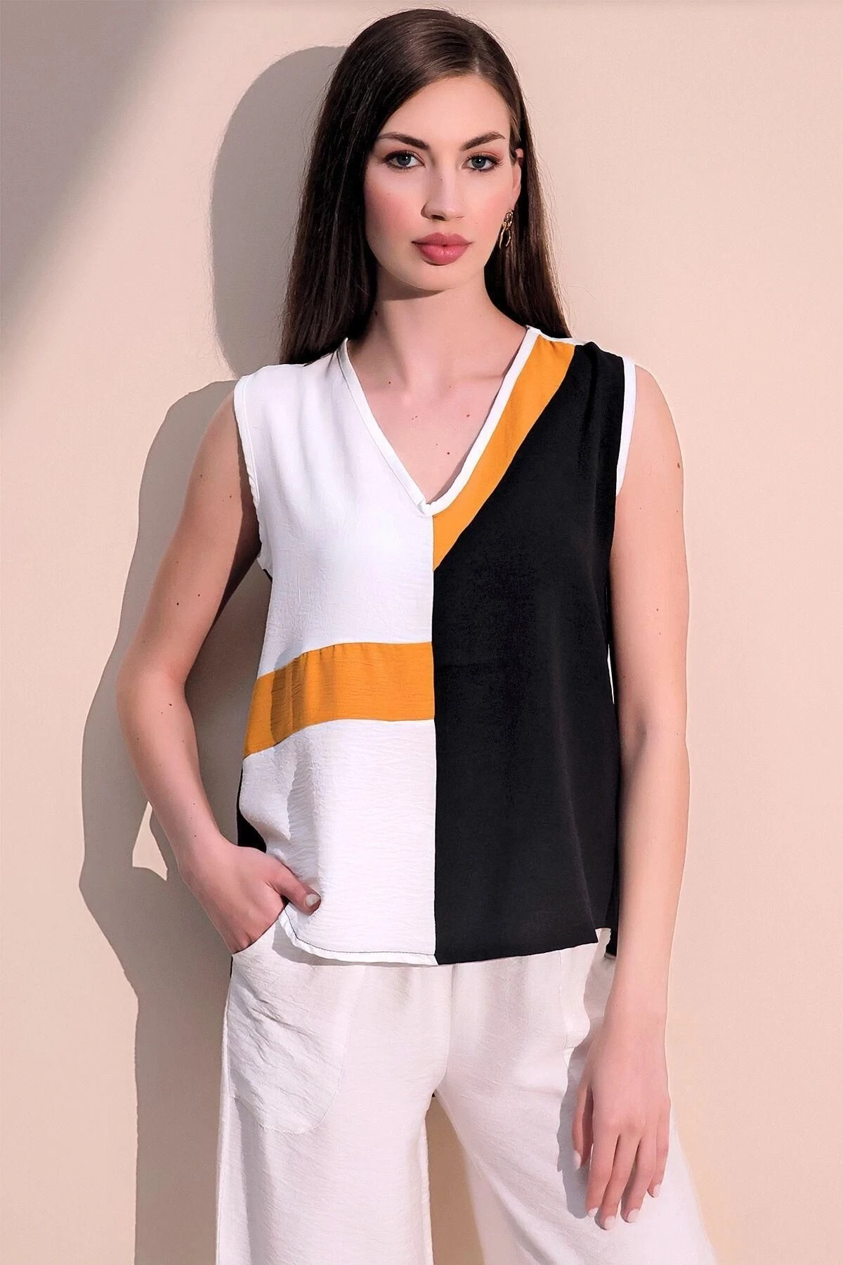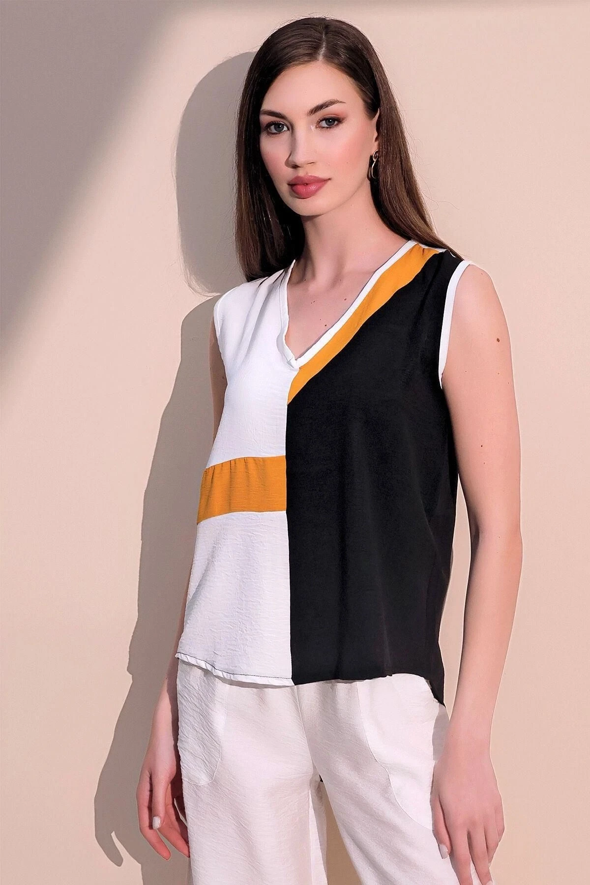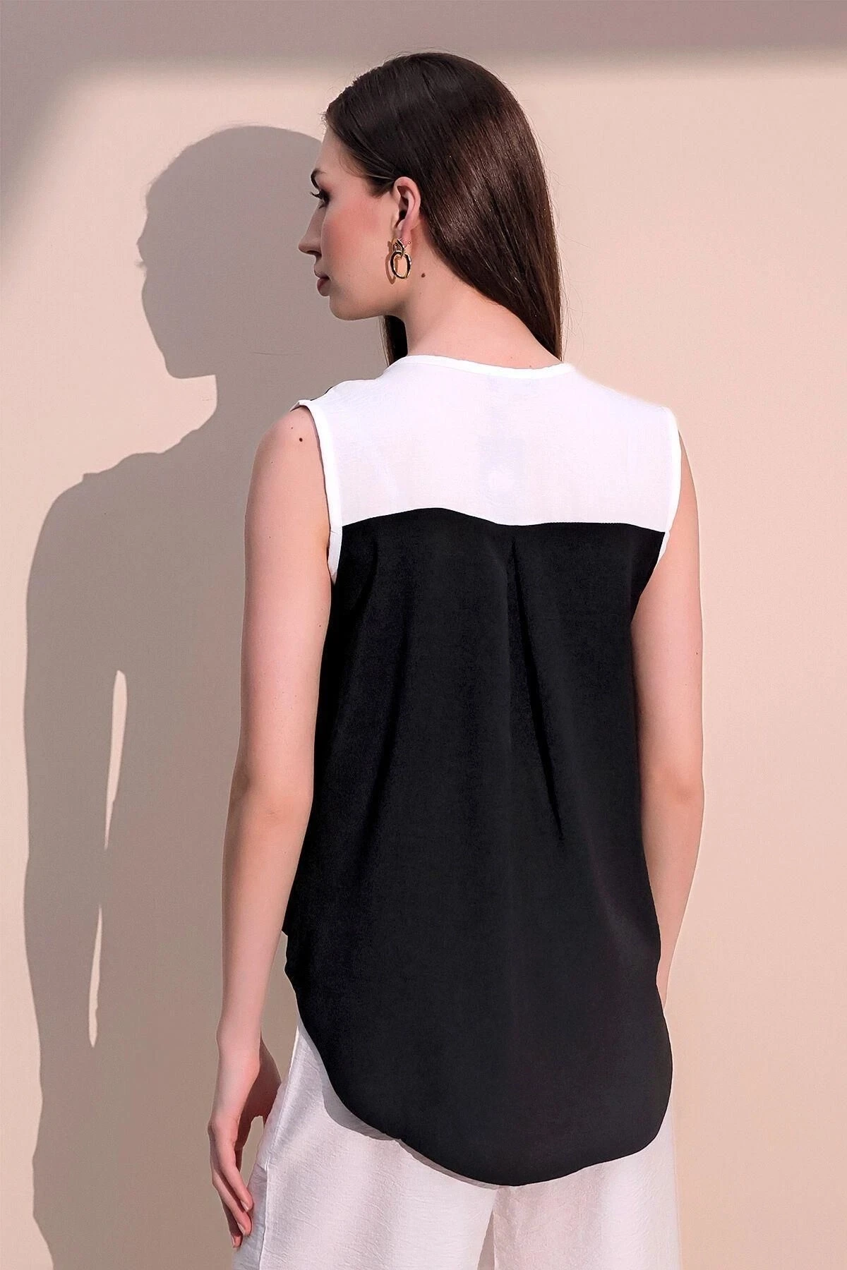Kadın Siyah Şık V Yaka Renk Bloklu Airobin Sıfır Kol Bluz