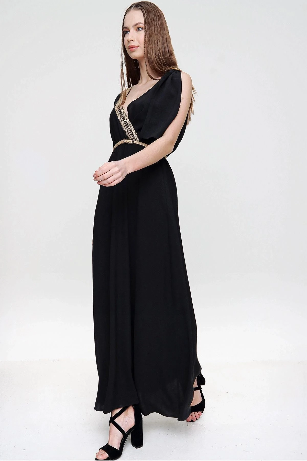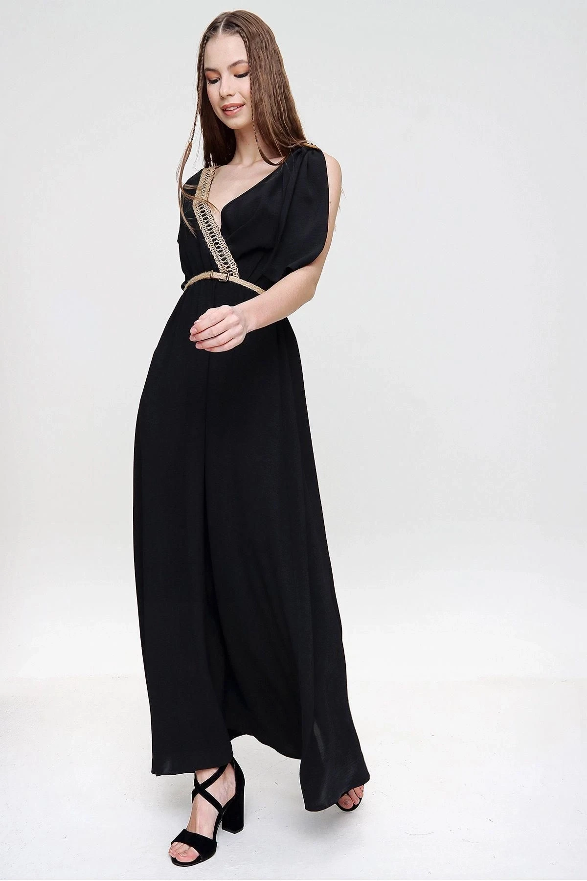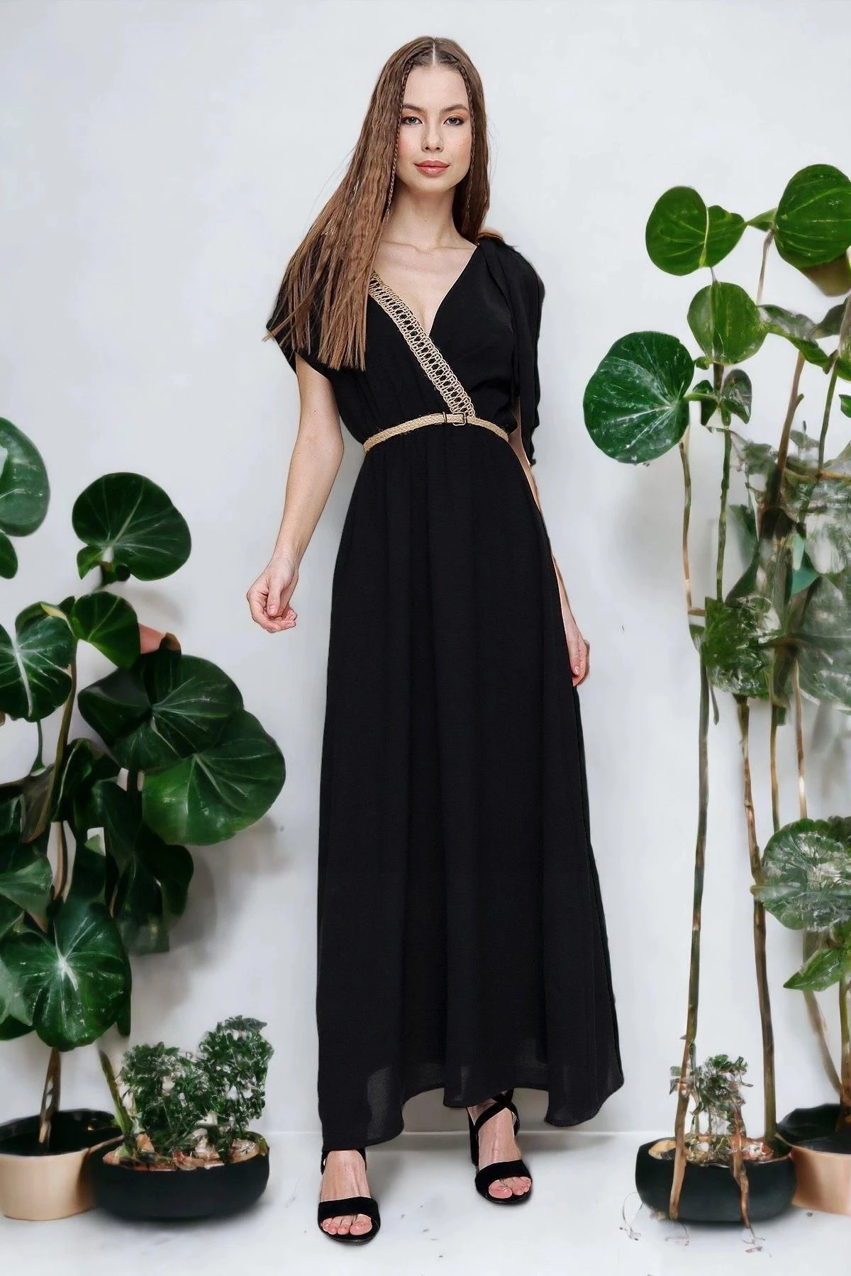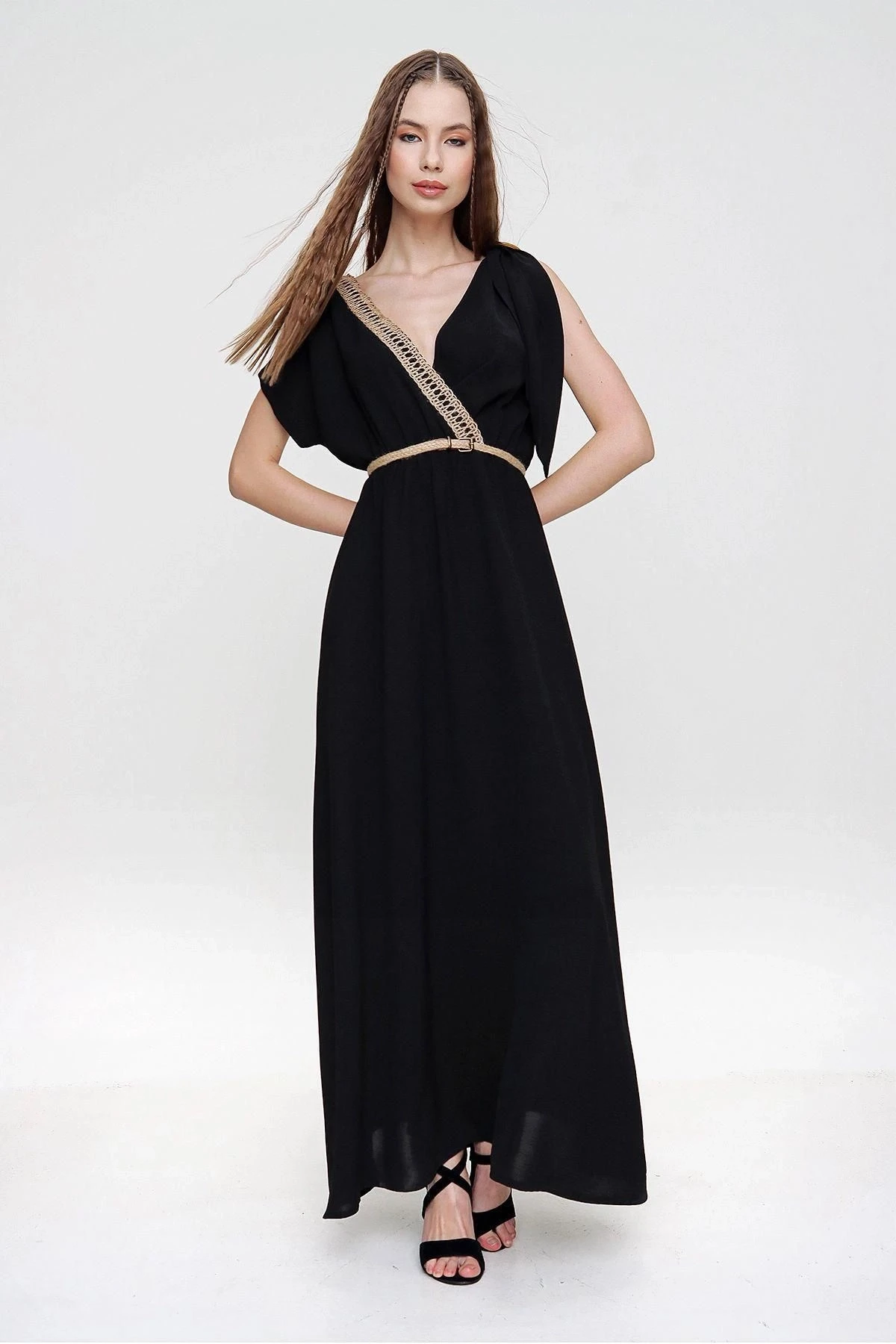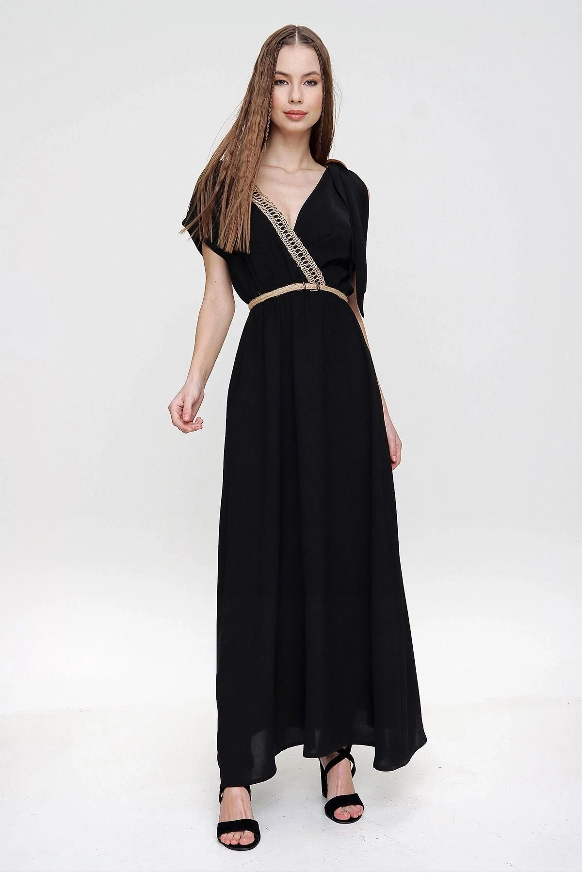 Bu siyah renkteki uzun elbise, şık ve rahat bir stil sunarak günlük kullanıma uygun bir seçenektir.; Elbisenin detayları, omuzlardaki hasır detaylar ve beldeki tokayla tamamlanan büzgülü tasarımıyla dikkat çeker.; Elbisenin kruvaze kesimi, vücut hatlarını kusursuz bir şekilde takip ederken, salaş kesimi sayesinde rahat bir kullanım sağlar.; Kısa kollu olması, elbisenin hafif ve yaz aylarına uygun bir parça olduğunu gösterir.; Sırt ve göğüs bölgesindeki hasır dekolteler, şık bir dokunuş ekleyerek elbisenin feminen bir hava kazanmasını sağlar.; Bu detaylar, elbisenin sıradanlıktan uzaklaşmasına yardımcı olur.; Maksi boyuyla uzun bir görünüm sunan bu elbise, herhangi bir özel gün veya günlük giyim için mükemmel bir seçenektir.; İşte bir yürüyüşe çıkarken veya arkadaşlarınızla buluşurken şıklığınızı korumanıza yardımcı olacak bir parça.; Elbisenin kumaşı, %60 polyester ve %40 pamuk içeriğiyle kaliteli bir yapıya sahiptir.; Bu malzeme kombinasyonu, dayanıklılık sağlarken aynı zamanda rahatlık ve nefes alabilirlik sunar.; Elbisenin siyah rengi, her mevsim ve her durum için uygun olan zamanınızın ötesinde bir klasik tercihtir.; Bu siyah renkteki hasır detaylı omzu tokalı beli büzgülü airobin uzun elbise, şık, rahat ve günlük kullanıma uygun olmasıyla gardırobunuzun vazgeçilmez parçalarından biri olacak.; Herhangi bir kombinasyonla kolayca uyum sağlayan ve tarzınıza sofistike bir dokunuş katan bu elbise, her kadının dolabında bulunması gereken bir parçadır.