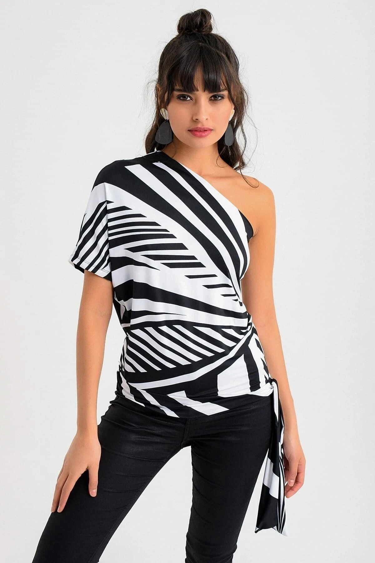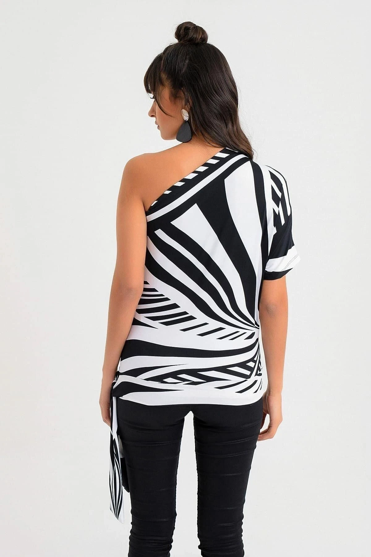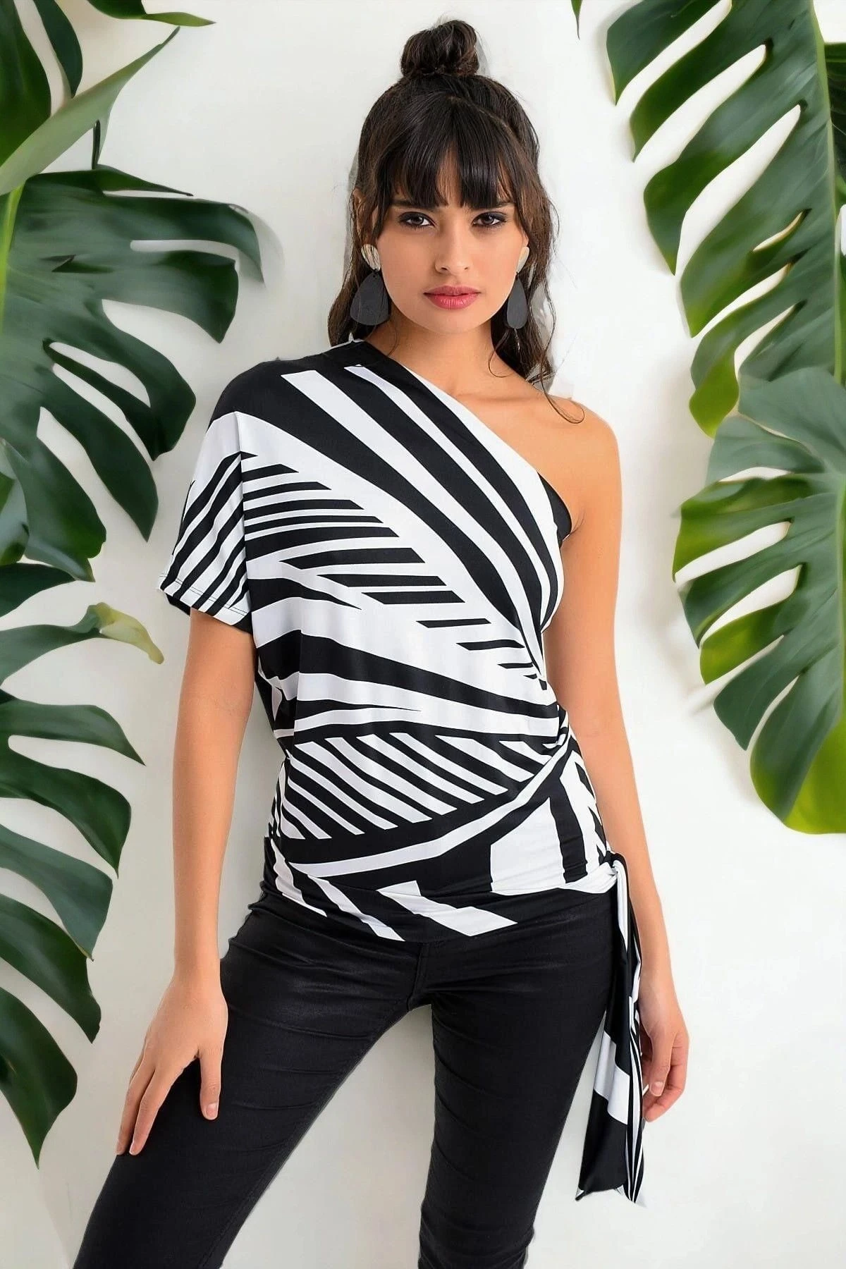 Kadın Siyah Straplez Yaka, Kısa Kol, Bağlama Detaylı, Çizgili, Regular Kesim, Standart Boy Bluz