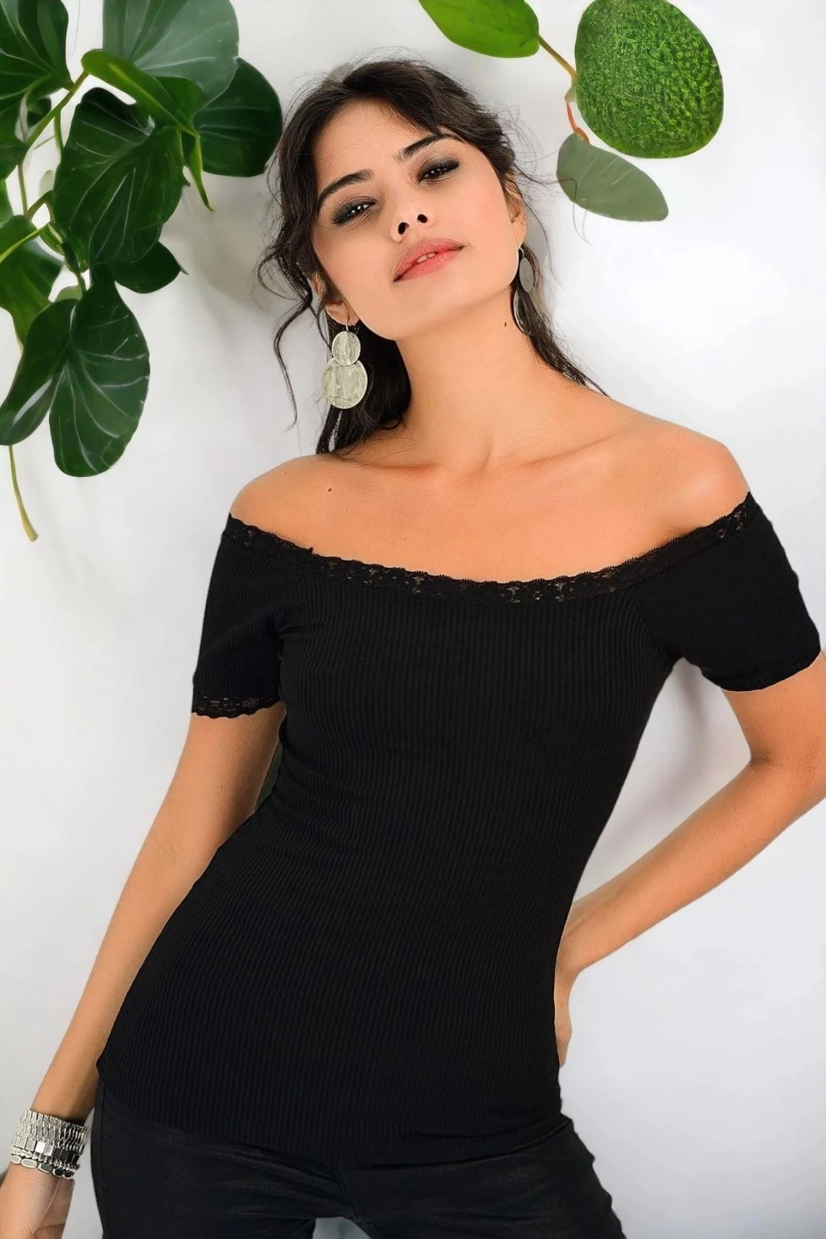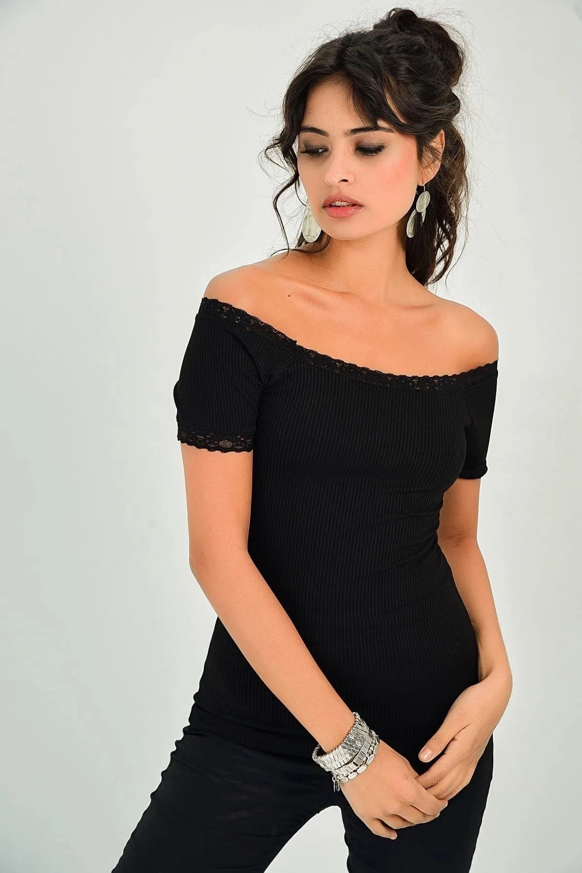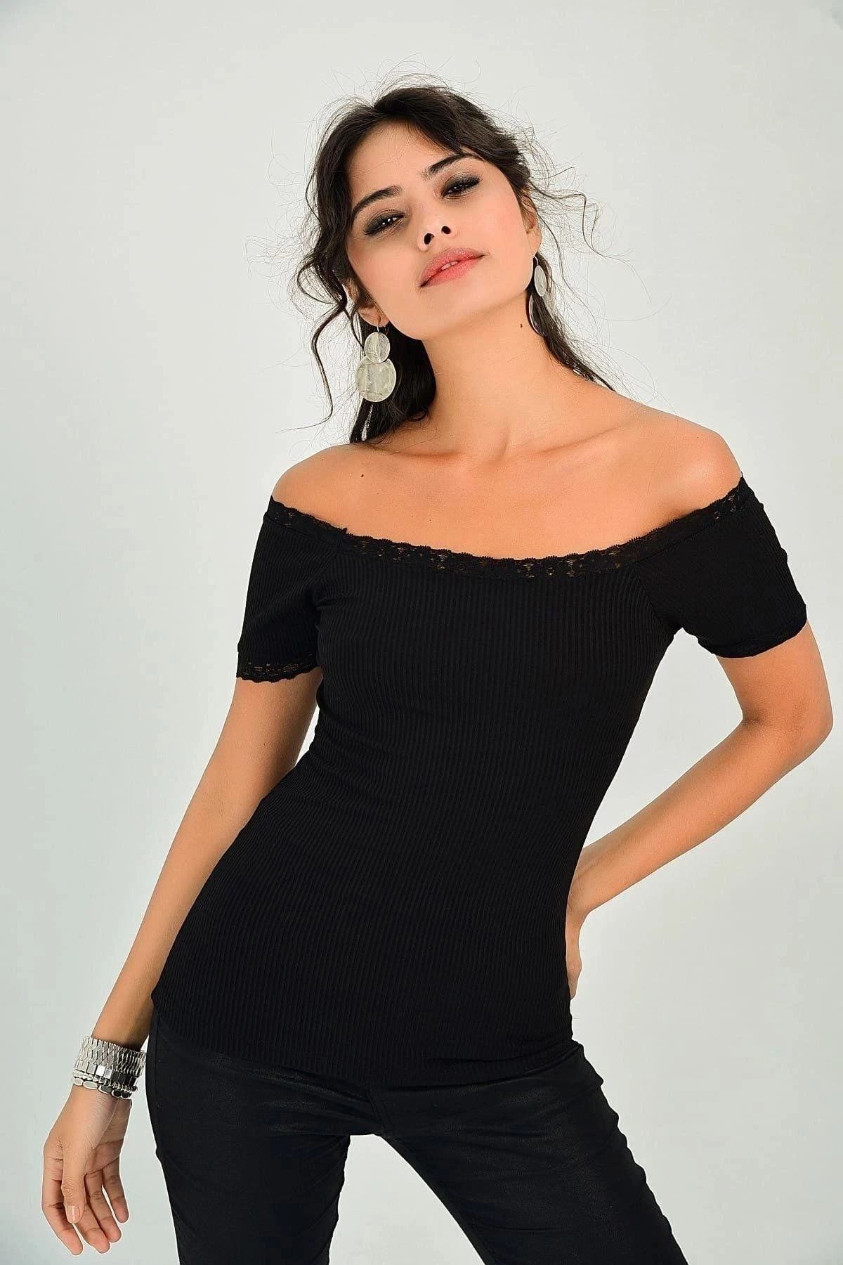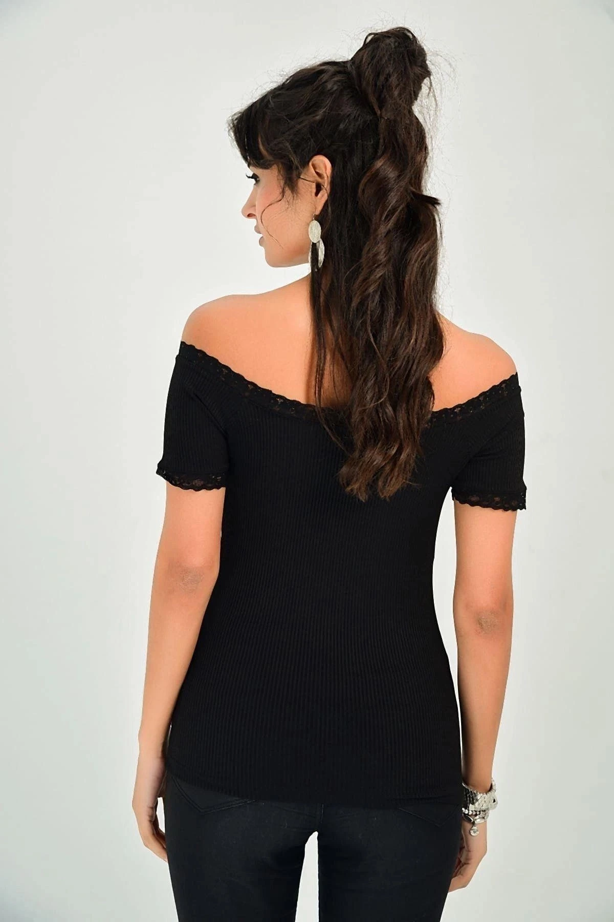 Kadın Siyah Straplez Yaka Kısa Kol, Basic Kaliteli Kumaş, Body Fit Kesim Standart Boy Bluz