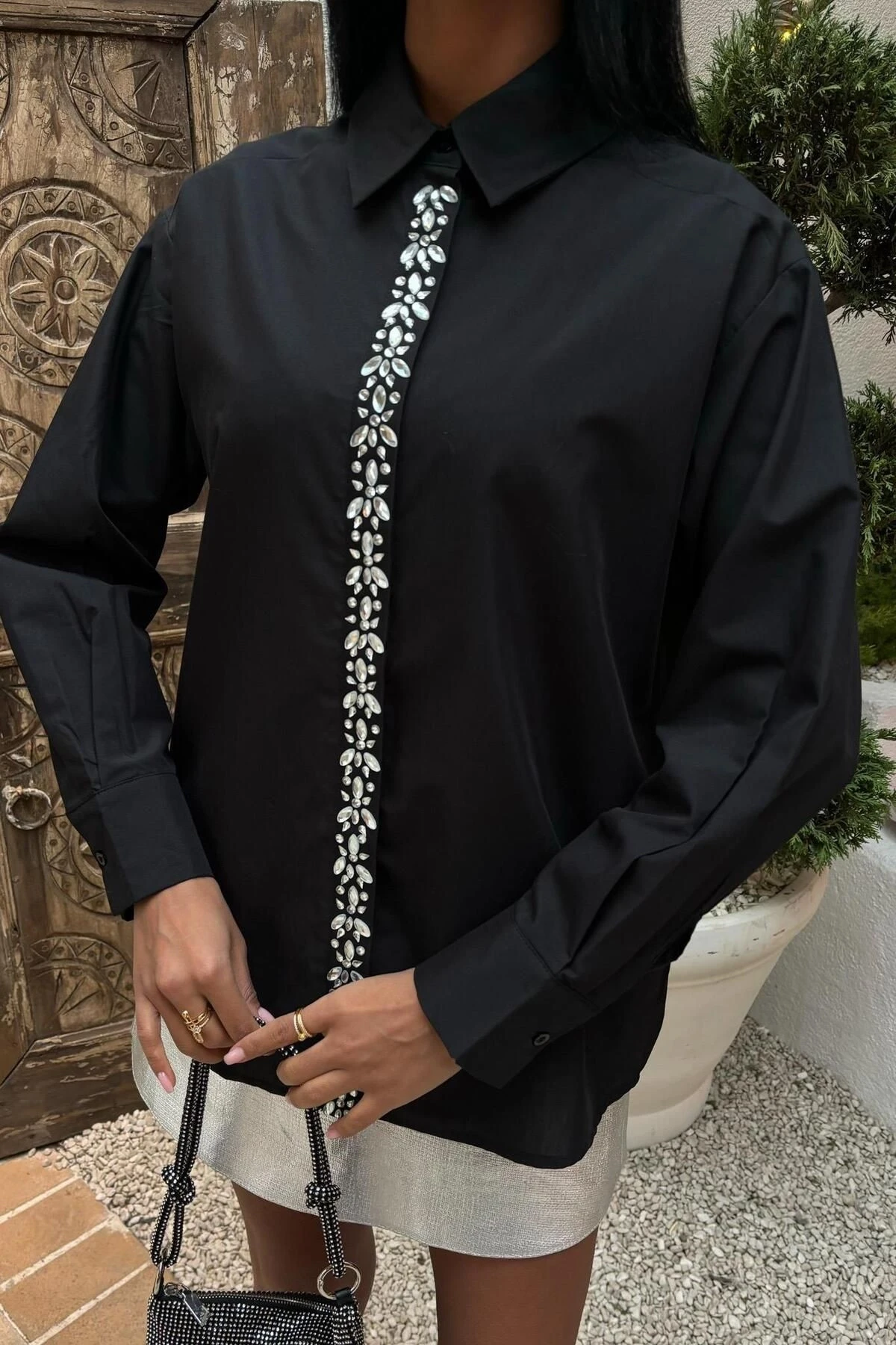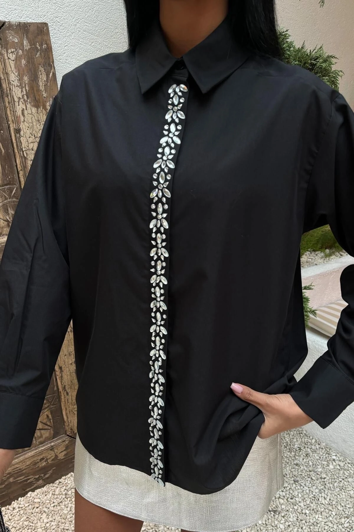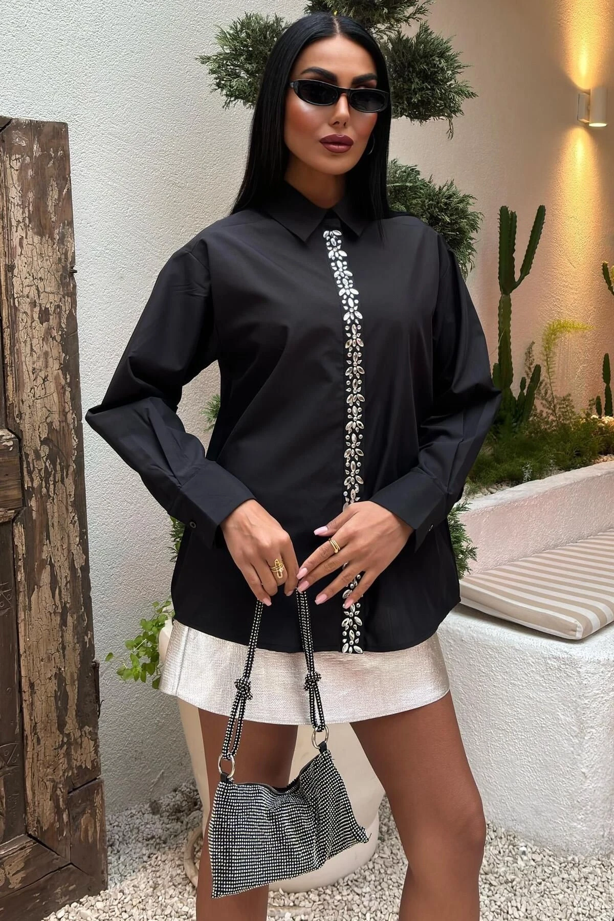 Kadın Siyah Taş Detaylı Poplin Oversize Gömlek