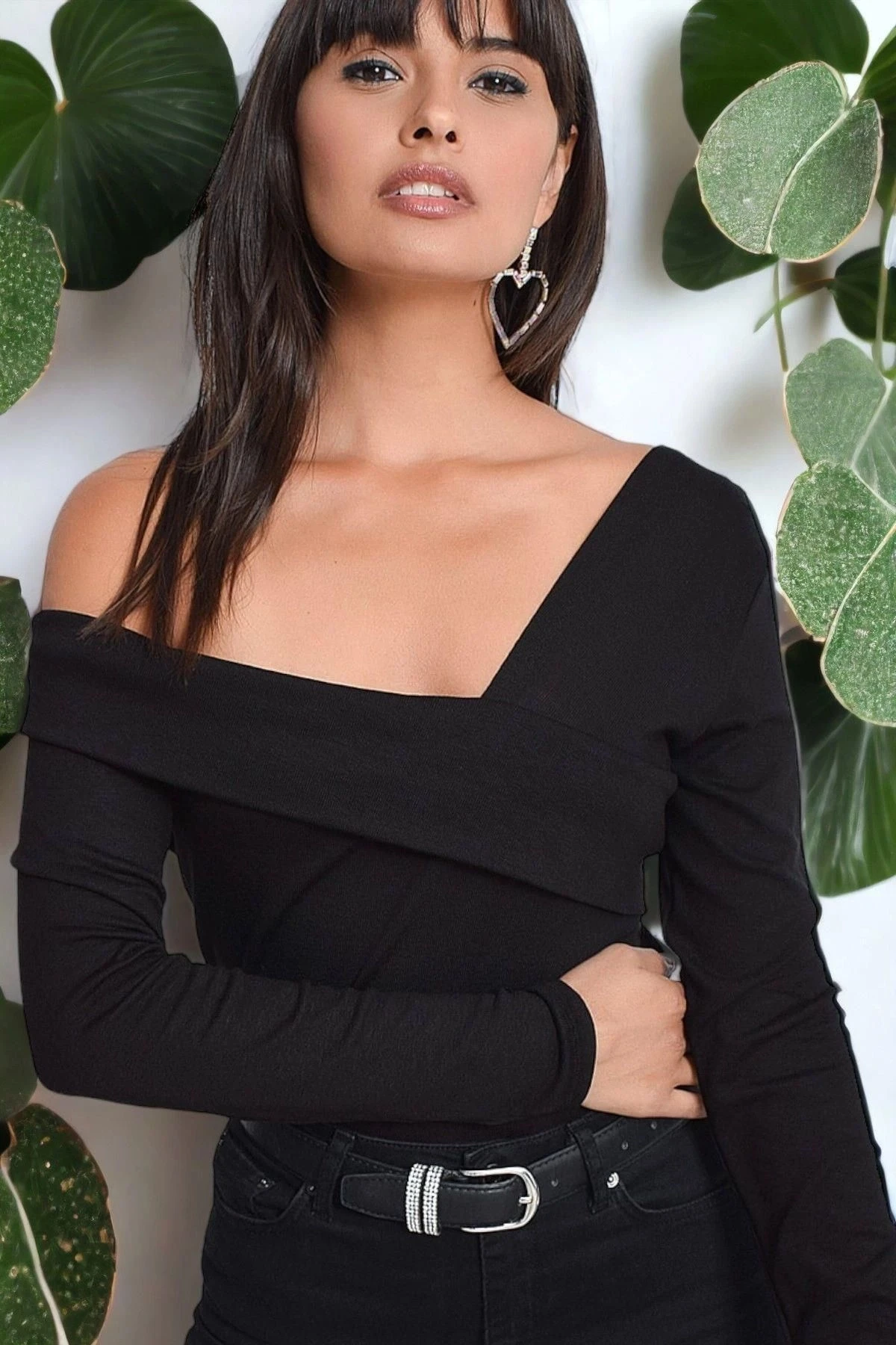 Kadın Siyah Tasarım Yaka, Uzun Kol, Omuz Dekolteli, Regular Kesim, Standart Boy Bluz