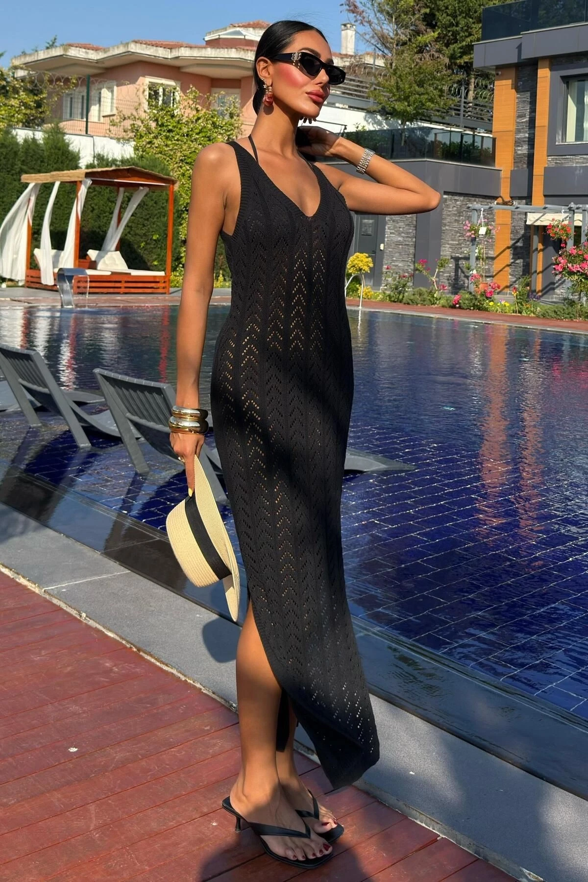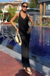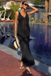 Kadın Siyah Triko Midi Kolsuz V Yaka Elbise