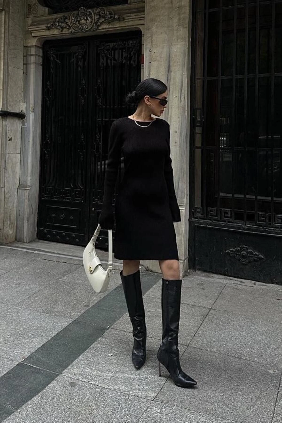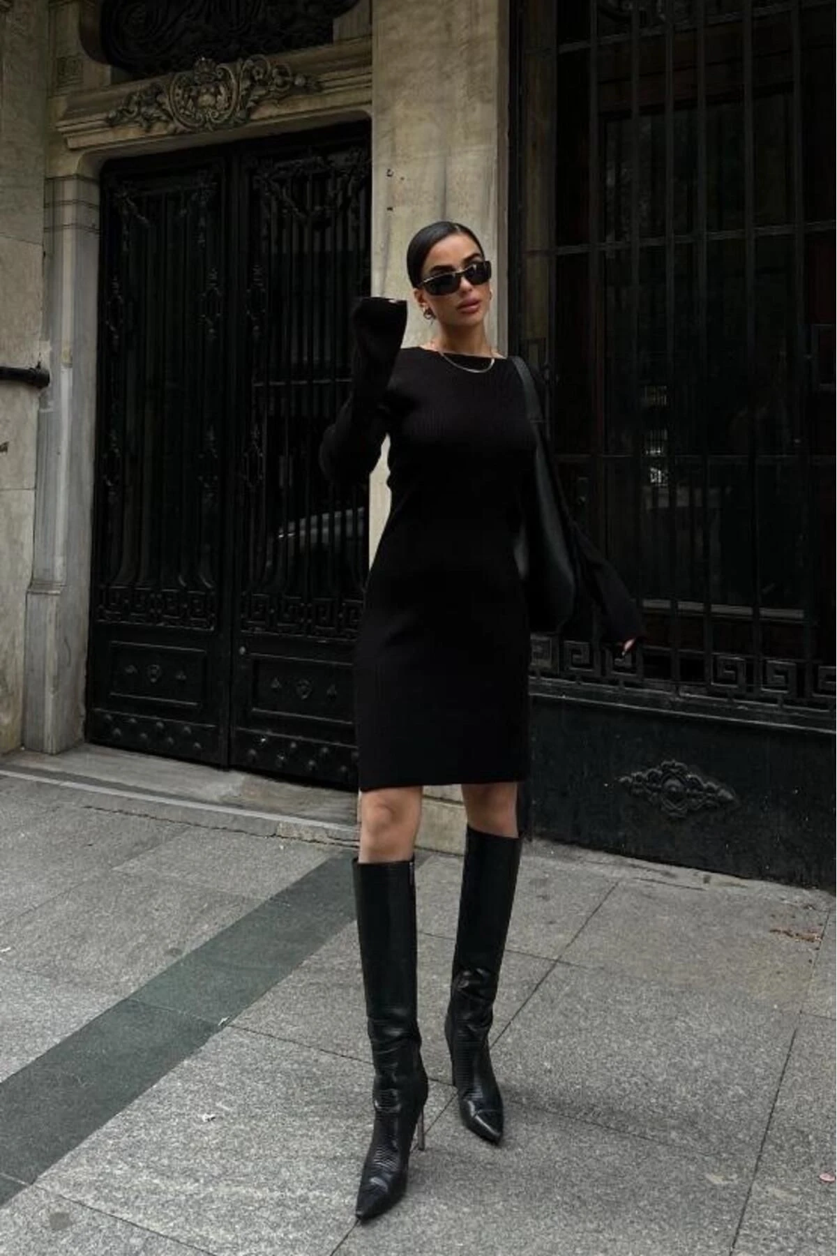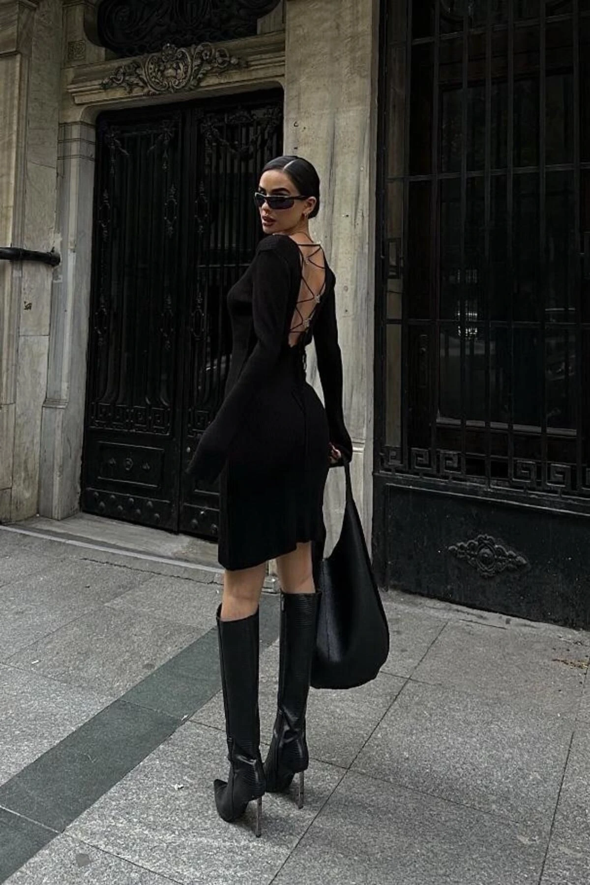 Kadın Siyah Triko Sırt Dekolteli Uzun Kol Elbise