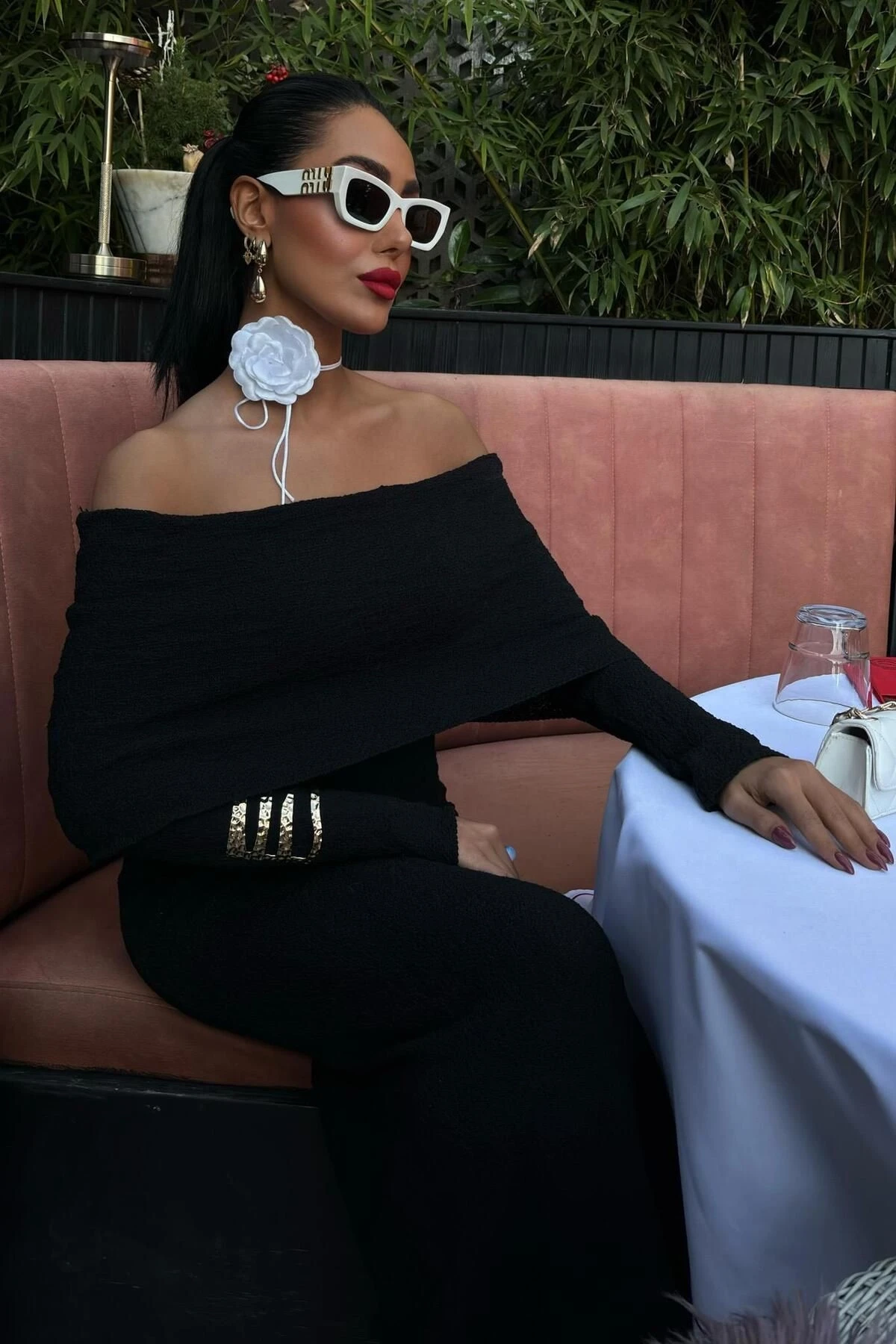 Kadın Siyah Triko Uzun Kayık Yaka Elbise