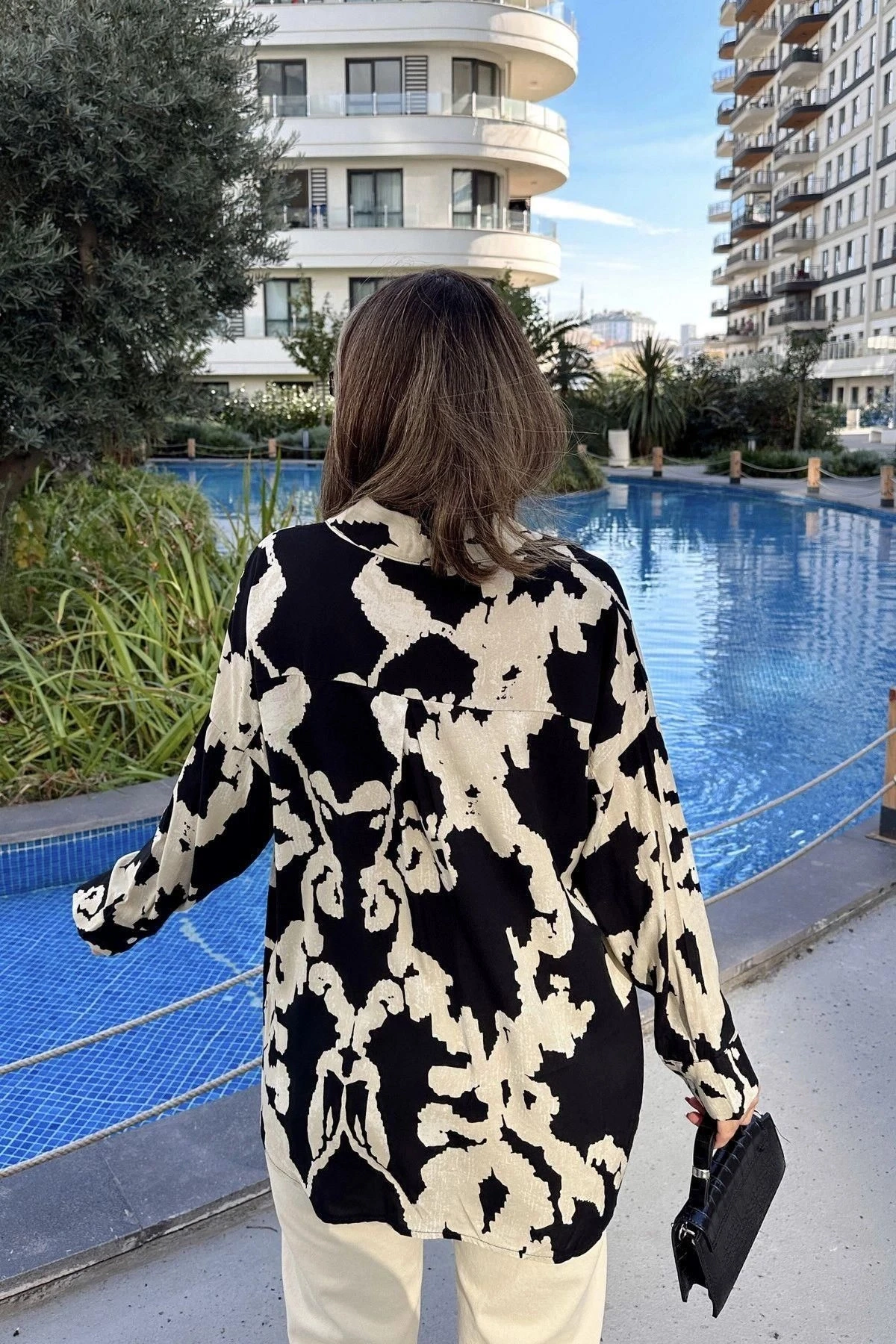 Kadın Siyah Uzun Kol, Arkası Pliseli, Salaş Dökümlü, Viskon Gömlek