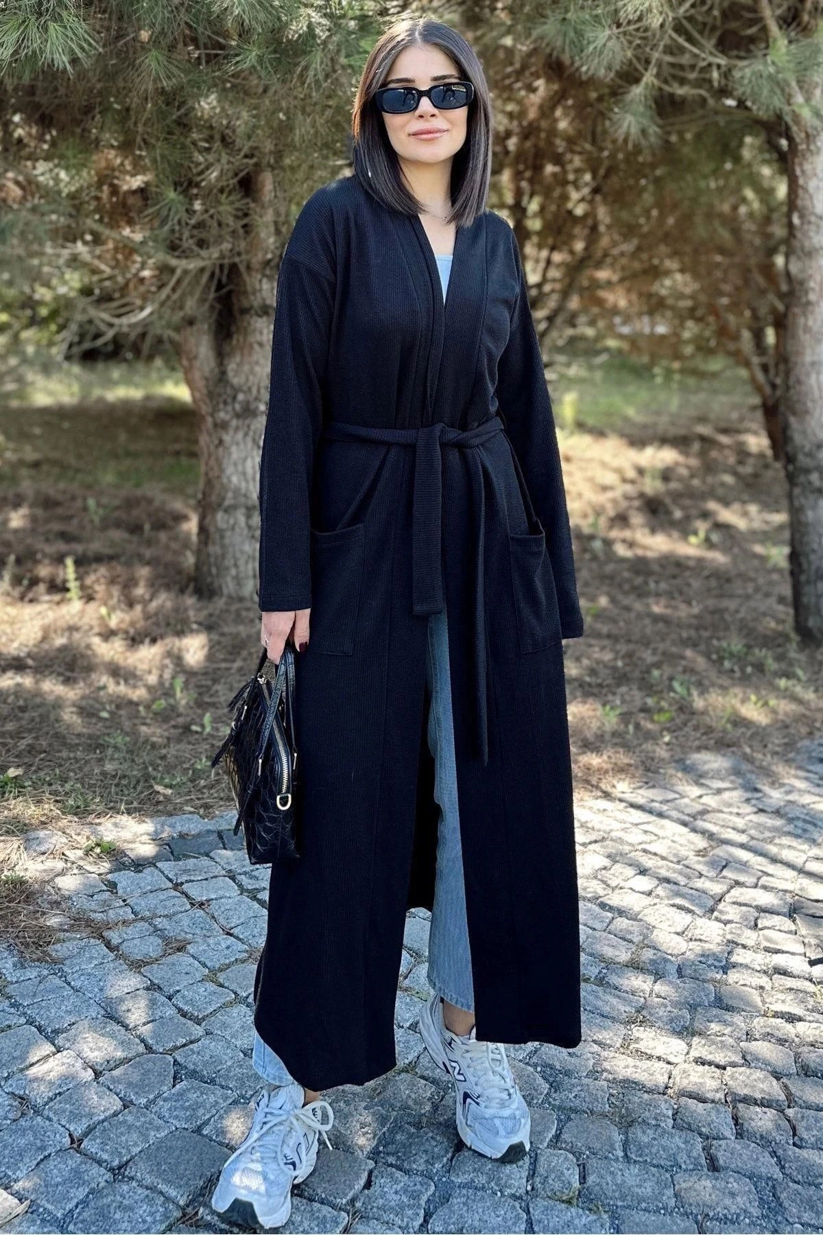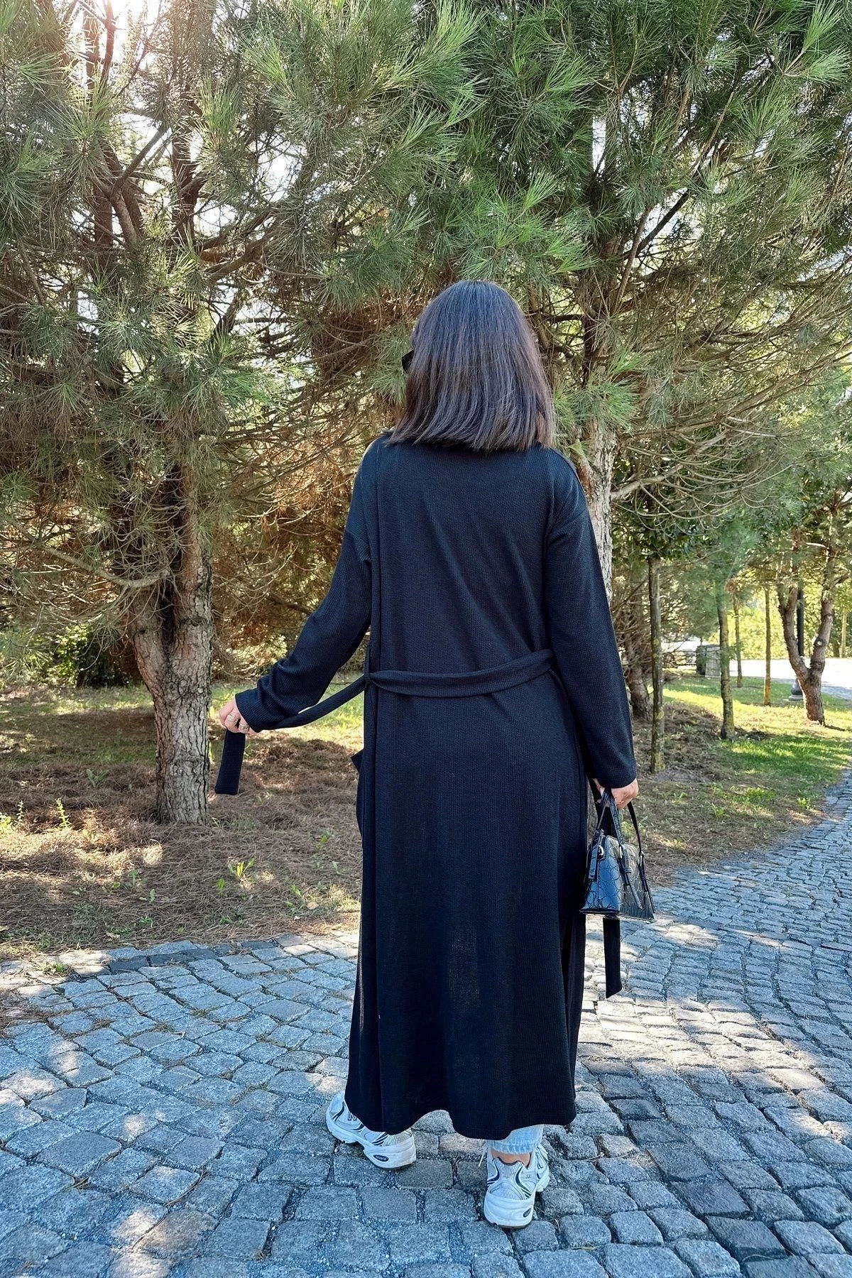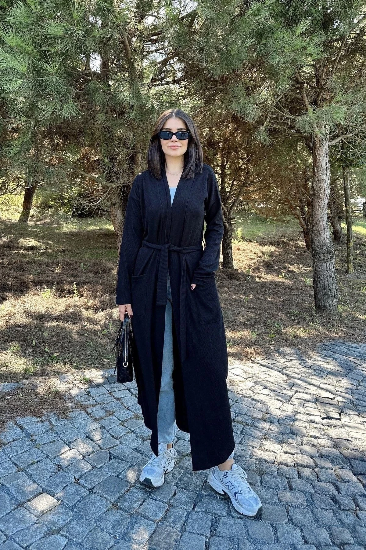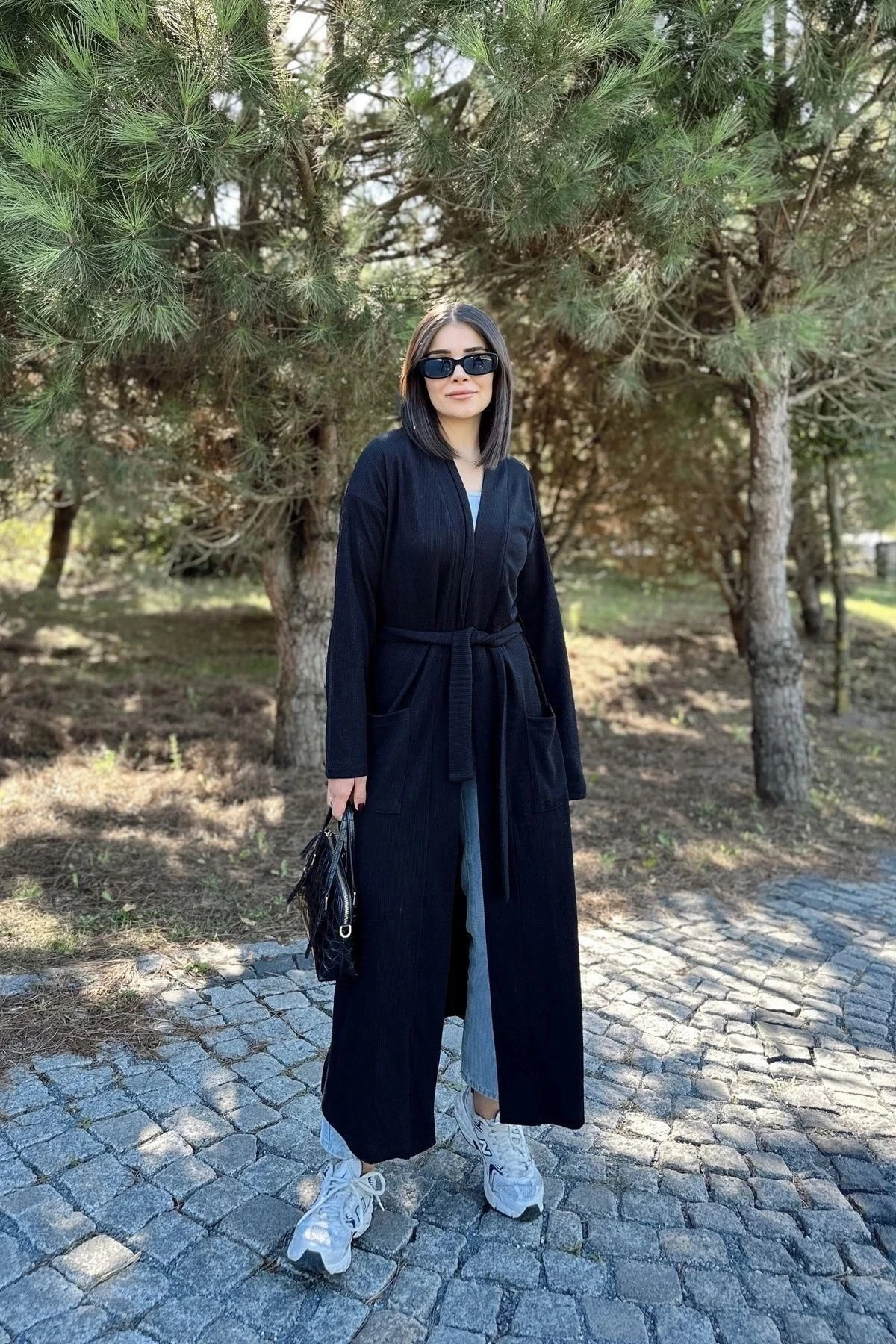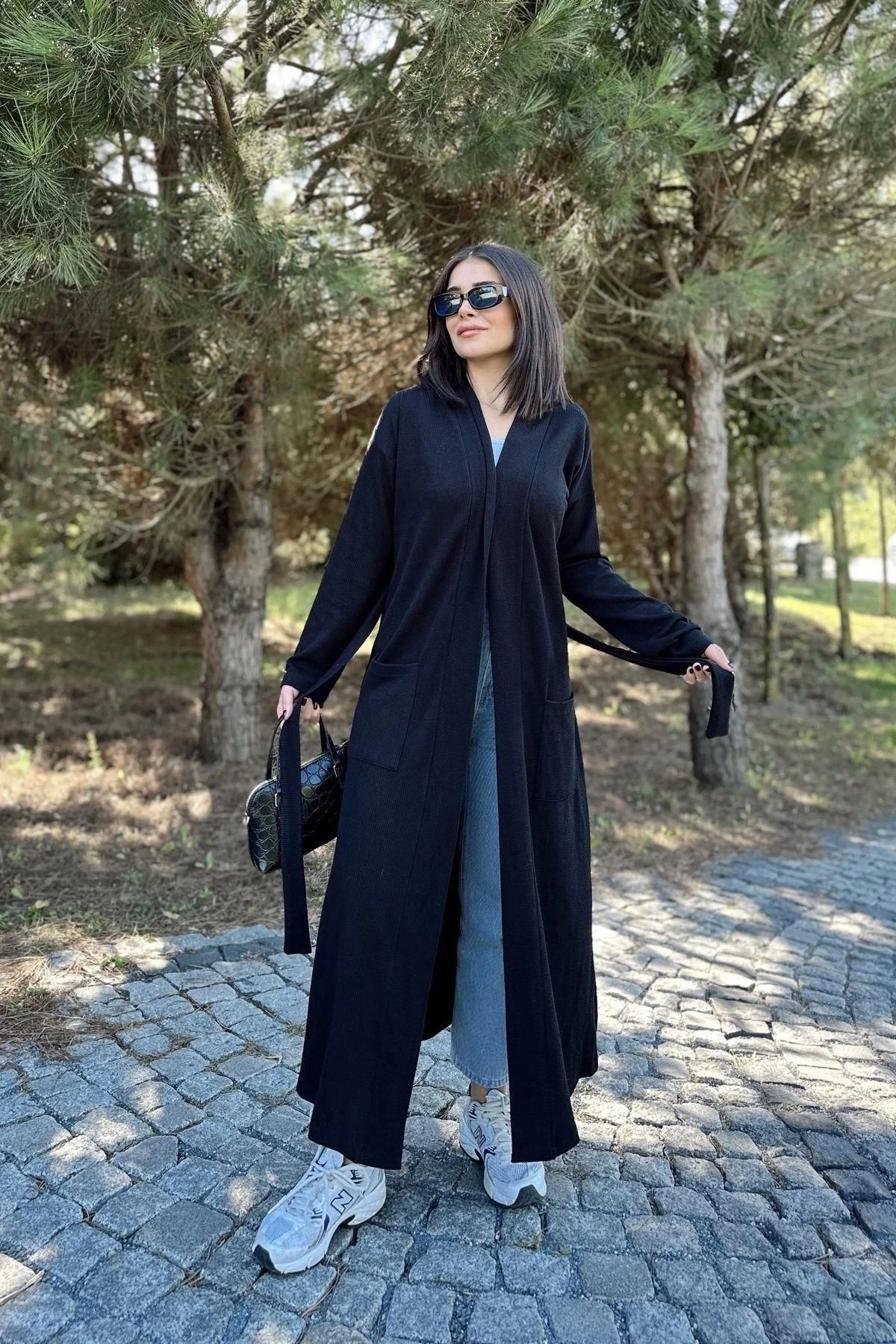 Kadın Siyah Uzun Kol, Beli Kemerli, Düğmesiz, Çift Cepli, Uzun Örme Hırka