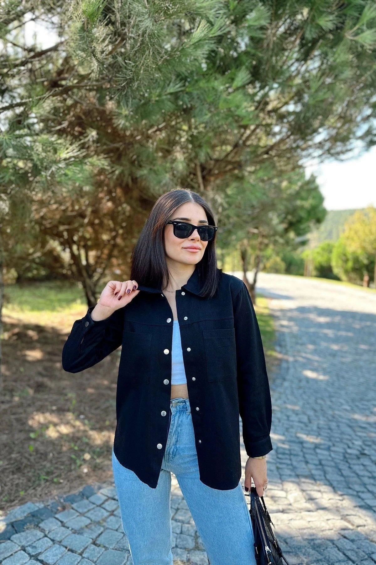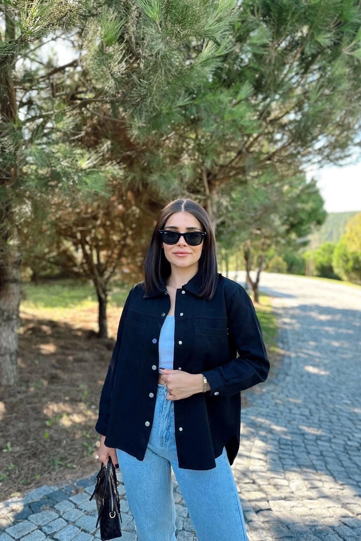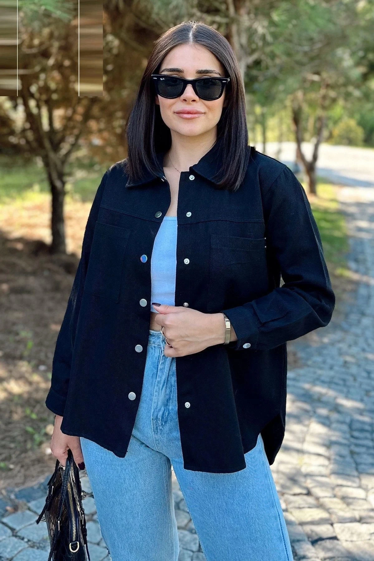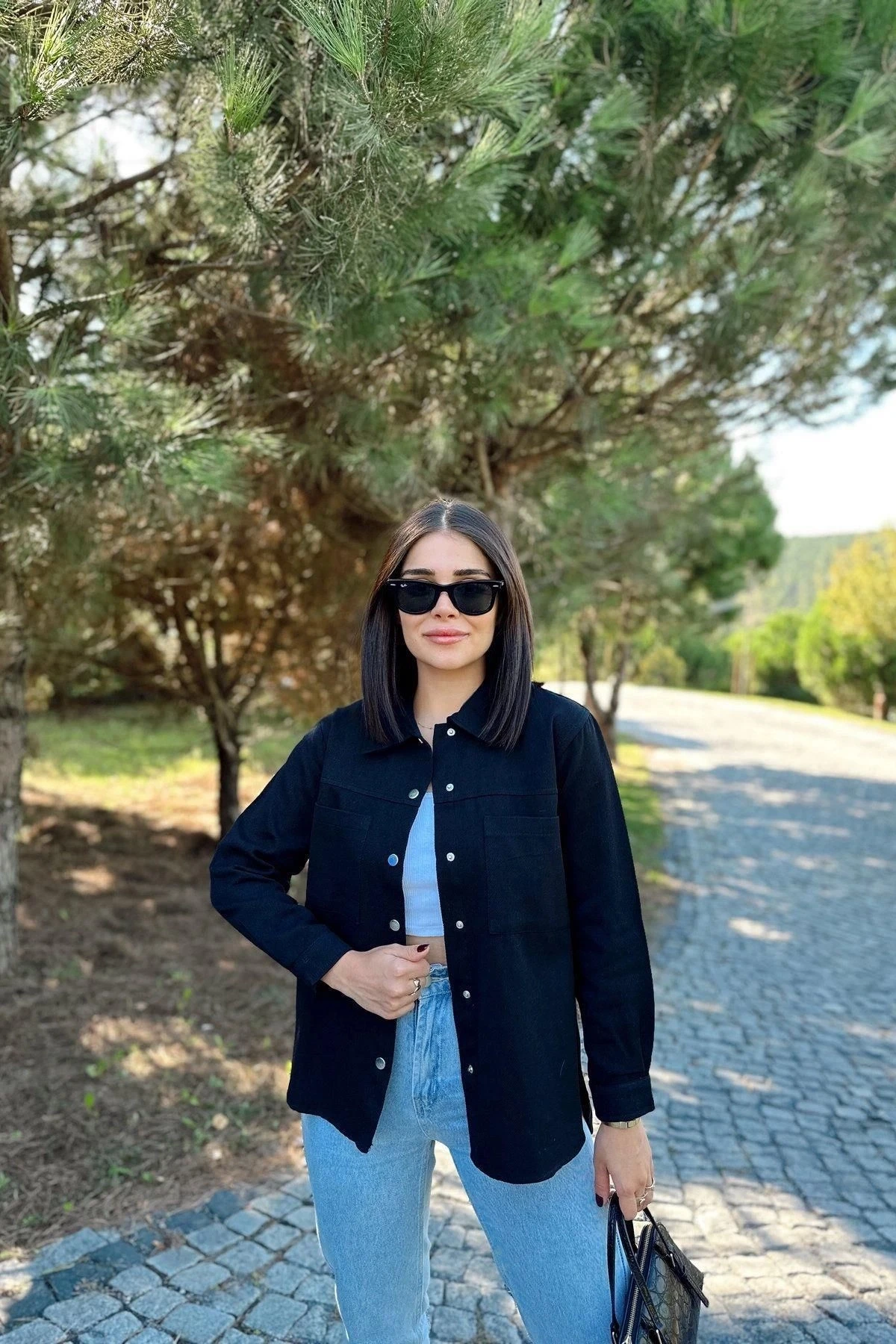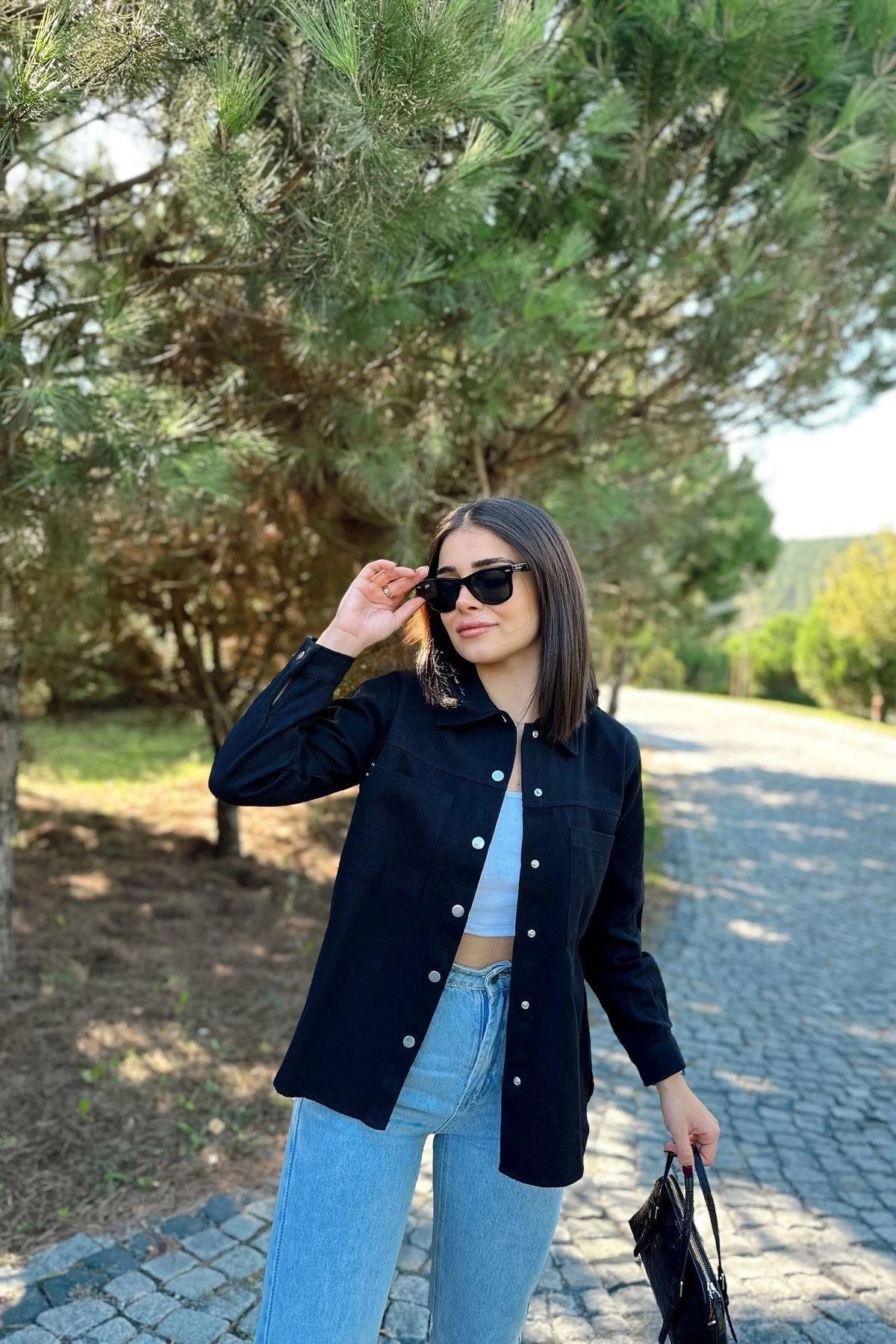 Kadın Siyah Uzun Kol, Çift Cep, Arkası Pliseli, Eteği Oval Kesim, Yırtmaçlı, Gabardin Gömlek Ceket