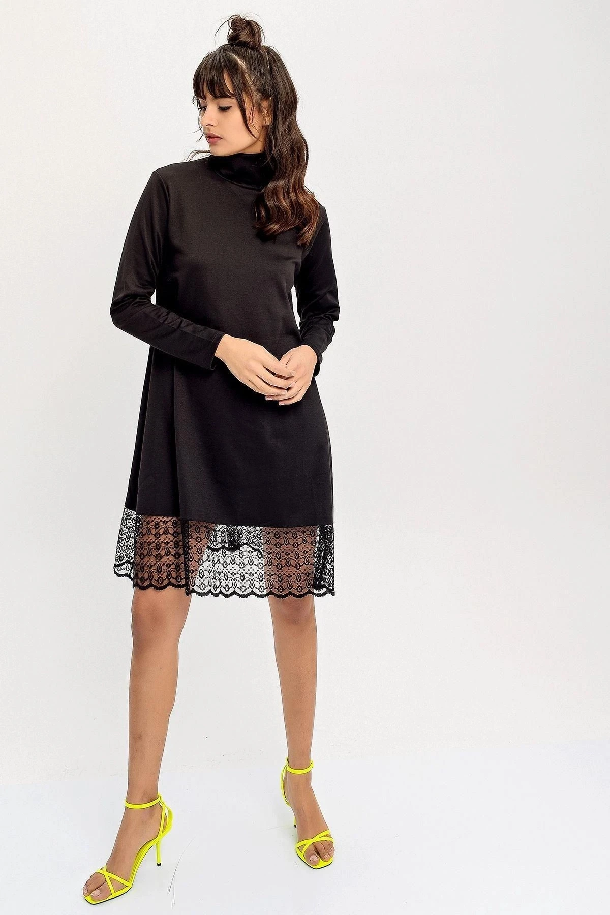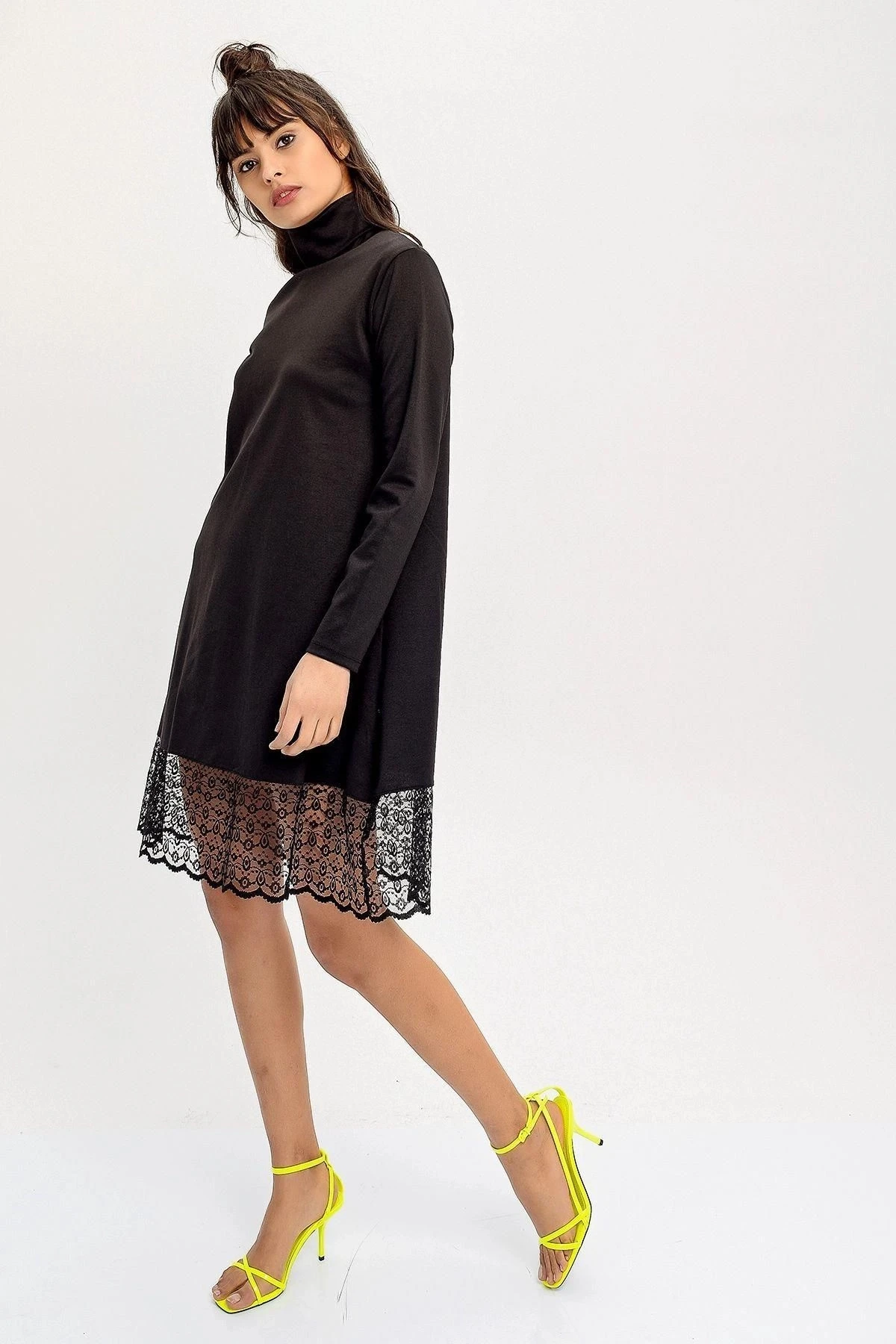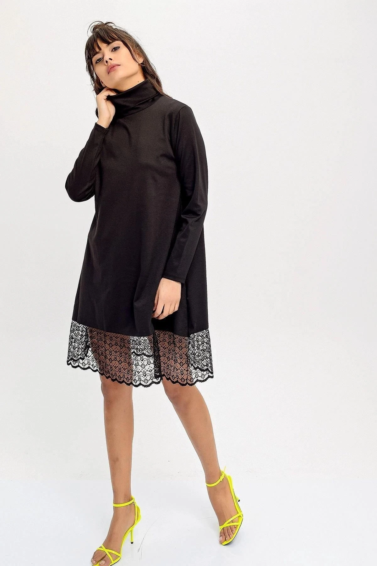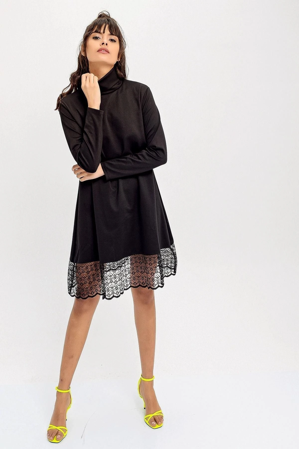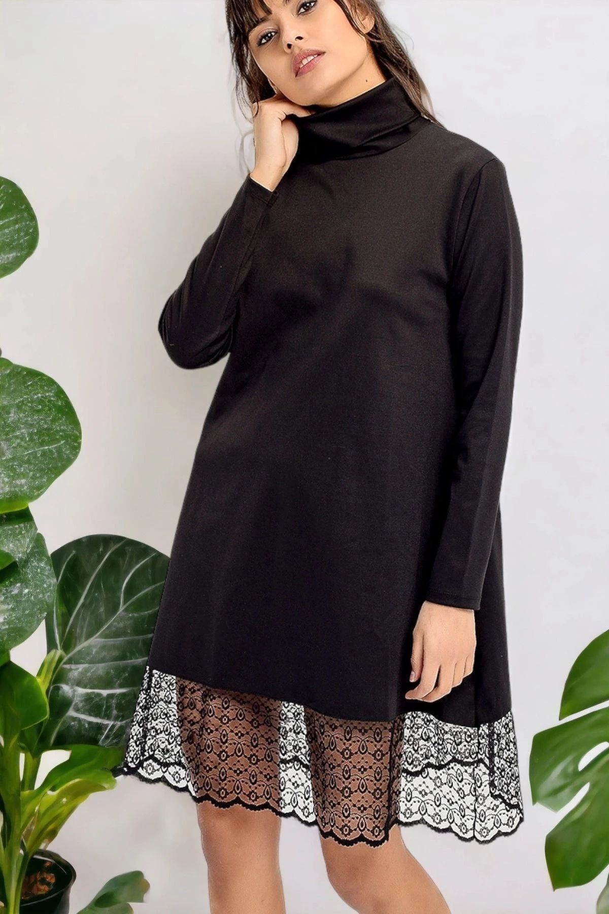 Bu şık ve zarif elbise, gardırobunuzun vazgeçilmezi olacak.; Siyah renk, zamanın ötesinde bir şıklık ve zarafet sunar.; Uzun kollu ve dik yakalı tasarımıyla hem ofis ortamında hem de günlük yaşamda kendinizi rahat hissedeceksiniz.; Etek ucu dantel detaylarıyla bu elbiseye hoş bir dokunuş eklenmiştir.; Bu detaylar, feminen bir çekicilik yaratırken aynı zamanda zarif bir görünüm sunar.; Oversize kesimi, rahat bir kullanım sağlarken aynı zamanda modern ve trendy bir tarz sunar.; Midi boyu, diz üstü seviyesinde son derece uygun bir uzunlukta olup, profesyonel bir ofis ortamında da şık bir görüntü sağlar.; Bununla birlikte, günlük hayatta da rahatlıkla tercih edilebilir.; Elbisenin kumaş içeriği %95 Polyester ve %5 Elastane'dir.; Bu karışım, dayanıklılık ve esneklik sağlar.; Polyester, kırışıklıklara karşı dirençli olup, kolayca bakım yapılabilen bir kumaş türüdür.; Elastane ise elbisenin hareket özgürlüğünü artırır ve vücuda mükemmel bir uyum sağlar.; Bu elbise, her kadının gardırobunda olması gereken bir parça olarak tasarlandı.; Şıklık, rahatlık ve kaliteyi bir araya getiren bu elbise, herhangi bir sosyal veya iş ortamında şık bir seçim olacak.; Kendinizi özel hissetmek ve her anınızı stil sahibi geçirmek için bu elbiseyi tercih edin.