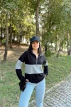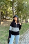 Kadın Siyah Uzun Kol, Dik Yaka, Fermuarlı, Double Color Block Basic Sweatshirt Bluz