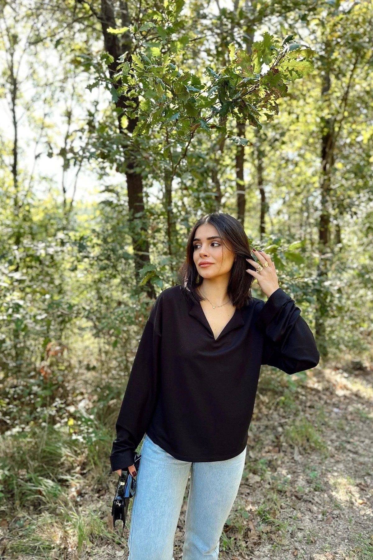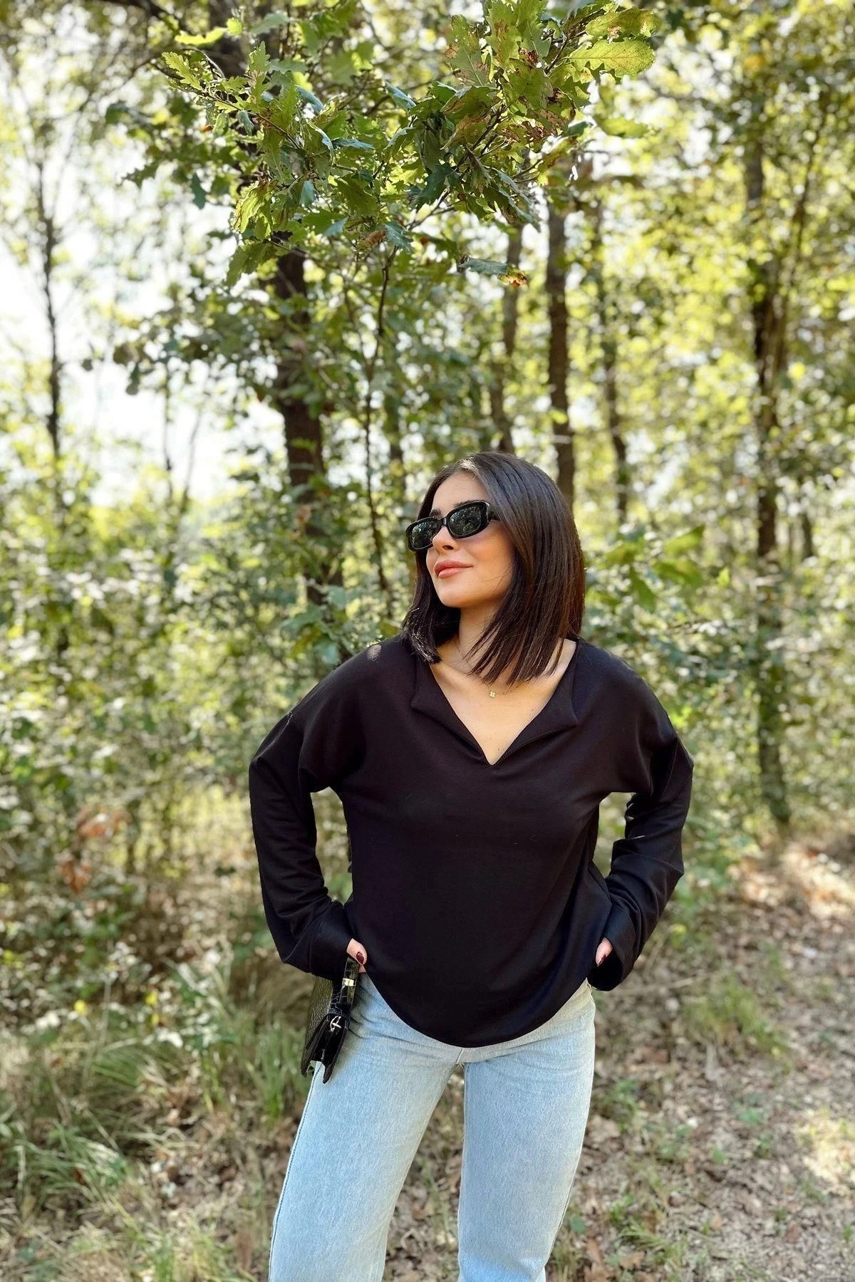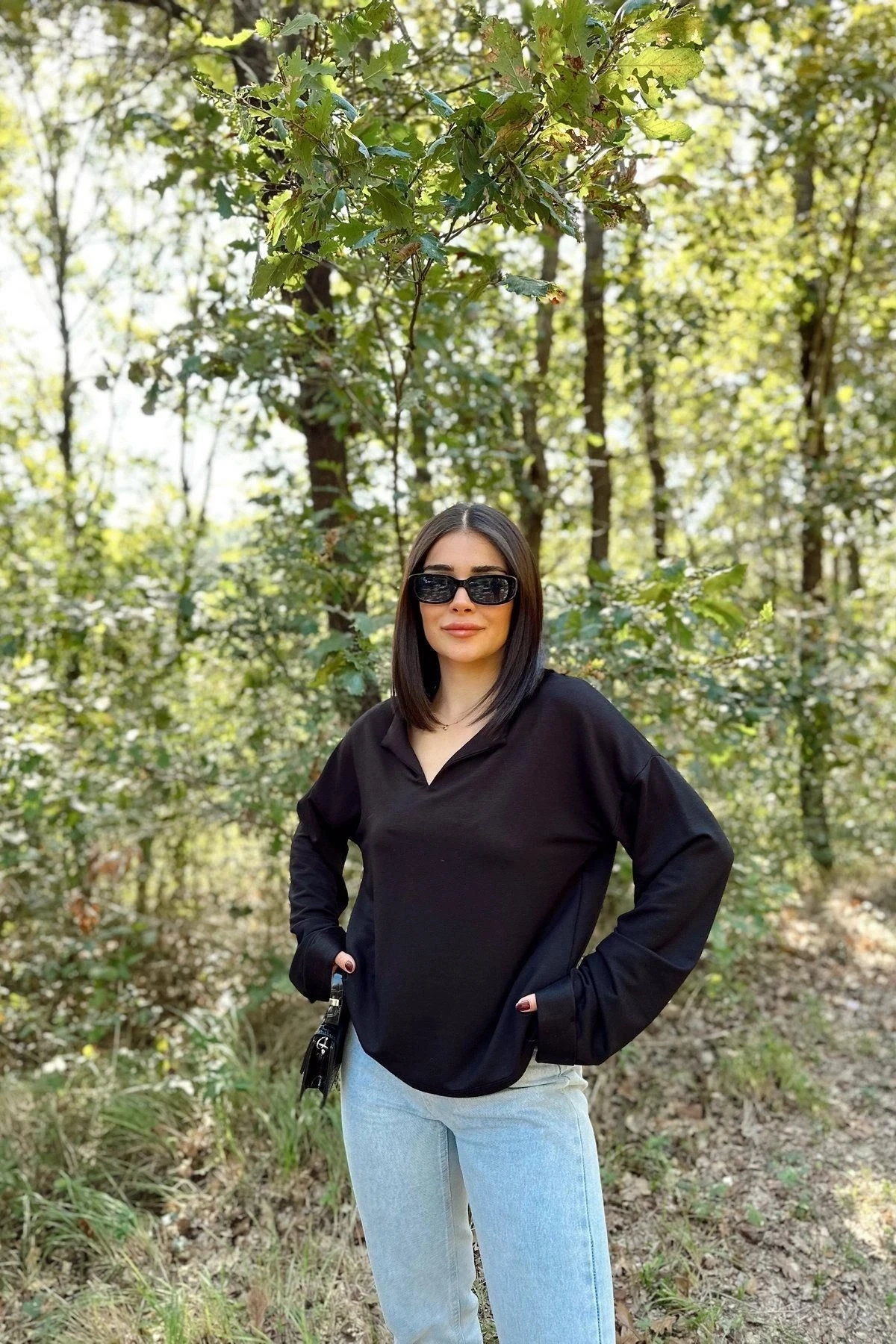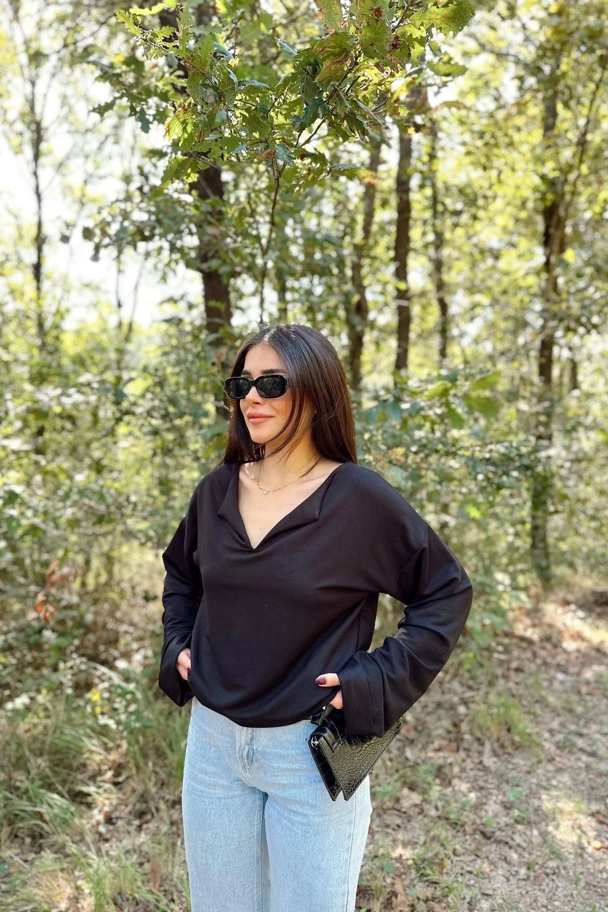 Kadın Siyah Uzun Kol, Duble Manşet, Yırtmaçlı Yaka, Salaş Sweatshirt Bluz