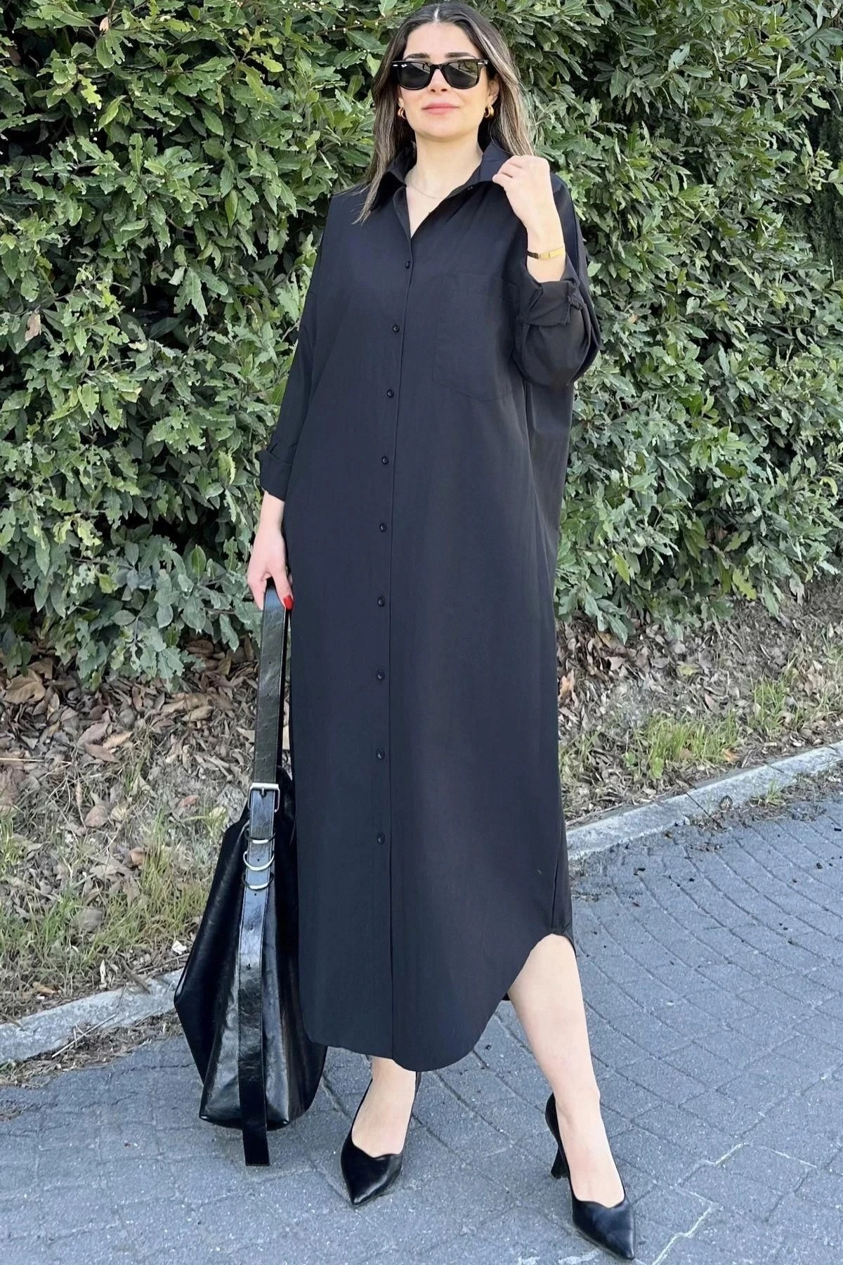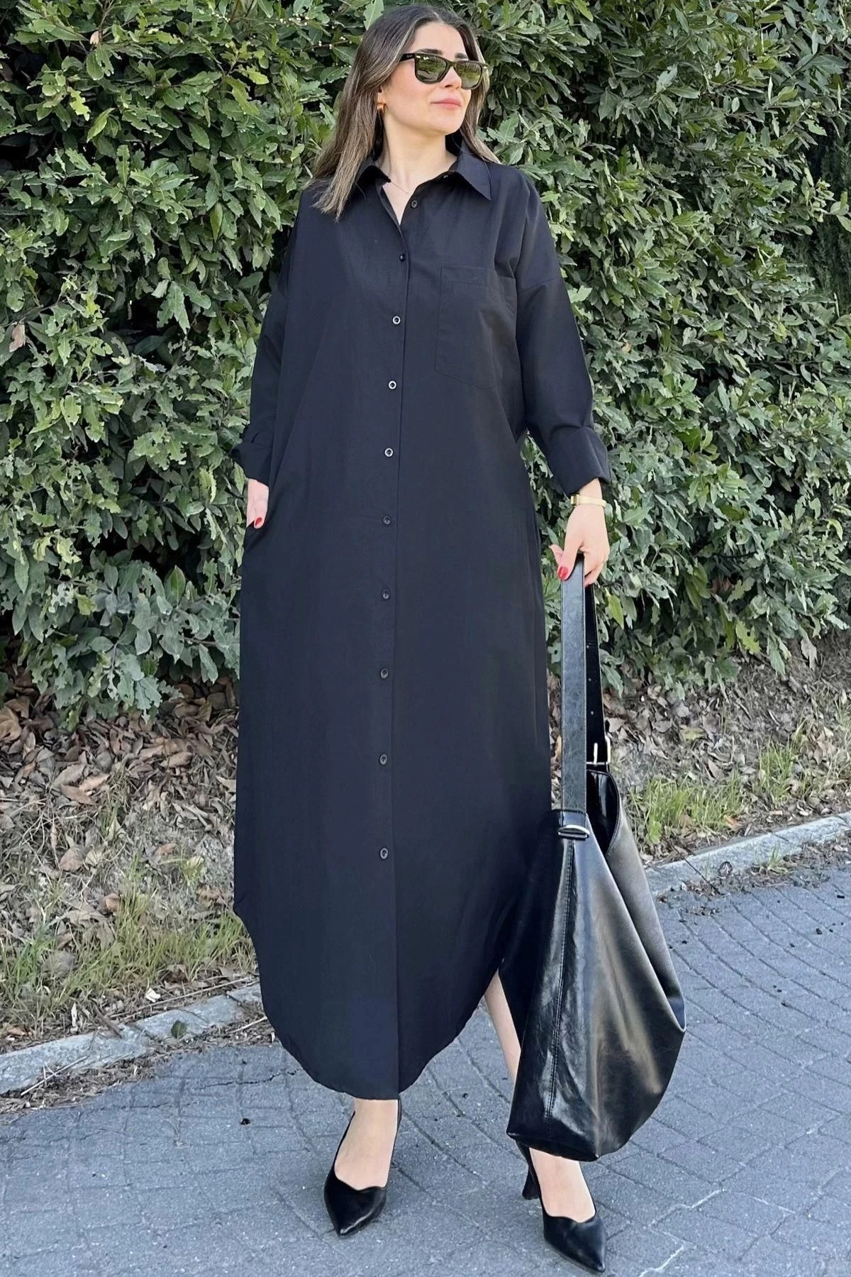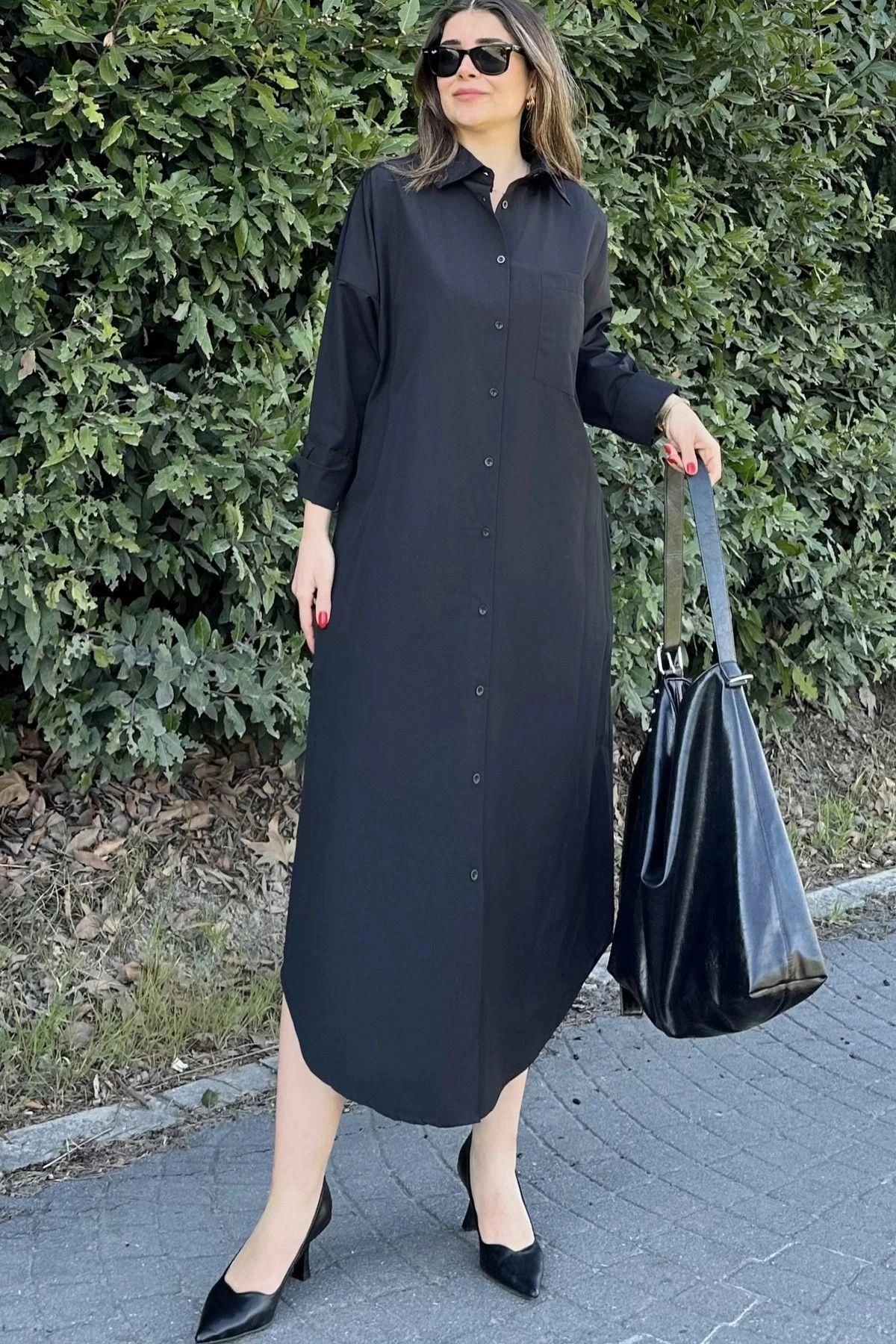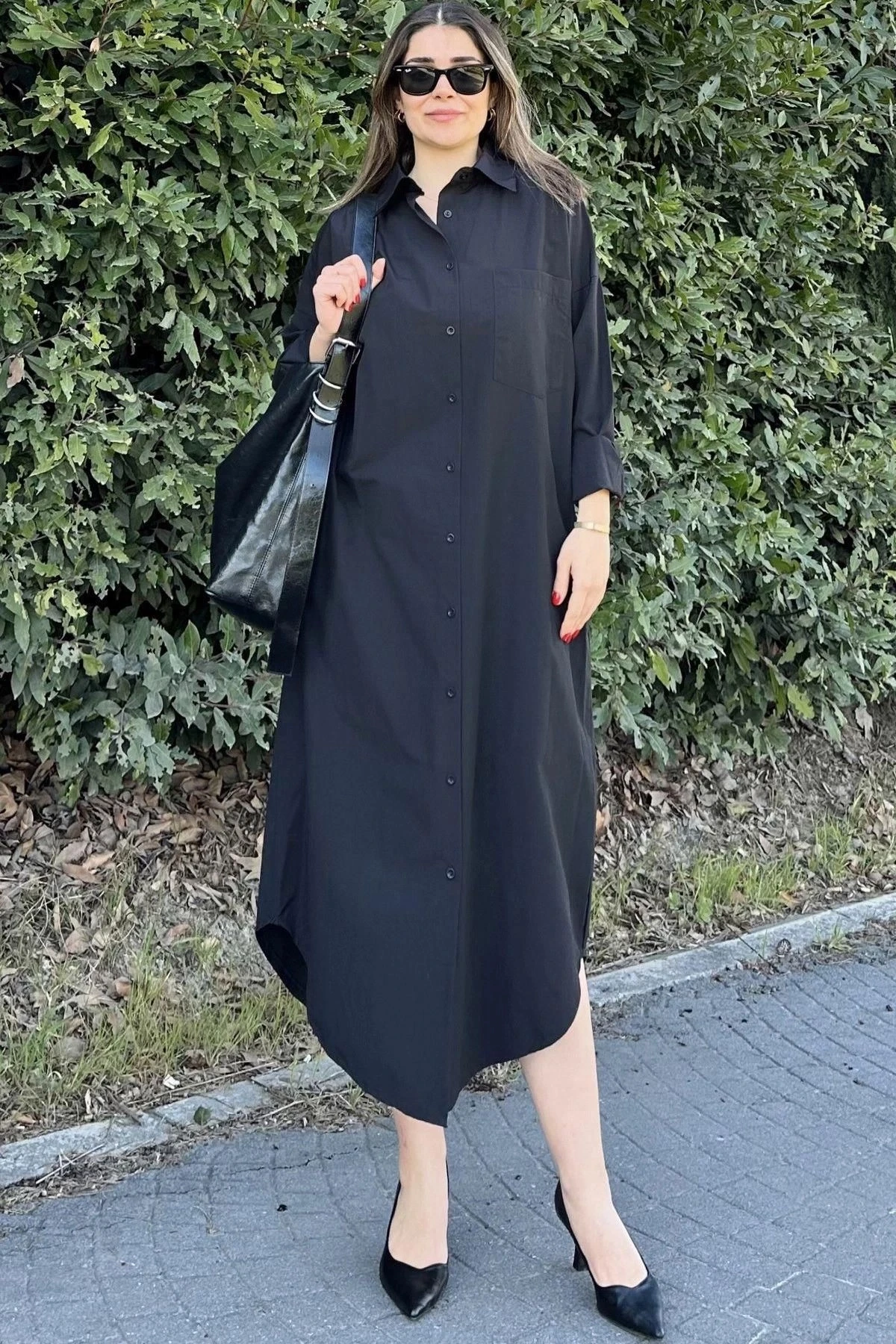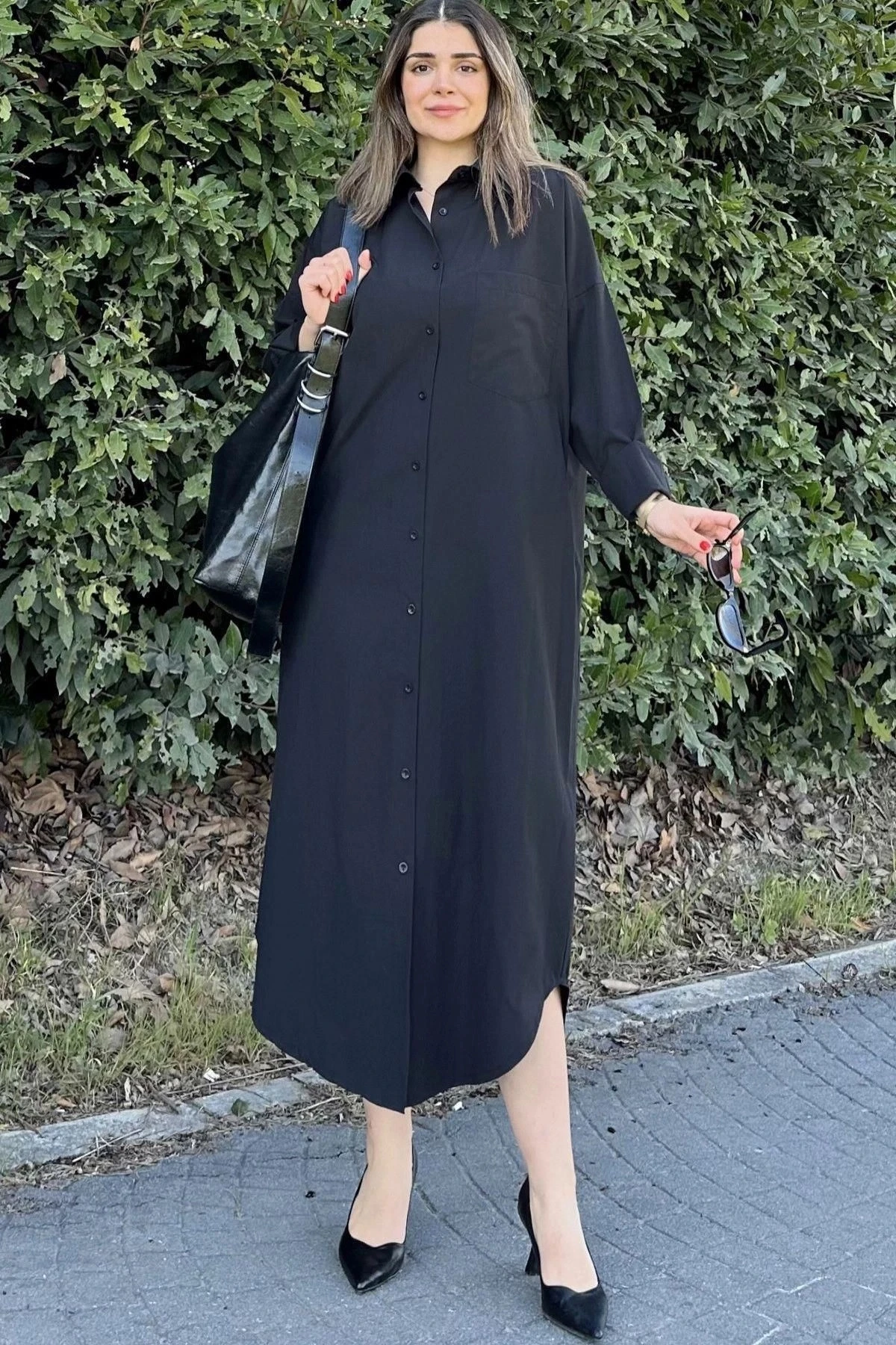Kadın Siyah Uzun Kol, Eteği Oval Kesim, Uzun Ve Salaş, Poplin Gömlek Elbise