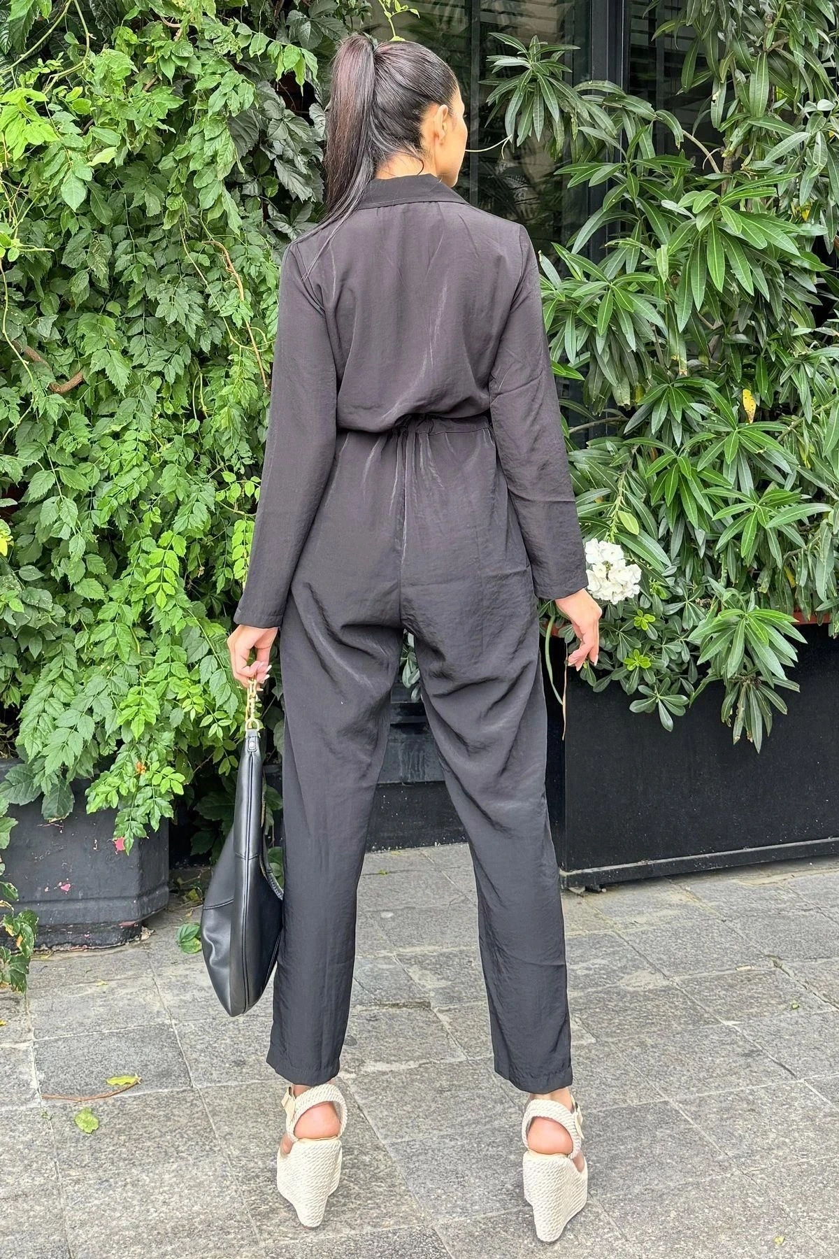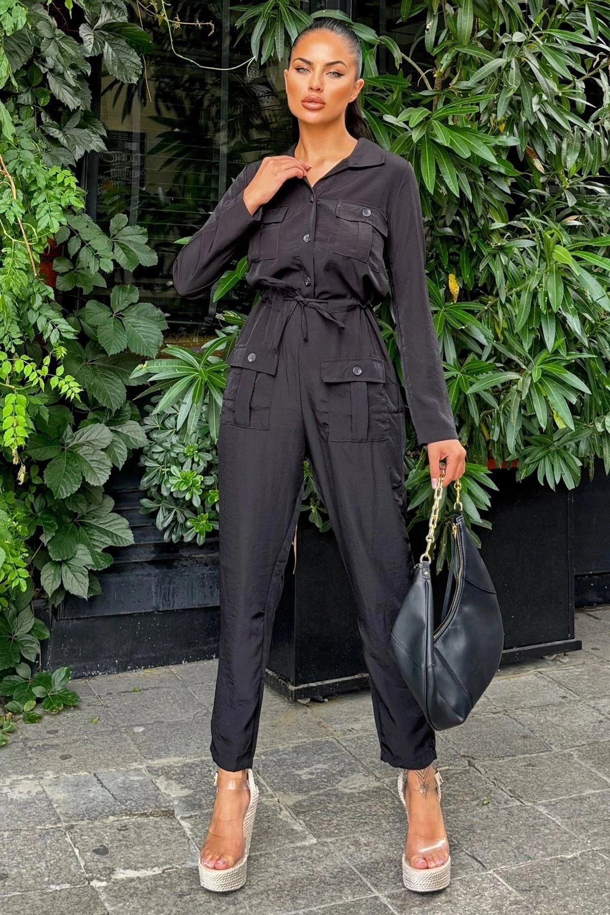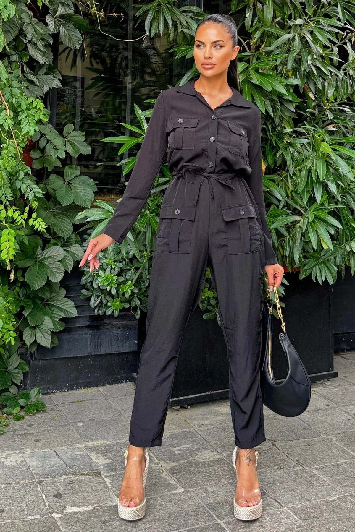 Kadın Siyah Uzun Kol, Gömlek Yaka, Cepli, Kemerli, Airobin Safari Tulum