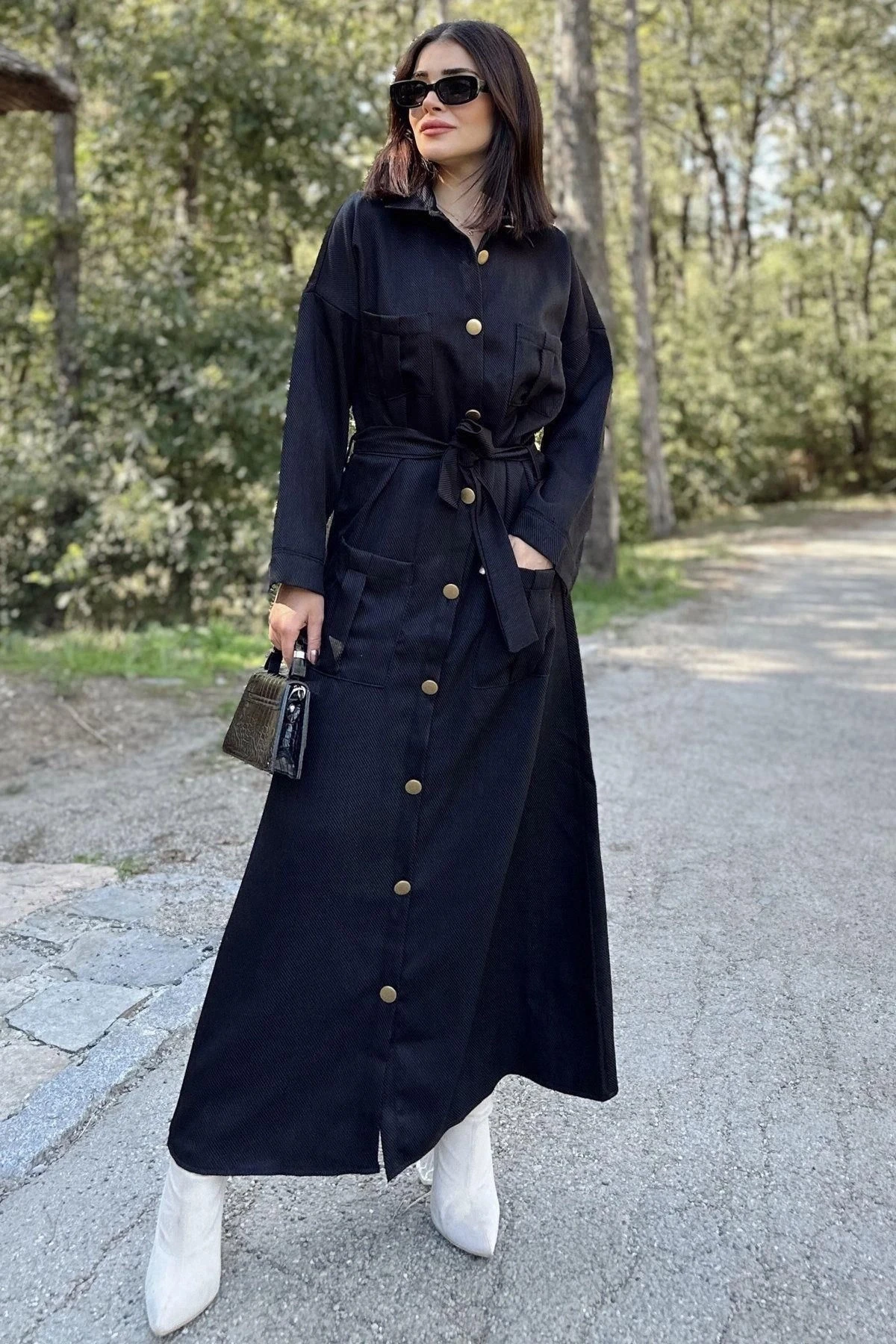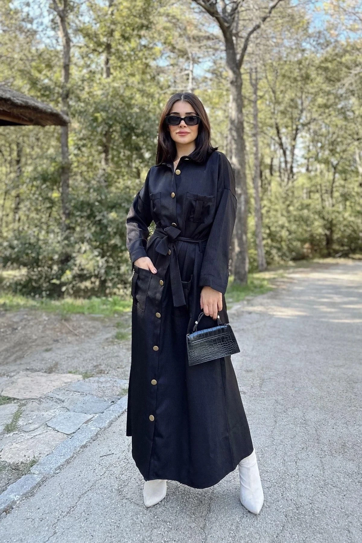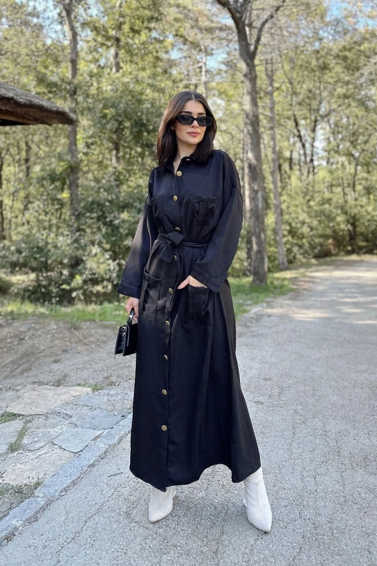 Kadın Siyah Uzun Kol, Rahat Beli Kemerli, 4 Cepli, Gabardin Keten, Maksi Gömlek Elbise