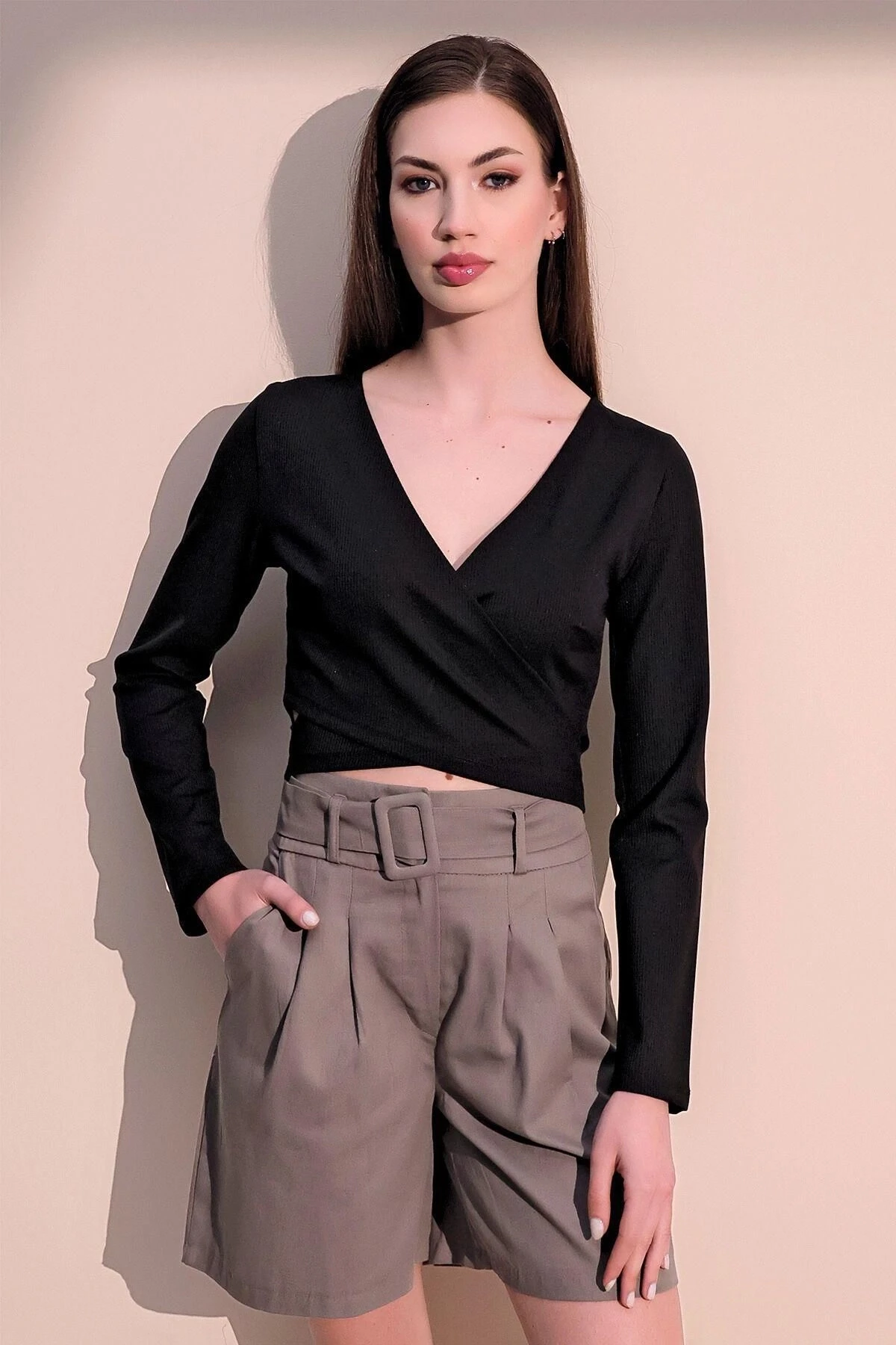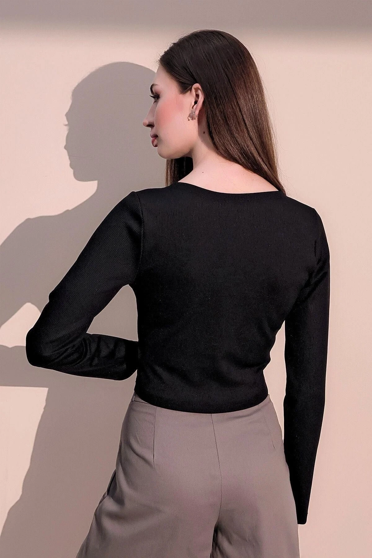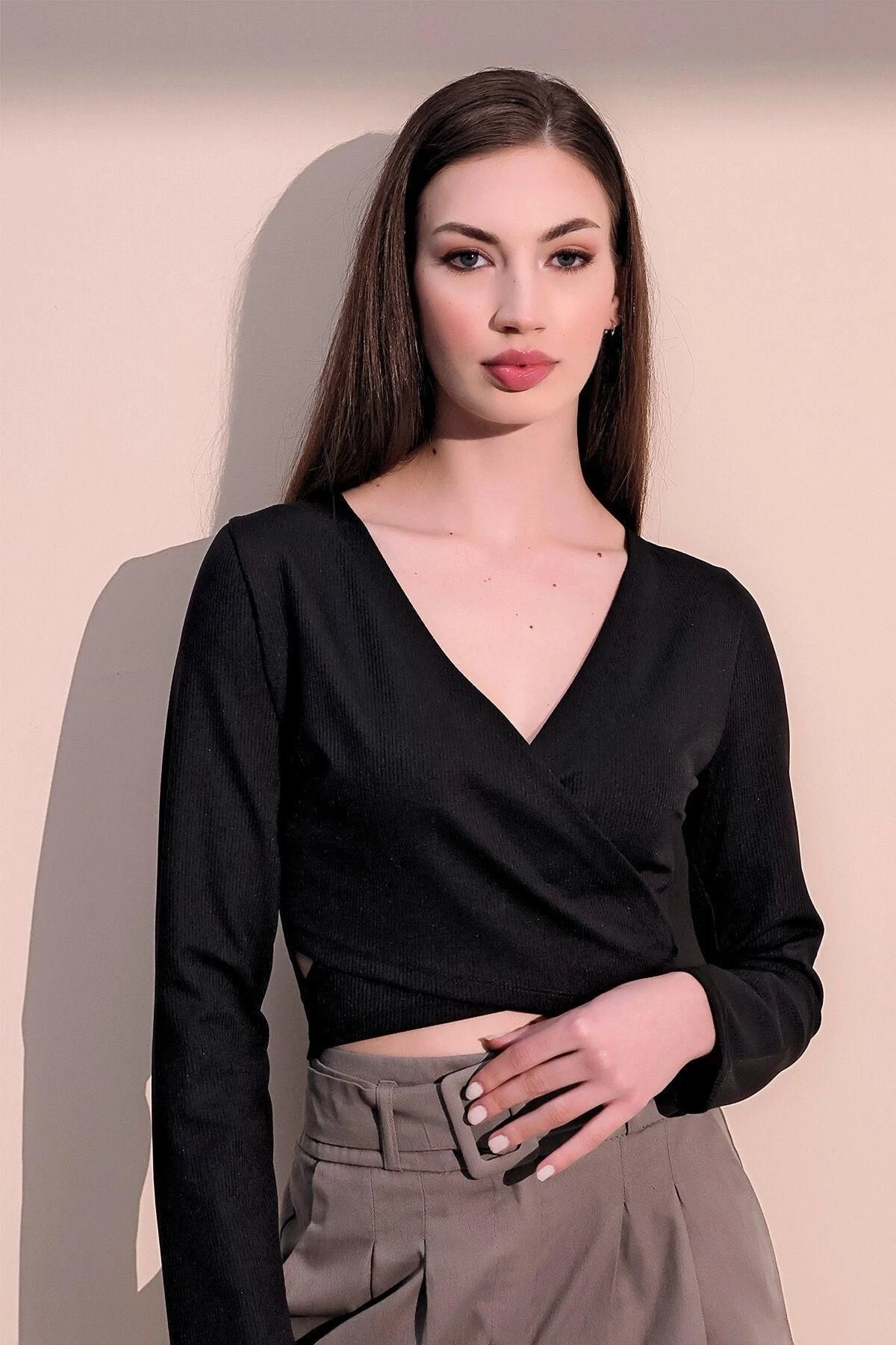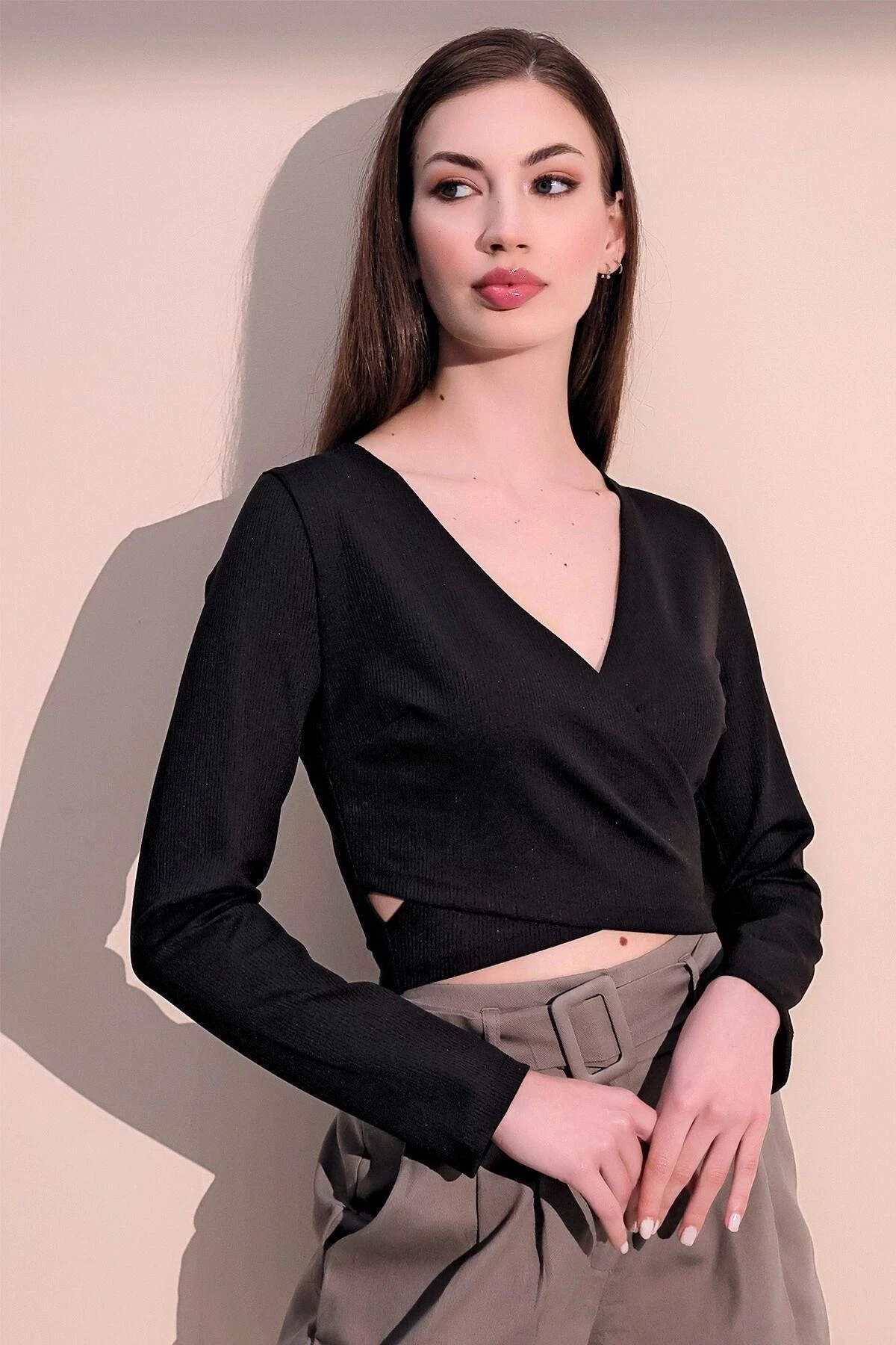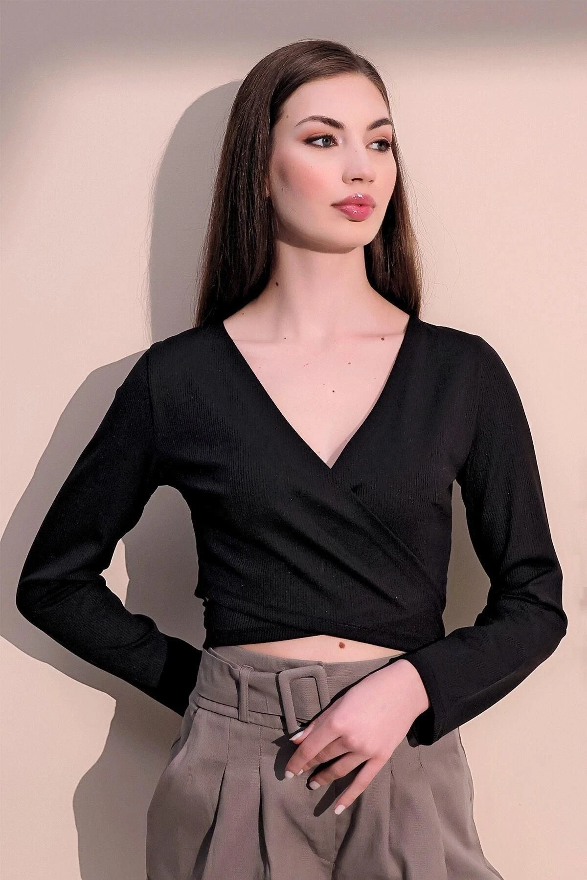 Bu siyah renkli uzun kollu bluz, modern ve stil sahibi kadınlar için özel olarak tasarlandı.; Kruvaze detayı, bluza sofistike bir hava katarken, kaşkorse ayrıntıları ise feminen bir tarz sunuyor.; Crop kesim, bluzu trendlere uygun hale getirirken, vücut hatlarınıza uyum sağlayan likralı yapısı maksimum konfor sunuyor.; Kumaş içeriği %95 Polyester ve %5 Elastan'dan oluşuyor.; Polyester, bluza dayanıklılık kazandırırken, elastan ise esneklik ve hareket özgürlüğü sunar.; Bu sayede, bluz gün boyu rahatlıkla giyilebilir ve formunu korur.; Siyah renk seçimi, zamansız ve şık bir görünüm elde etmenizi sağlar.; Siyah, her türlü kombinle uyumlu olmasıyla bilinir ve gardırobunuzun vazgeçilmez bir parçası olabilir.; Uzun kollu tasarımı, mevsim geçişlerinde veya daha serin günlerde de kullanmanızı mümkün kılar.; Bu bluzun kalıbı bedeninizi kusursuzca sarar ve siluetinizi ön plana çıkarır.; Kruvaze detayı, belinizi vurgularken, crop kesimi ise göbek hizasında sonlanarak farklı bir tarz yaratır.; Hem günlük giyimde hem de özel davetlerde rahatlıkla tercih edebileceğiniz bir parça.; Yeni tarzı ve modern detaylarıyla bu bluz, gardırobunuza canlılık katacak ve size özgüvenli bir görünüm sağlayacak.; Şık bir etek veya pantolonla kombinleyerek şık bir gece görünümü elde edebilirsiniz.; Ayrıca, jeanlerle rahat bir günlük stil oluşturmak da mümkün.; Bu bluzla tarzınızı sınırlamak size kalmış!