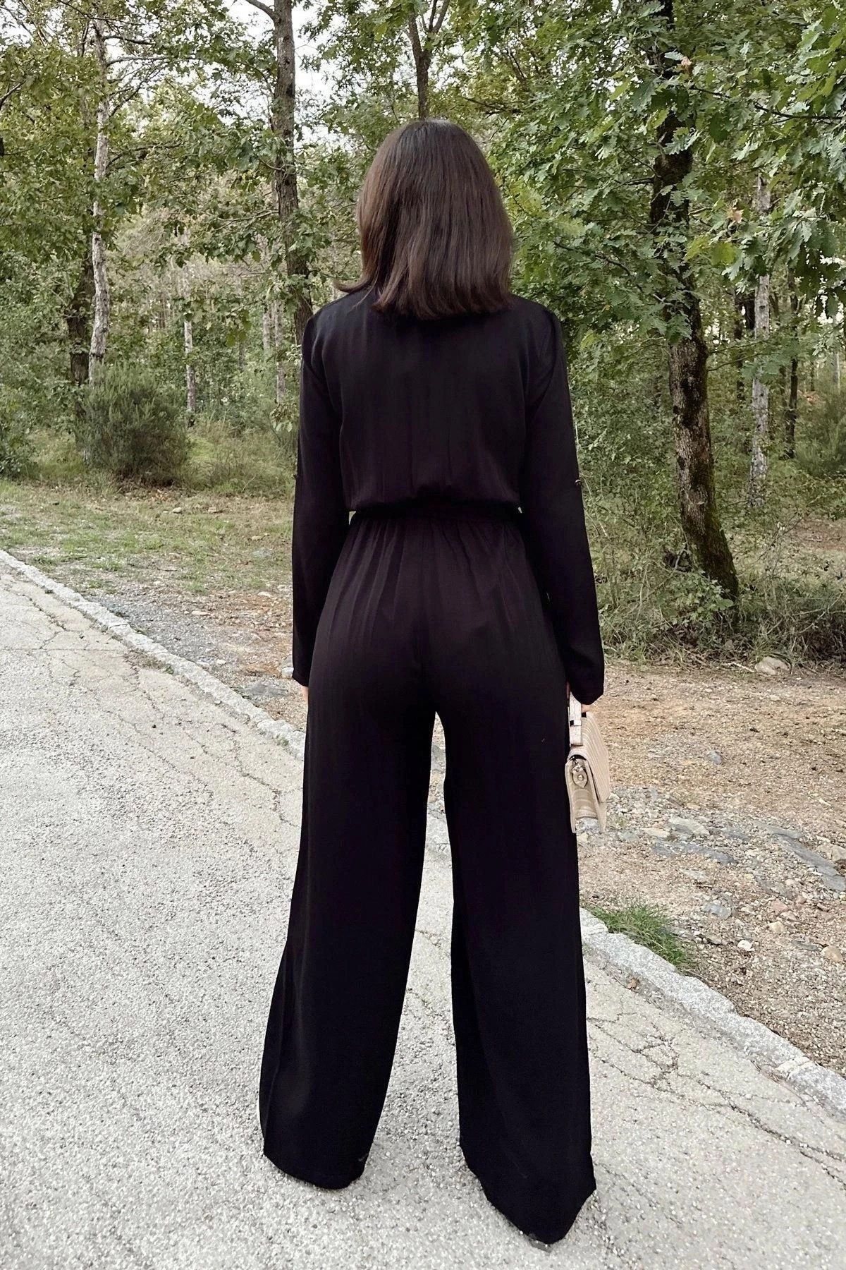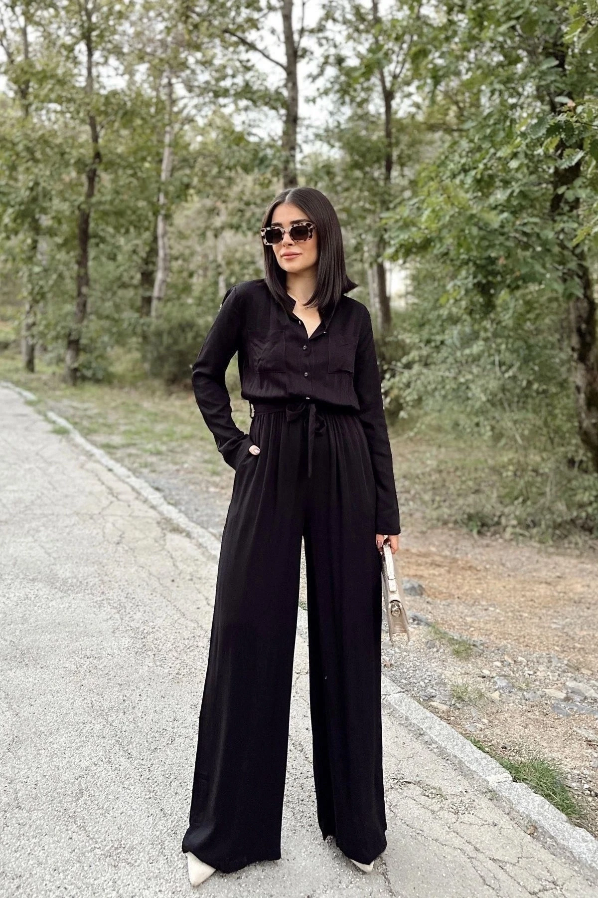 Kadın Siyah Uzun Kol, Yuvarlak Yaka, Beli Lastikli Ve Kemerli, Çift Cepli, Salaş Tulum