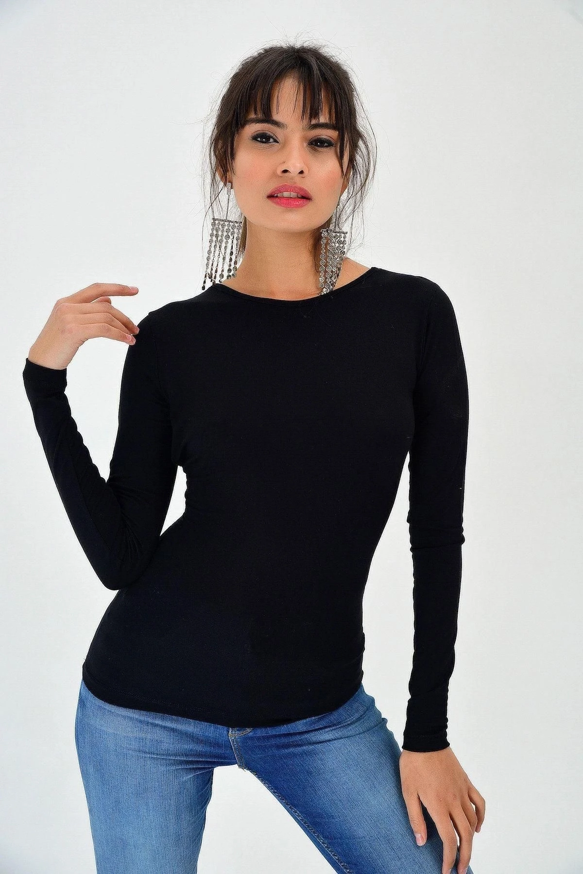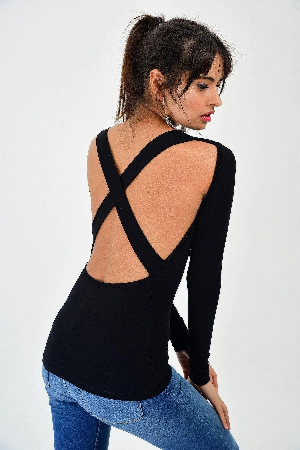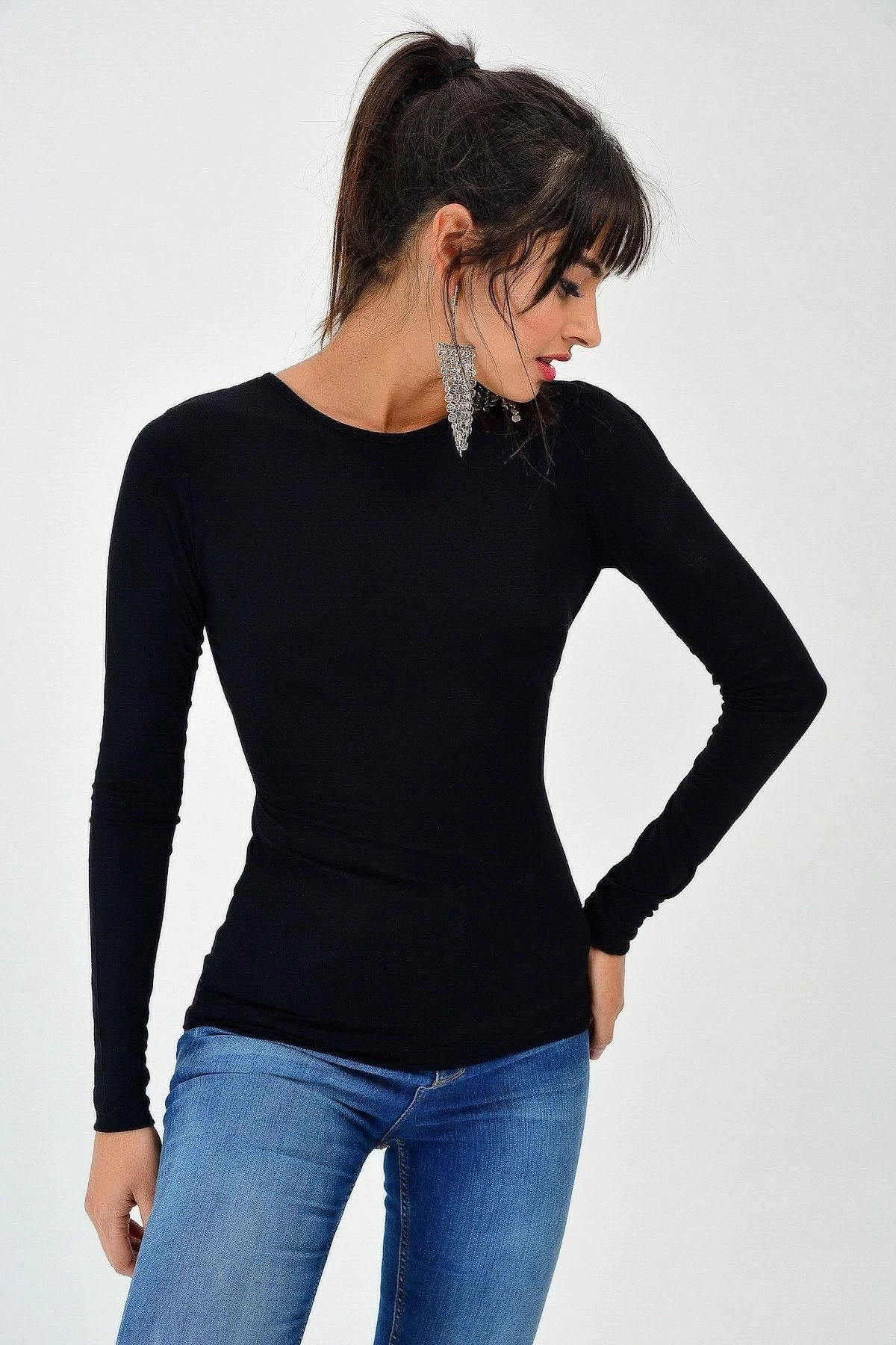 Bu şık ve trendy bluz, zarif görünümünüzü tamamlayacak mükemmel bir seçimdir.; Siyah rengi, zamansız ve çok yönlü bir stil sunarken uzun kollu tasarımı sıcaklık ve rahatlık sağlar.; Yuvarlak yaka, her vücut şekline uyum sağlar ve sizi zarif bir şekilde çerçeveleyerek çekici bir görünüm elde etmenizi sağlar.; Bluzun sırt dekolteli tasarımı, sıradanlıktan sıyrılmanızı sağlar ve özgün bir dokunuş ekler.; Body fit kesimi, vücut hatlarınızı öne çıkartırken aynı zamanda şık bir siluet oluşturmanıza yardımcı olur.; Standart boyu ise her bedene uyum sağlar ve size konforlu bir kullanım deneyimi sunar.; Bu bluzun kumaş içeriği %95 polyester ve %5 elastan'dan oluşur.; Polyester, dayanıklılık ve esneklik sağlar, böylece bluzunuzun uzun süre şeklini korumasını ve rahat hareket etmenizi sağlar.; Elastan ise bluzun bedeninize mükemmel şekilde oturmasını ve esneklik sağlamasını sağlar.; Bu muhteşem bluz, herhangi bir kombinle mükemmel bir şekilde uyum sağlar.; İster ofis şıklığına, ister gündelik tarza yönelin, bu bluz her zaman şık ve çarpıcı bir seçenek olacaktır.; Gardırobunuzun vazgeçilmez parçalarından biri olacak olan bu bluzu, özel etkinliklerde, davetlerde veya günlük yaşamınızda rahatlıkla kullanabilirsiniz.; Tüm bu özellikleriyle bu bluz, şıklık ve konforu bir araya getiren harika bir seçenektir.; Eşsiz tasarımı ve kaliteli kumaşıyla sizlere uzun süreli kullanım sağlayacak olan bu bluzu kaçırmamanızı öneririz.; Stilinizi yansıtacak ve kendinizi özel hissetmenizi sağlayacak bu bluzu hemen sepetinize ekleyin ve şık görünümün tadını çıkarın!