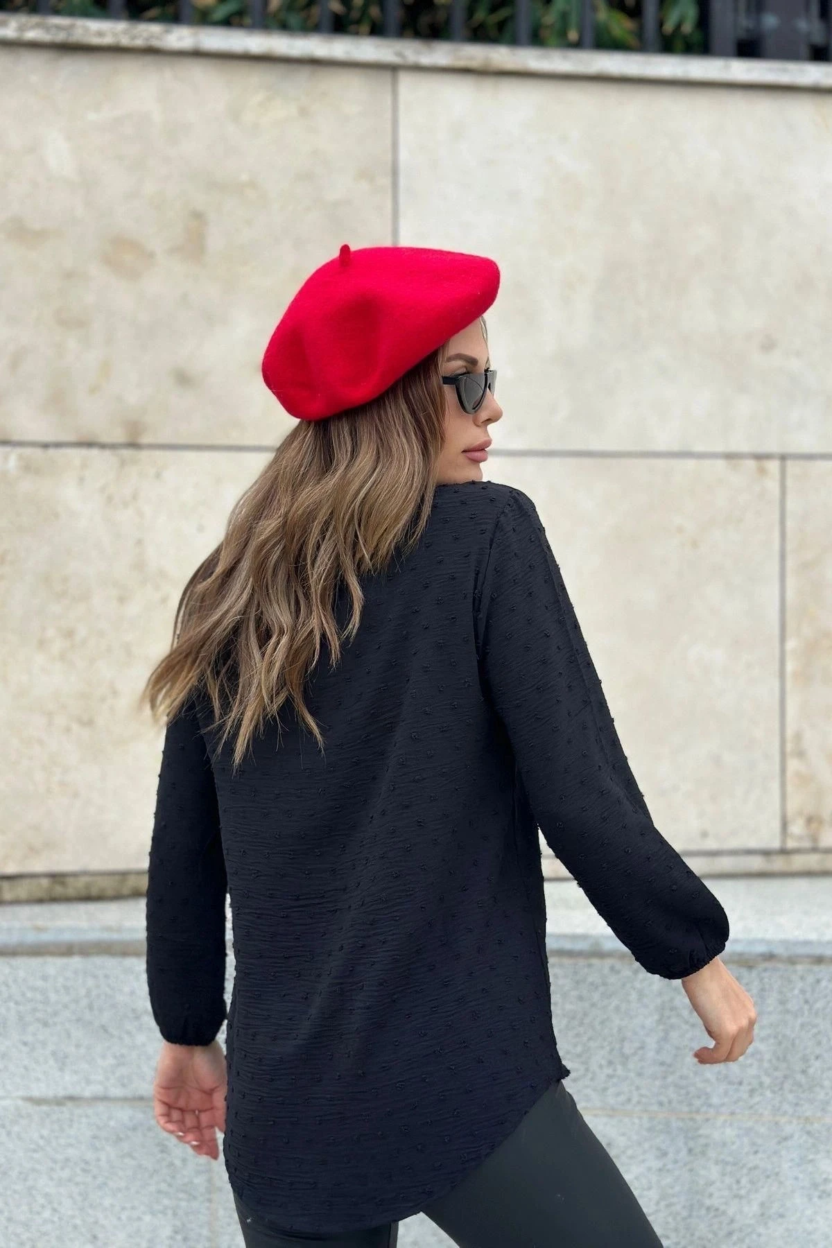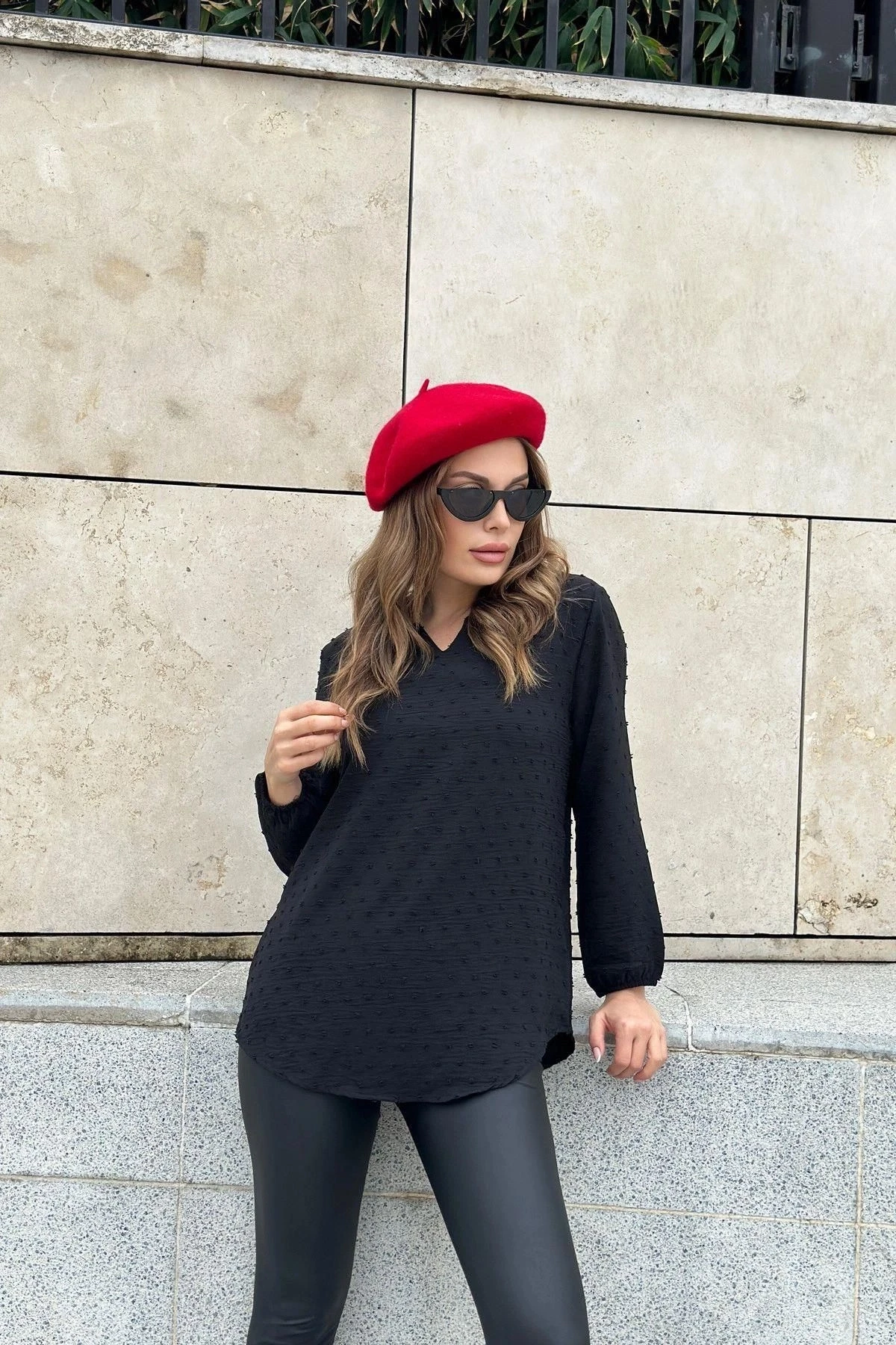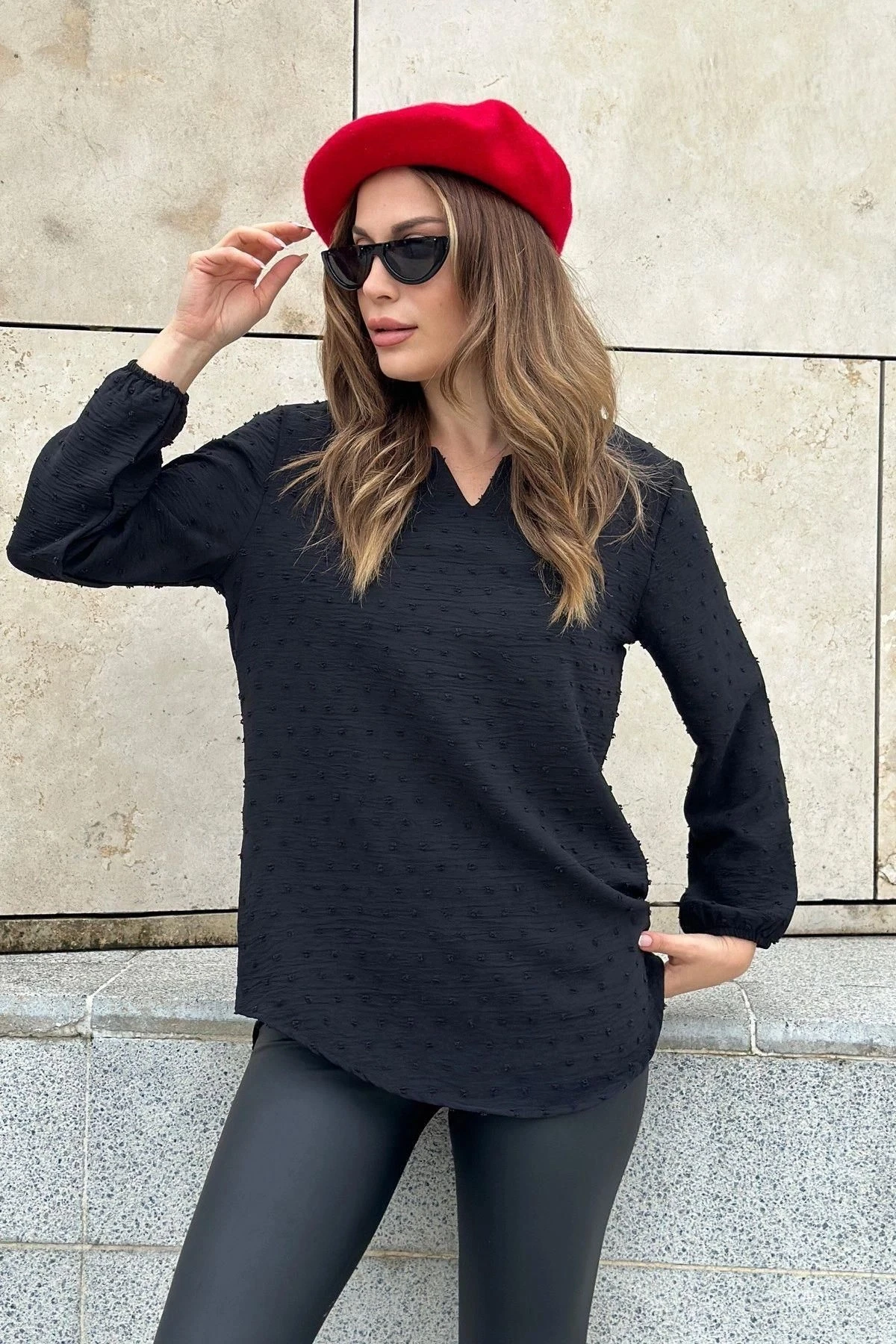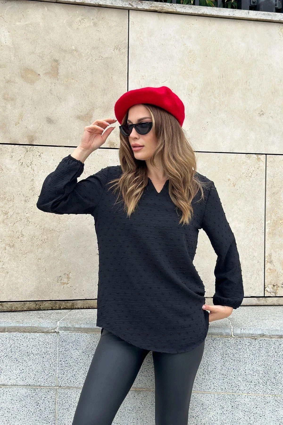 Kadın Siyah Uzun Truvakar Kol, Öpücük Yaka, Ponponlu Kumaş Basic Kesim Bluz - Tesettüre Uygun