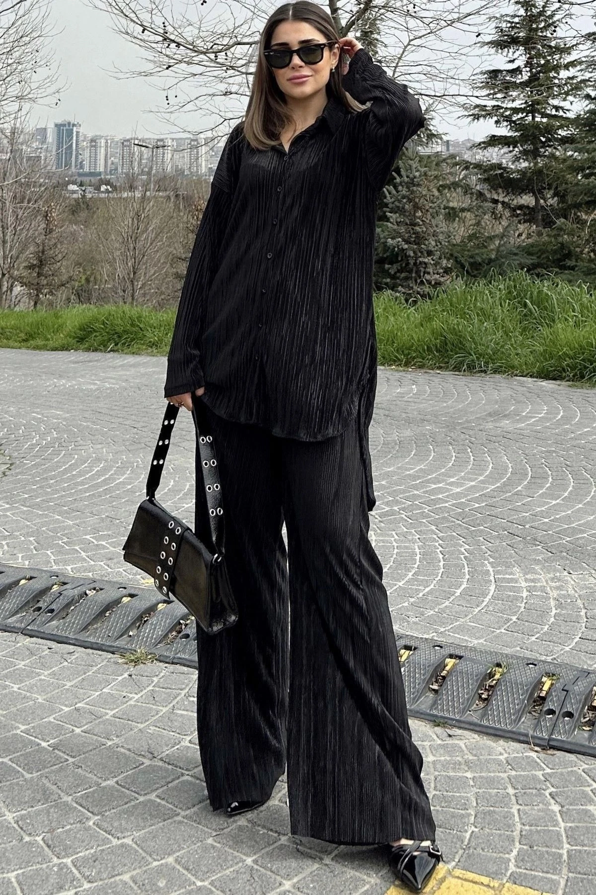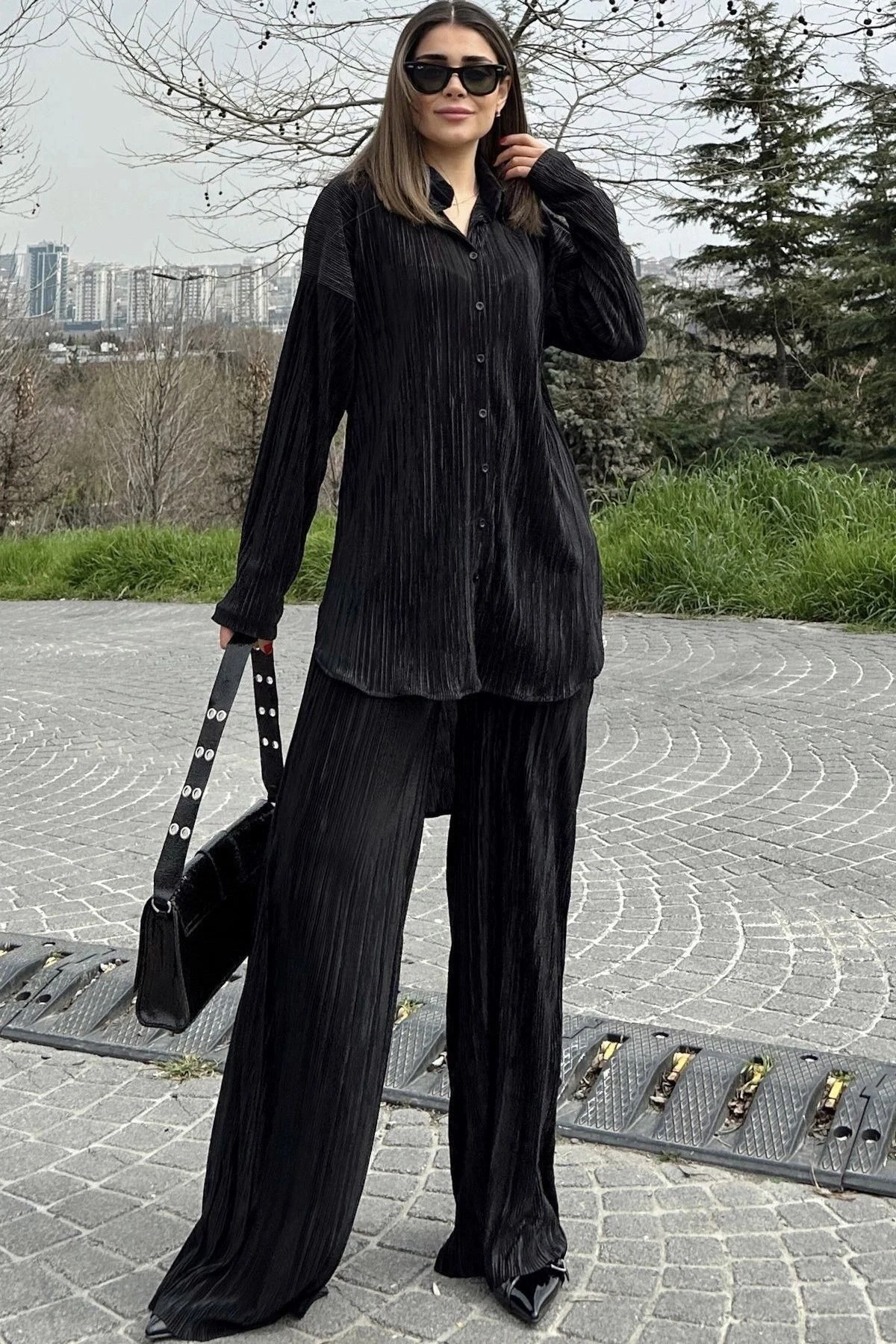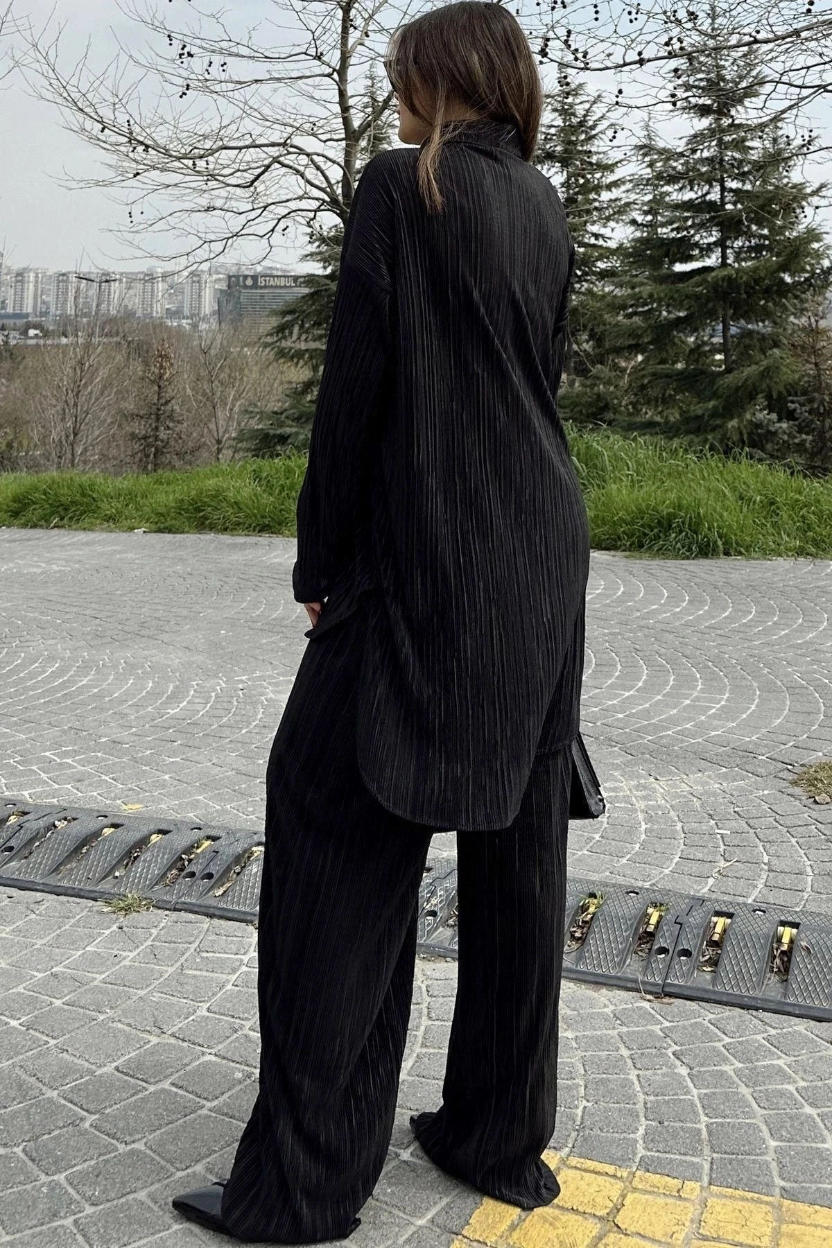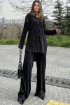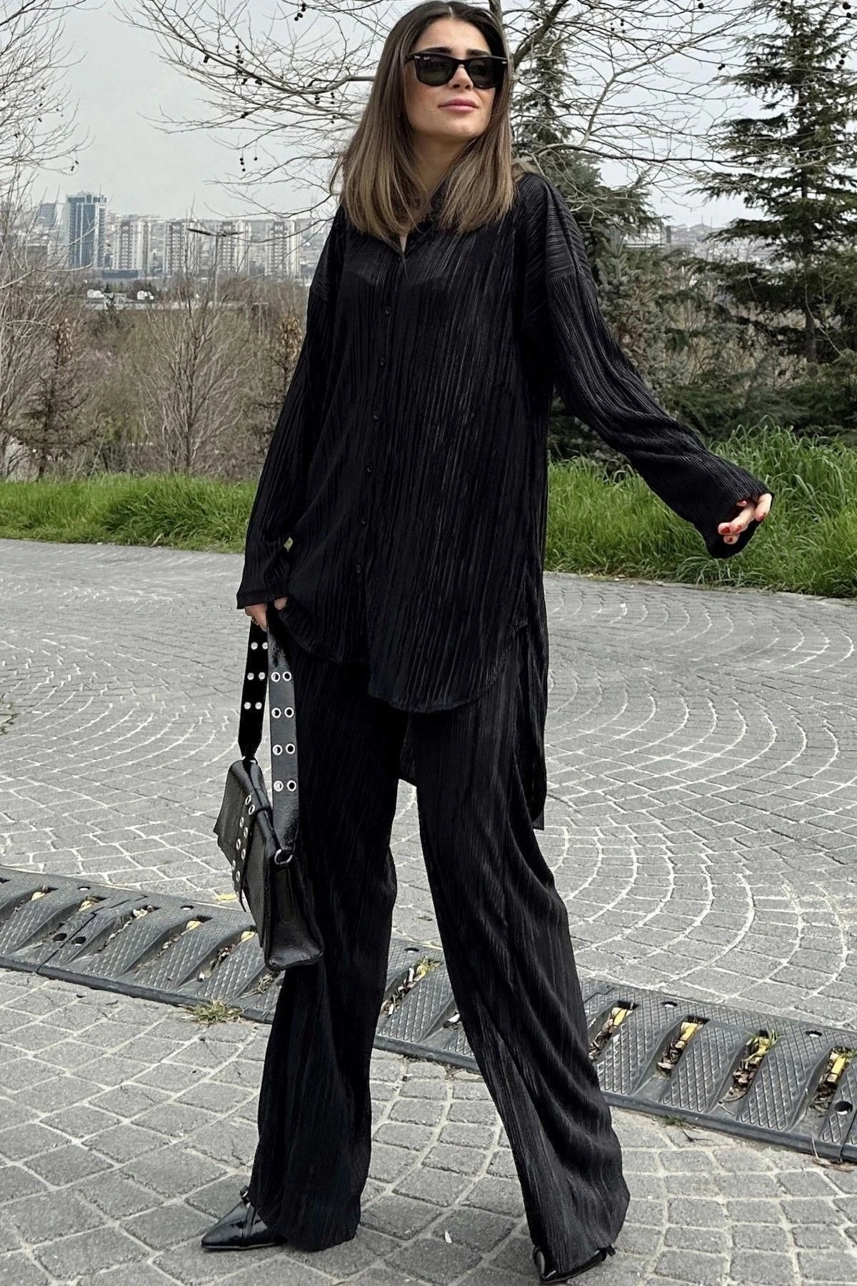 Kadın Siyah Uzun Tunik Gömlek & Beli Lastikli, Bol Paça Pantolon - Salaş Bürümcük Takım