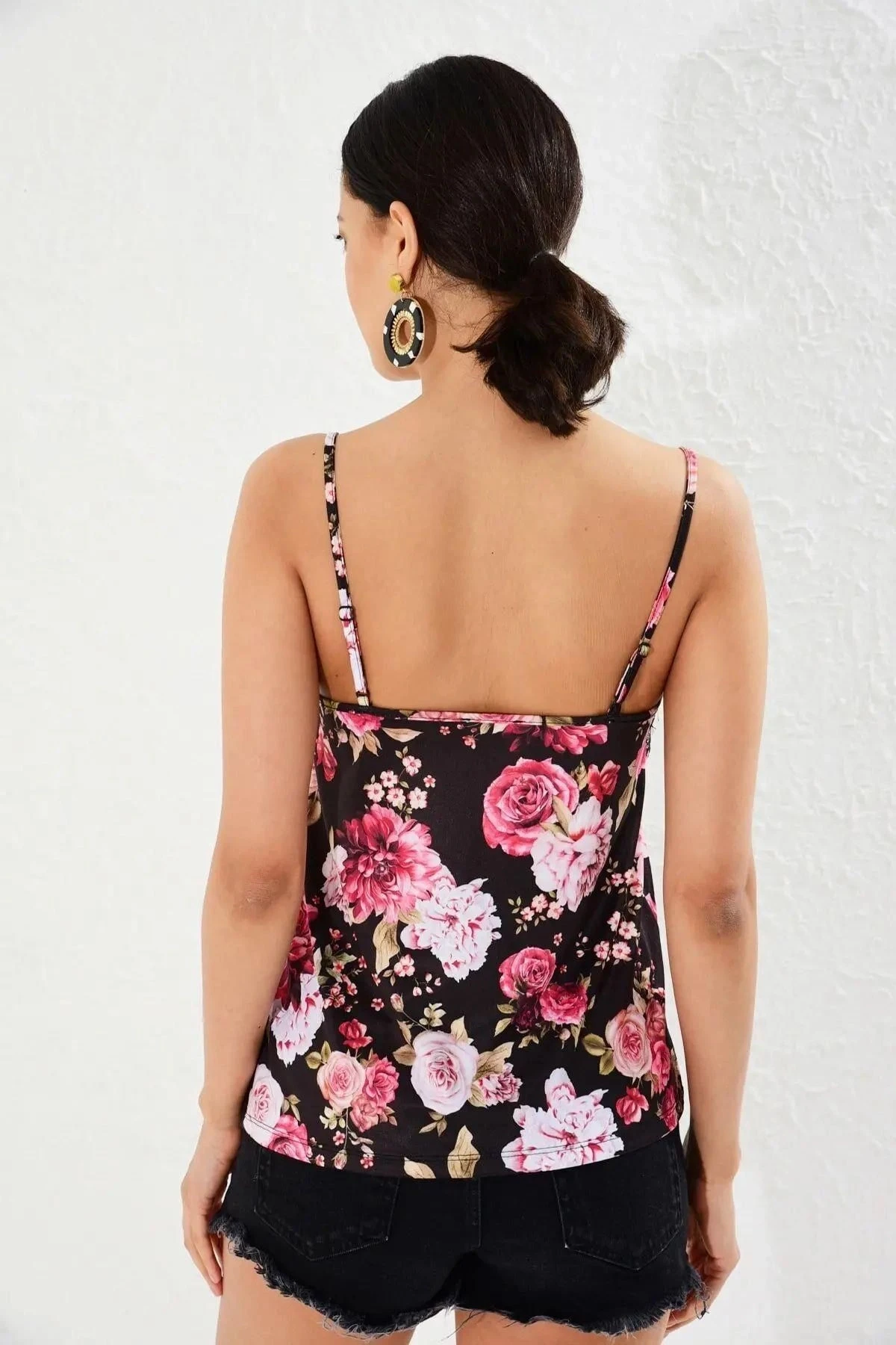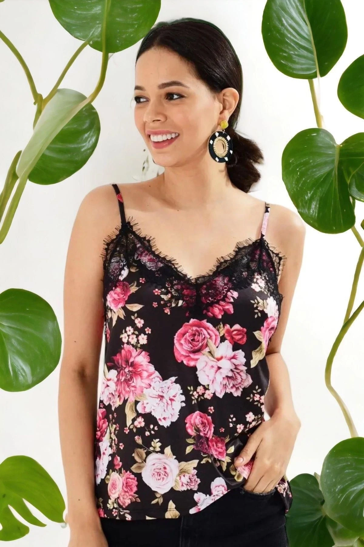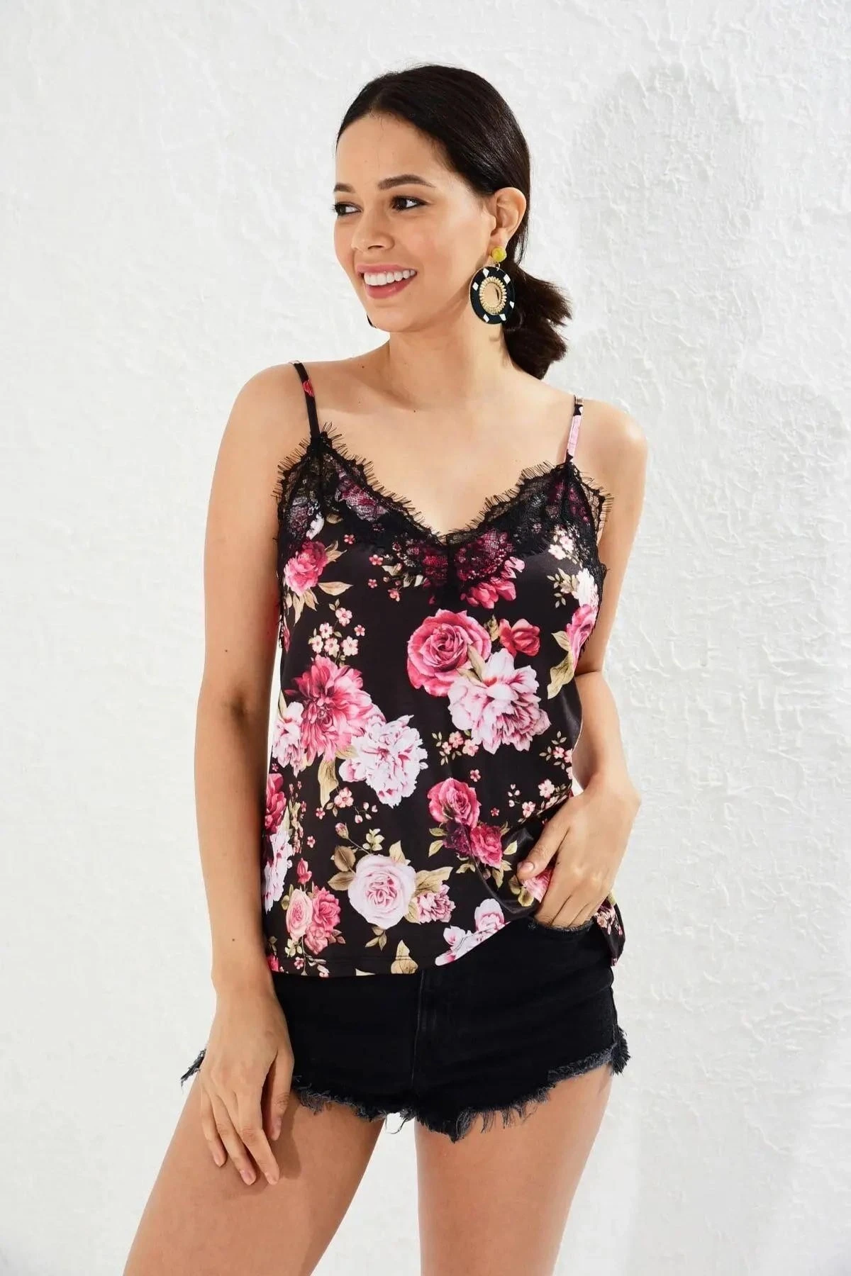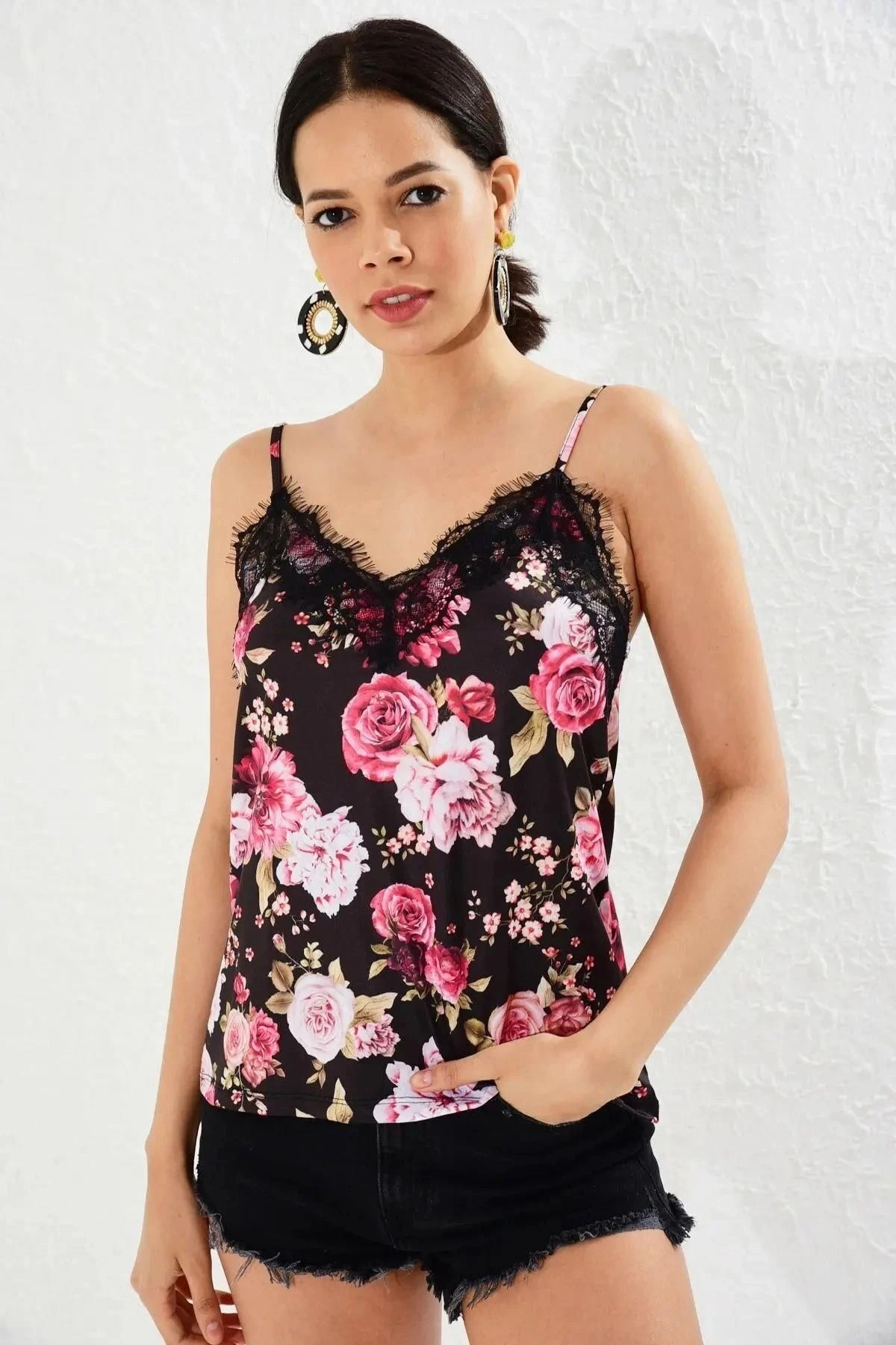 Kadın Siyah V Yaka, Çiçek Desenli, Dantel Detaylı, Askılı Kol Regular Kesim Standart Boy Bluz.