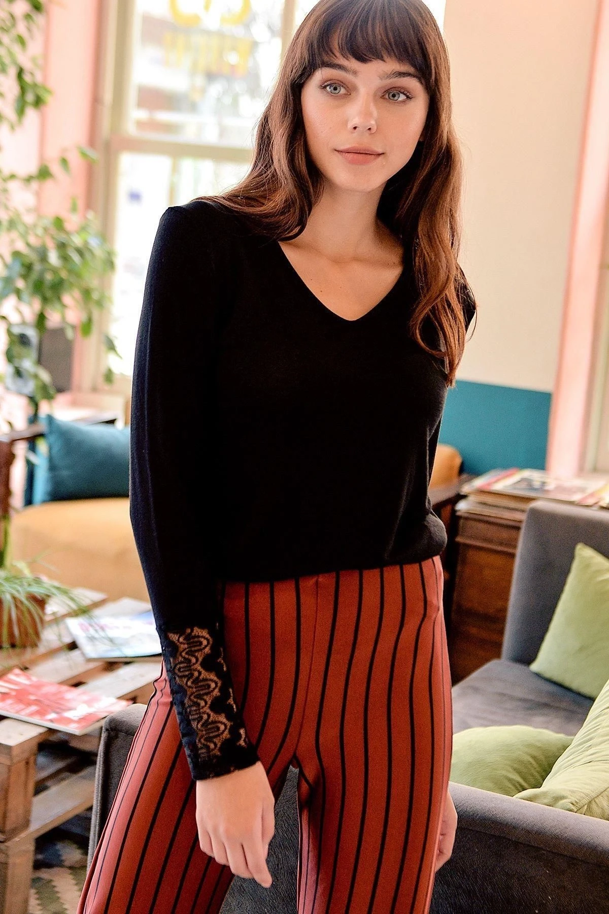 Şık ve zarif bir seçenek arayanlara özel olarak tasarlanan Siyah Renk V Yaka Dantel Detaylı Uzun Kol Regular Kesim Standart Boy Bluz, gardırobunuza sofistike bir dokunuş katacak.; Bu bluz, kusursuz bir uyum için özenle tasarlanmıştır ve her bedene mükemmel şekilde oturur.; Kumaş içeriği, %95 polyester ve %5 elastan karışımıdır.; Bu, bluzun dayanıklı ve esnek olmasını sağlar.; Polyester, kumaşa yumuşak bir doku ve pürüzsüz bir görünüm katar, elastan ise esneklik ve hareket özgürlüğü sunar.; Bu kombinasyon, rahatlık ve şıklığı bir araya getirir.; Bluzun rengi siyahtır, bu da ona zamanın ötesinde bir şıklık ve zarafet kazandırır.; Siyah, her mevsim ve her ortam için uygun olan klasik bir renktir.; Bluzun V yakası, boyun bölgesindeki zarif detayları ortaya çıkarır ve stilinizi vurgular.; Dantel detaylar, bluza zarif bir dokunuş katar.; Bu ince ve zarif dantel işlemeleri, bluzun şıklığını ve feminen havasını artırır.; Dantel detaylar, bluzu daha çekici ve özel kılar.; Uzun kollu tasarımı, bluzu çok yönlü hale getirir.; Bu bluzu tek başına veya ceket, hırka veya yelekle kombinleyebilirsiniz.; Farklı stillere kolayca uyum sağlar ve herhangi bir şık veya gündelik görünüm için mükemmel bir seçenektir.; Standart boy kesimi, bluzun her bedende mükemmel bir şekilde oturmasını sağlar.; Bu bluz, rahat ve şık bir görünüm arayan her kadının gardırobuna mükemmel bir ek olacaktır.; Siyah Renk V Yaka Dantel Detaylı Uzun Kol Regular Kesim Standart Boy Bluz, kaliteli kumaşı, zarif tasarımı ve şık detaylarıyla dikkat çeken bir seçenektir.; Bu bluzu giydiğinizde, tarzınızı ön plana çıkaracak ve herhangi bir ortamda güvenle şıklığınızı sergileyeceksiniz.
